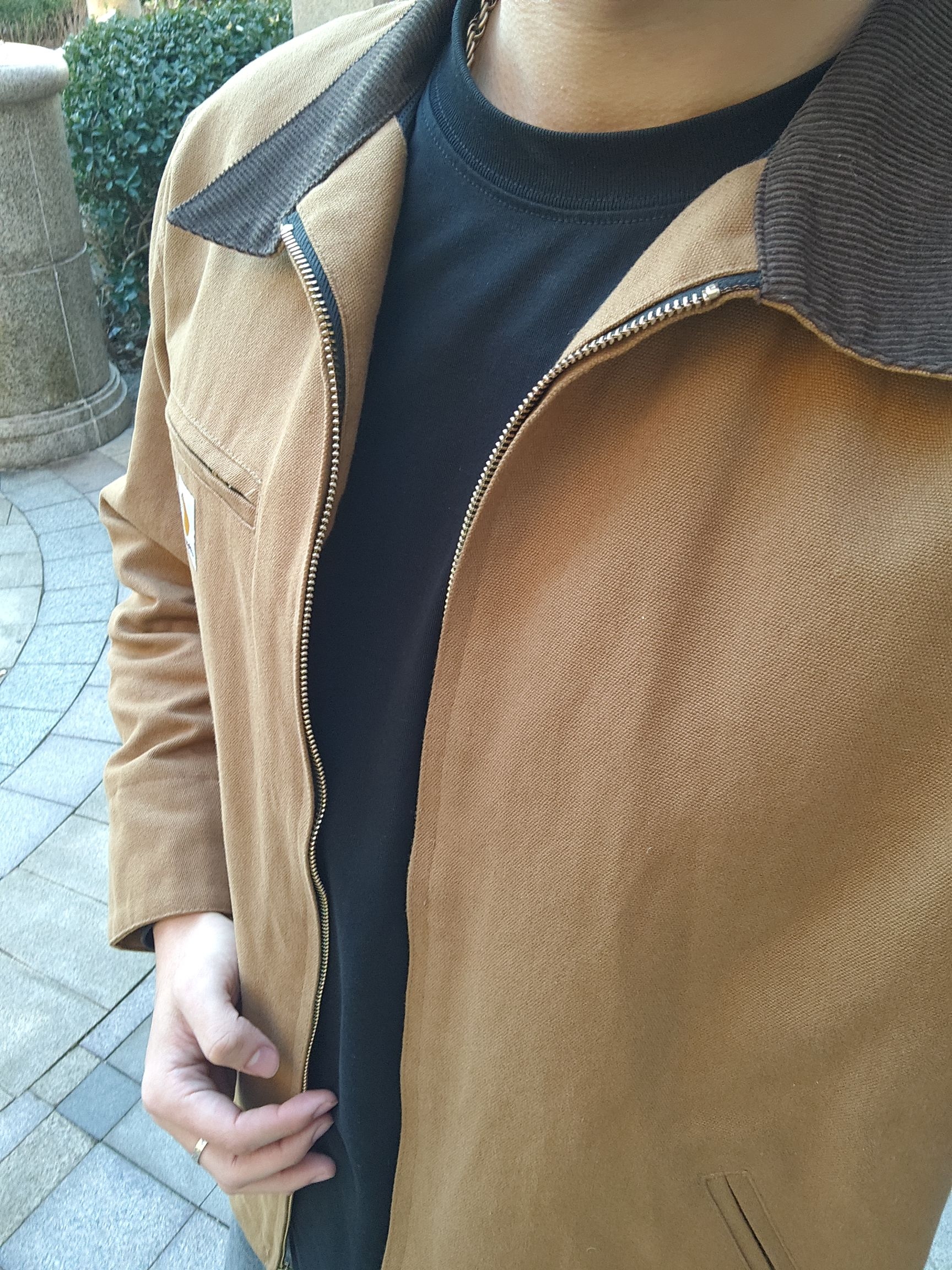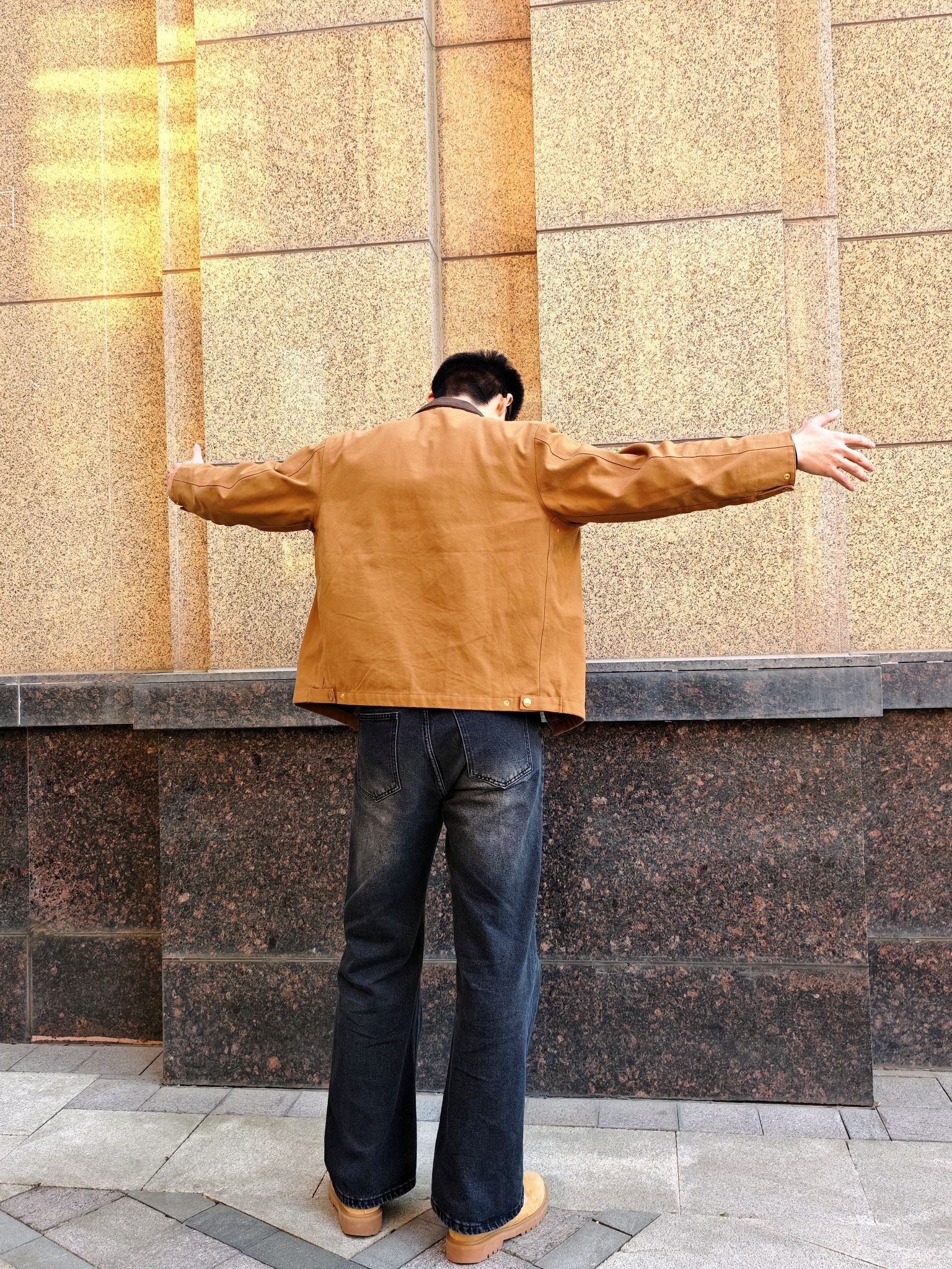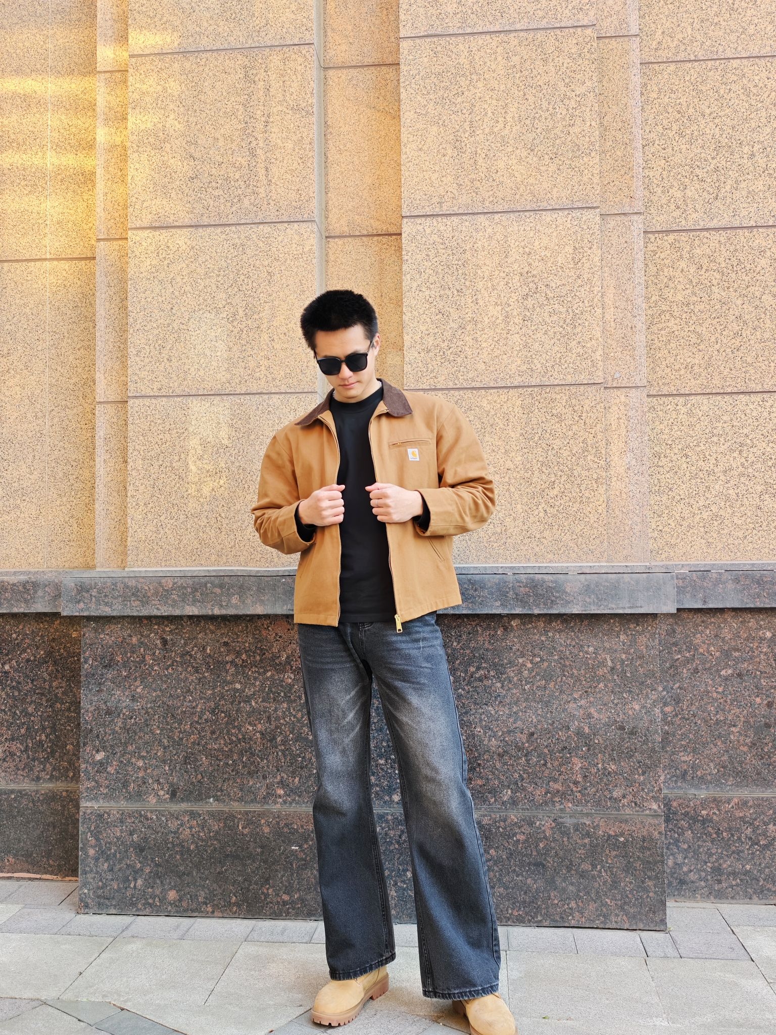 这套穿搭把美式复古感拉满了!Carhartt底特律夹克是核心,卡其色帆布+撞色灯芯绒领,耐磨又有质感,胸口小标低调彰显工装血统,硬挺版型还能修饰肩线,秒变直角肩。 内搭黑色基础T恤,简约又能中和外套的厚重感;下身选深灰阔腿牛仔裤,垂坠感优秀,藏肉显瘦还能拉长腿部线条,和外套的硬朗感形成柔和对比。 脚踩大黄靴,完成工装风的灵魂闭环,增高又显利落。墨镜加持让整体更有酷感,整套从通勤到出街都适配,是男生...