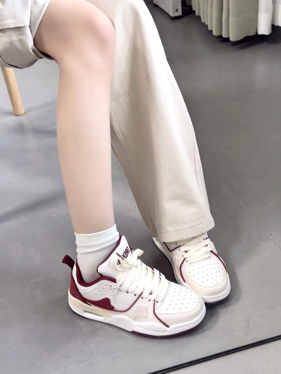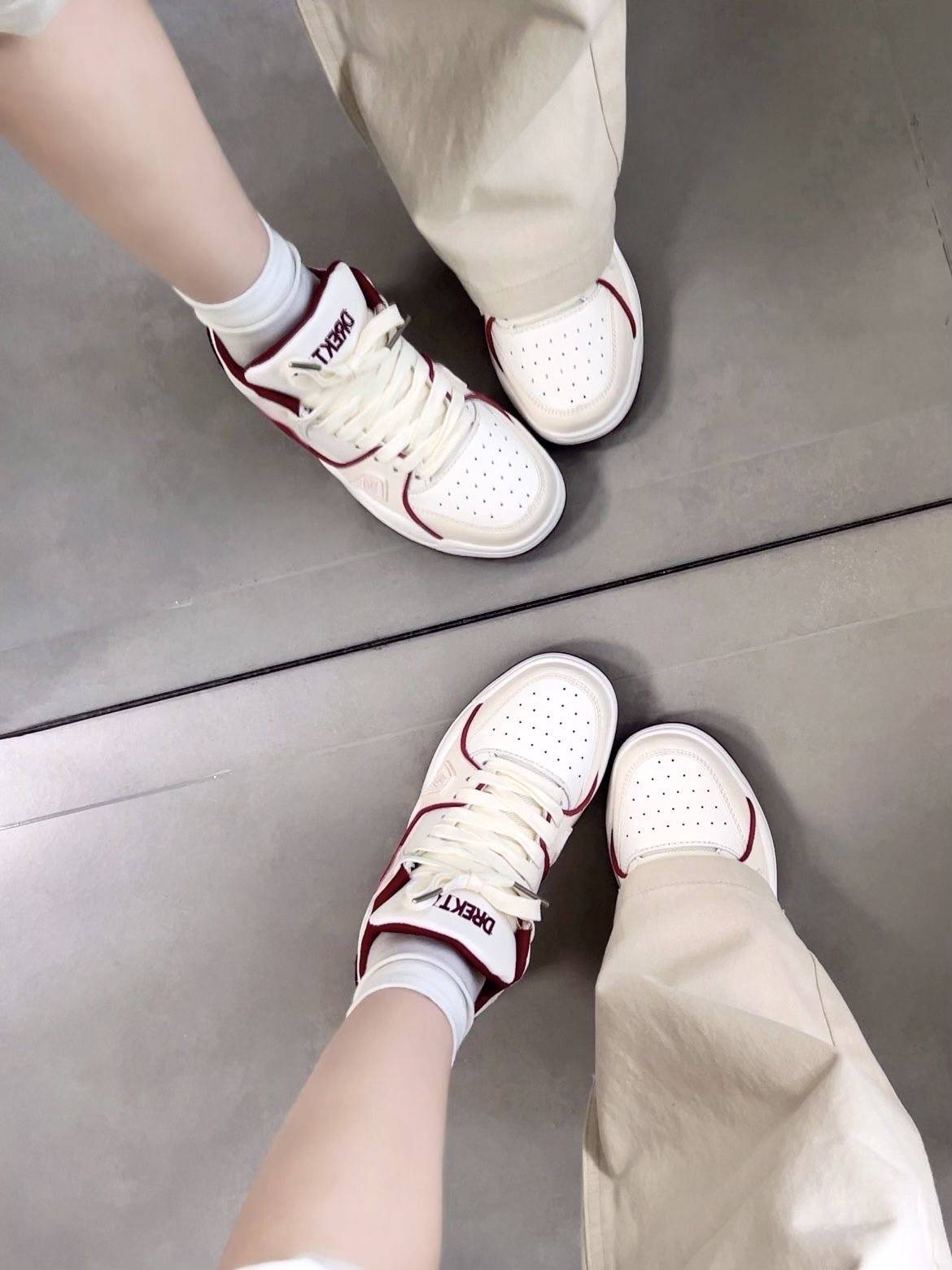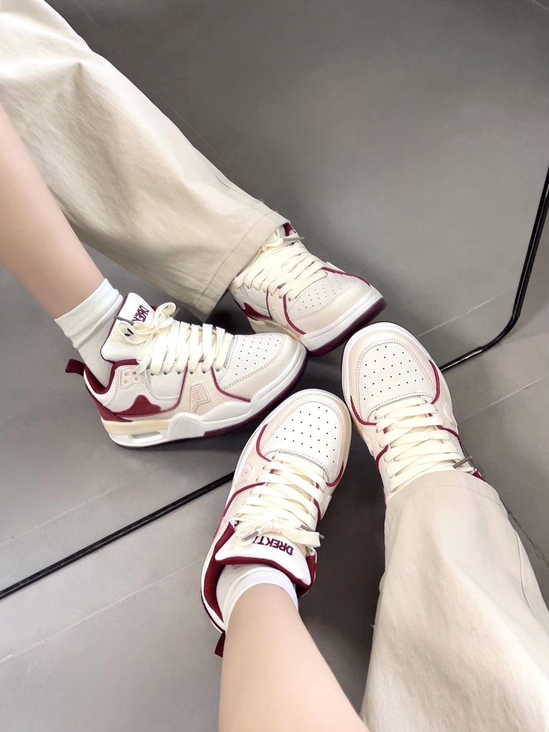 谁懂啊!挖到这双鞋,奶白+复古红撞色,像咬了一口草莓奶冻,甜酷感直接拉满! 荔枝纹皮面+网布拼接,耐脏又透气,日常通勤/上学随便造都不心疼~ 侧边立体线条+后跟气垫设计,颜值和脚感双在线 上脚软乎乎像踩棉花,缓震超舒服,逛一天街都不磨脚,配牛仔裤、工装裤、百褶裙都巨百搭,美式复古氛围感直接焊在身上!