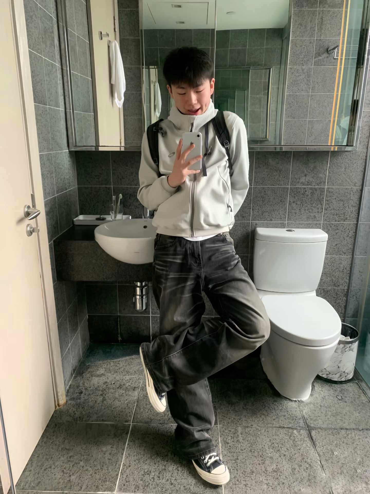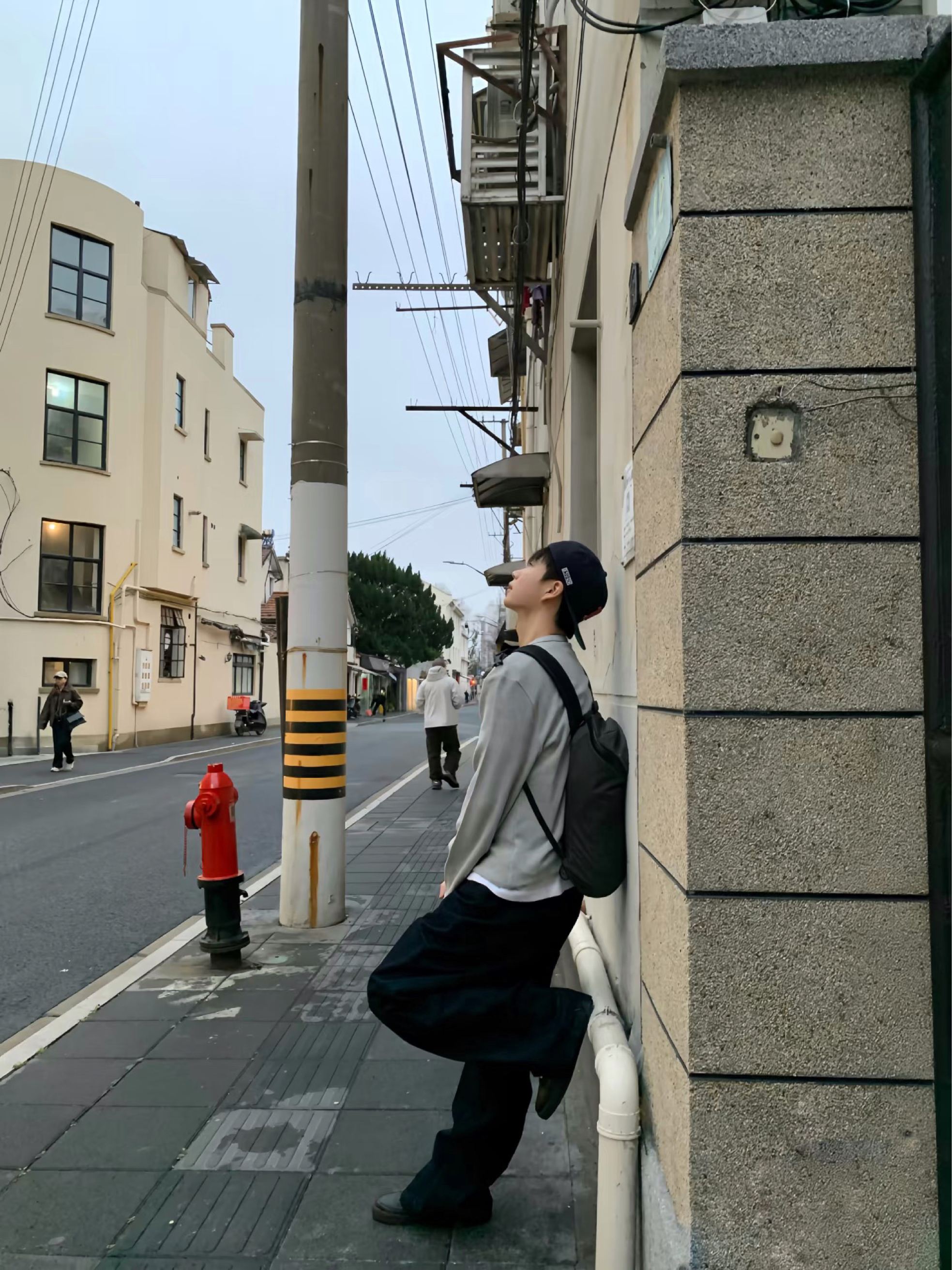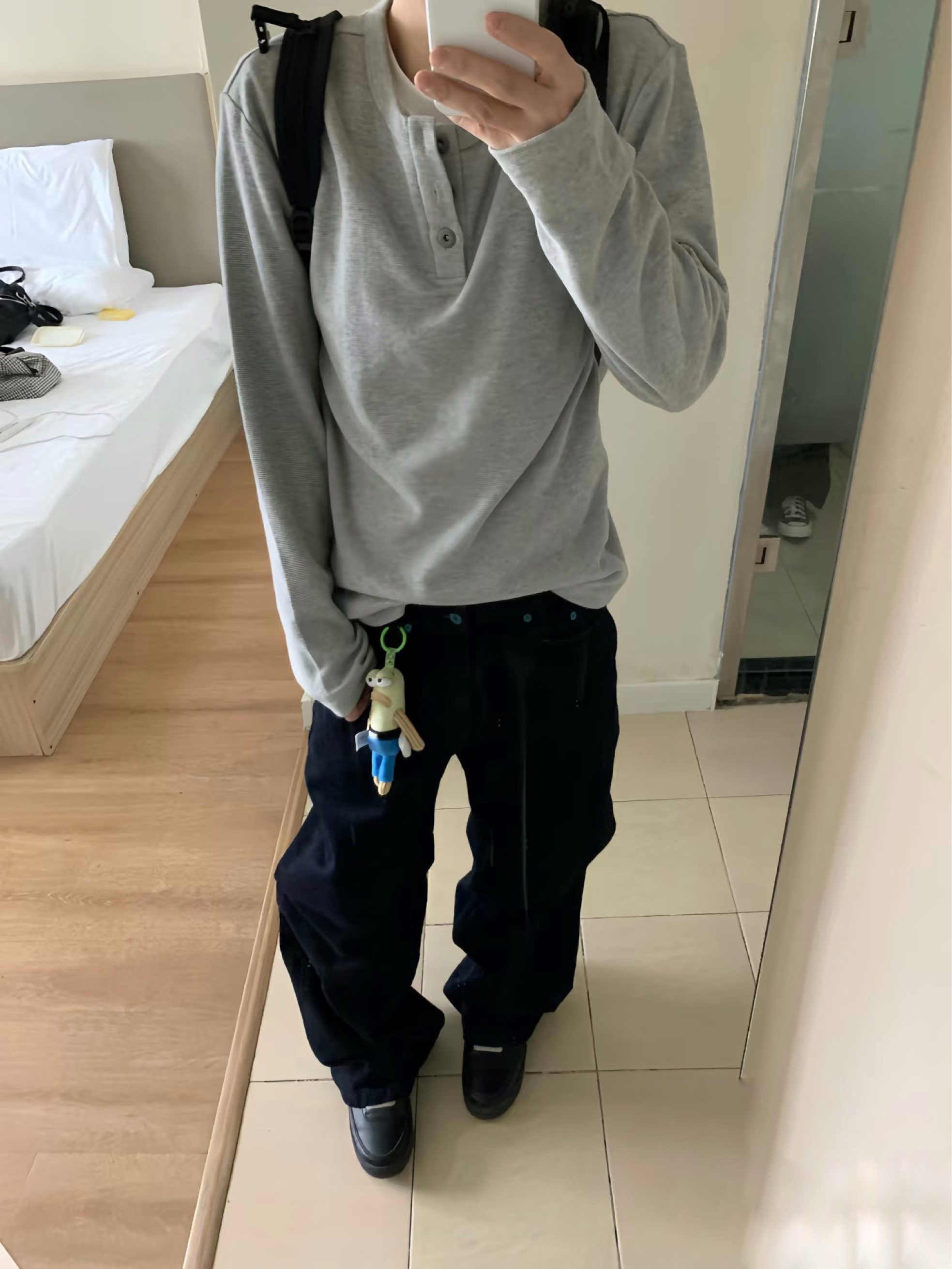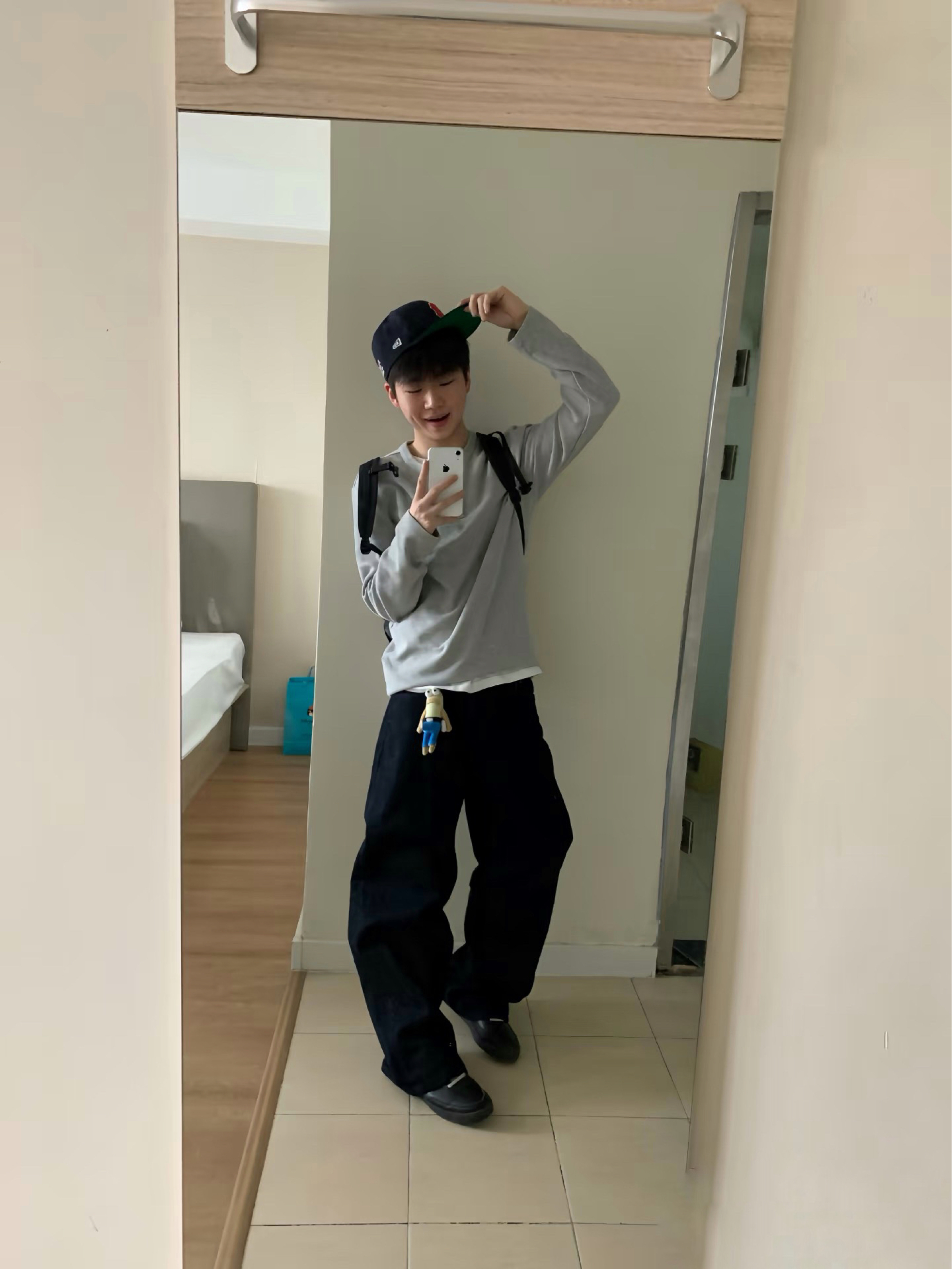 这套松弛感穿搭太适合通勤和citywalk啦!浅灰色亨利领长袖打底,叠穿白边下摆,低调又有层次;搭配藏青色阔腿牛仔裤,藏肉显腿长,对微胖身材很友好。 反戴棒球帽+黑色双肩包,再挂个可爱挂件点缀细节,脚踩黑鞋呼应整体,慵懒随性又干净清爽,轻松拿捏少年感氛围~