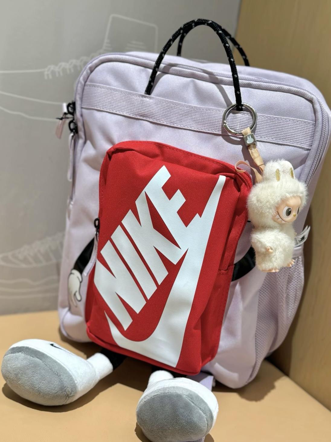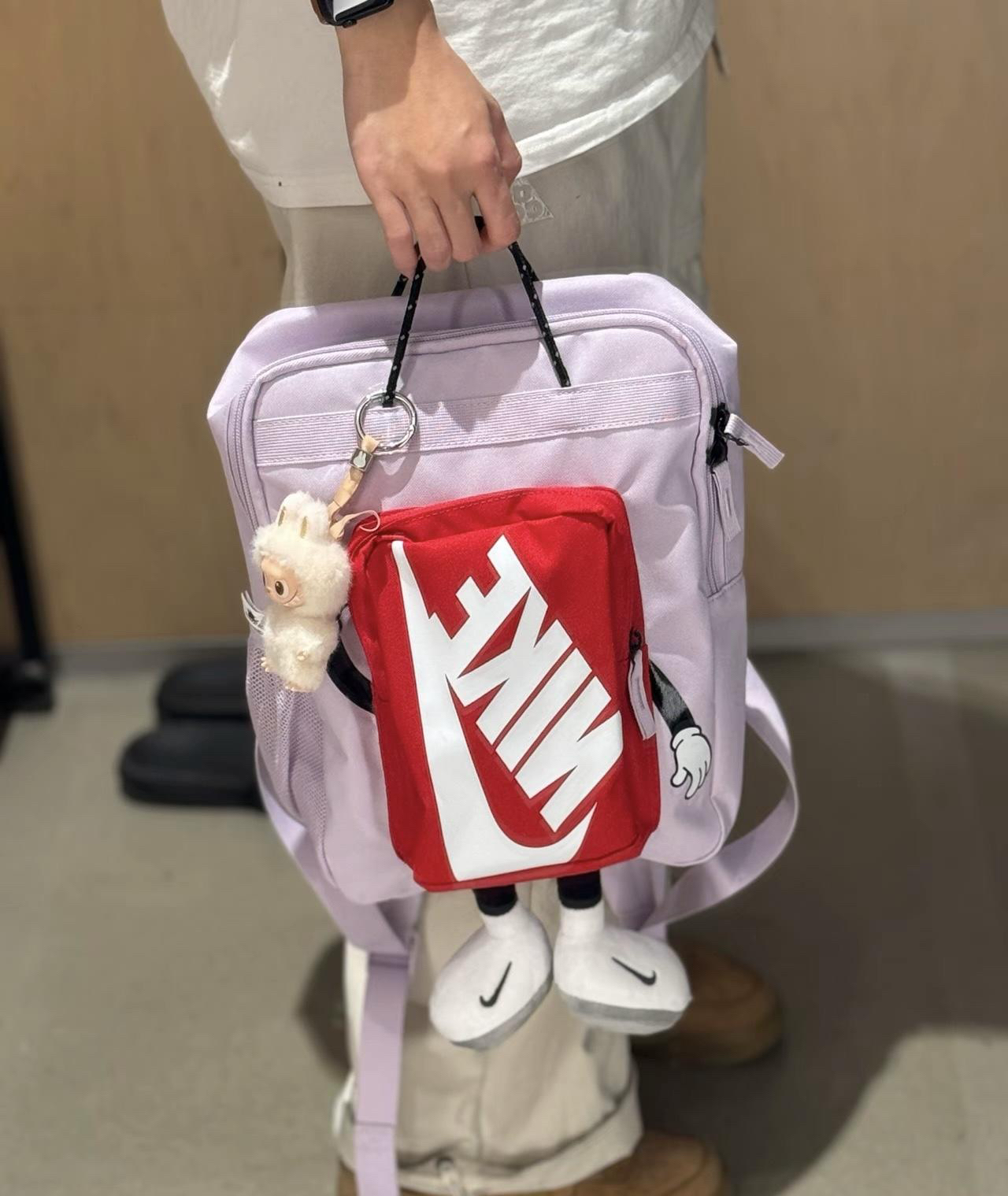 薰衣草紫色超耐看 撞色红色充满活力的感觉 下面搭配超可爱的小脚丫 我可太喜欢了 💜Nike x 米奇联名双肩包,淡紫色包身+红色前袋,白色Nike标志超吸睛!底部米奇脚丫毛绒设计,趣味满分,辨识度超高✨。