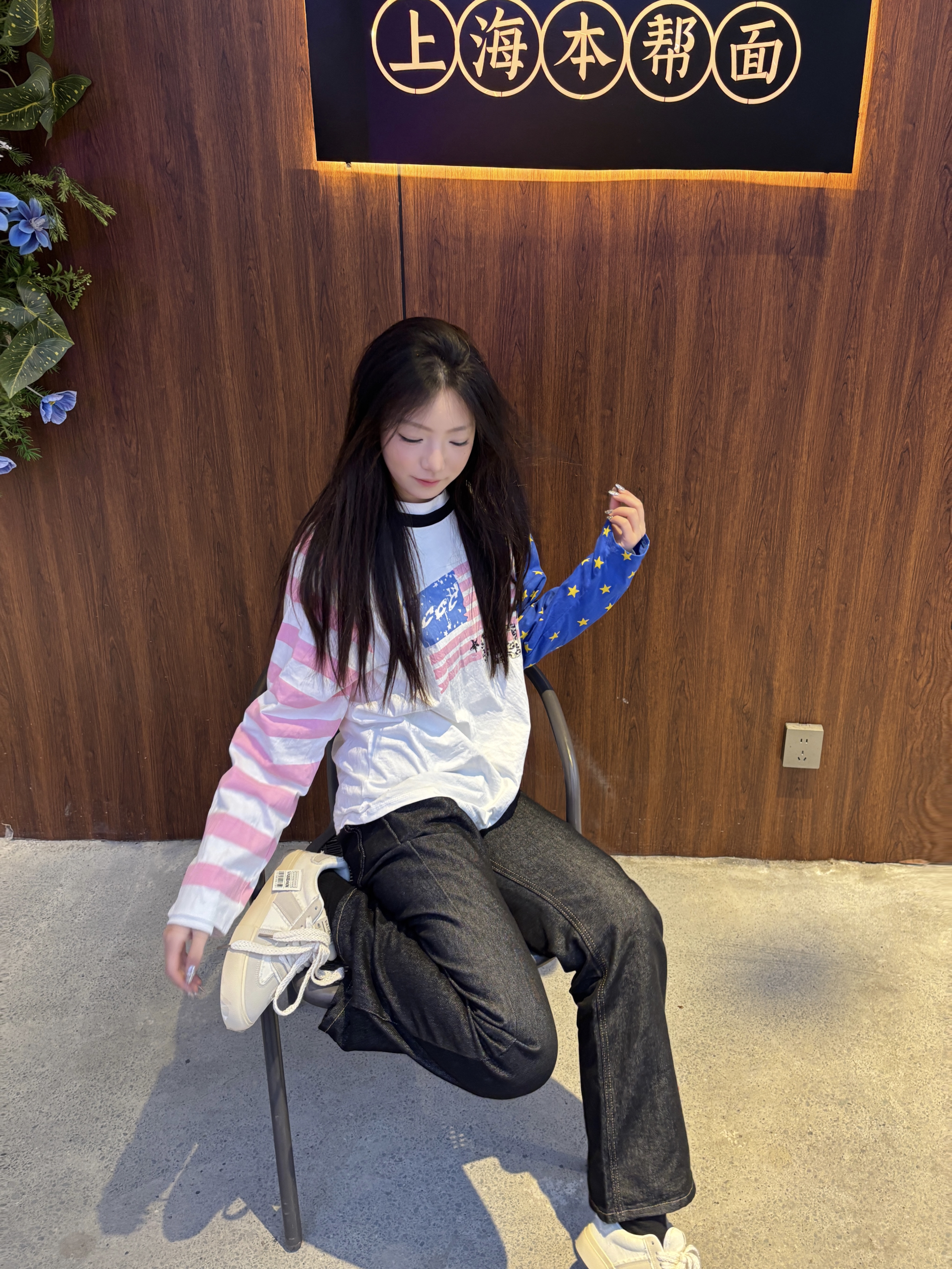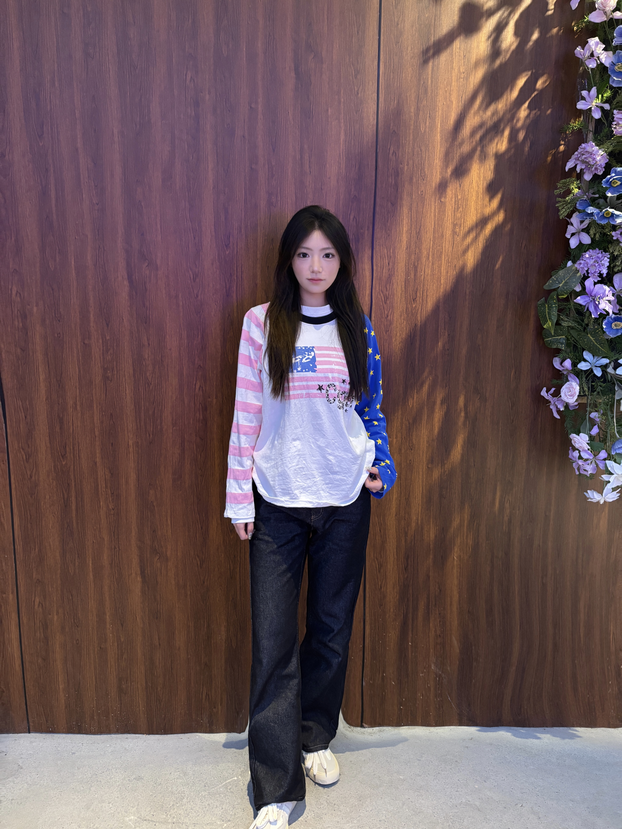 这件长袖T恤的面料是那种软软的棉感,贴身穿很舒服😌 粉蓝撞色的插肩袖设计,真的太有美式复古那味儿了💙💖 右袖是满印的黄色小星星,左袖是粉白条纹,细节感拉满✨ 胸前的做旧印花,有点随性又有点酷,不会太夸张🫶 搭配的是深灰色的直筒牛仔裤,版型很显瘦,面料偏硬挺,走路带风的感觉👖 鞋子是米白色的德训鞋,软乎乎的,走一天都不会累🥰 整体就是那种慵懒又随性的感觉,日常出街或者探店都很合适,随便拍拍都很出片📸...