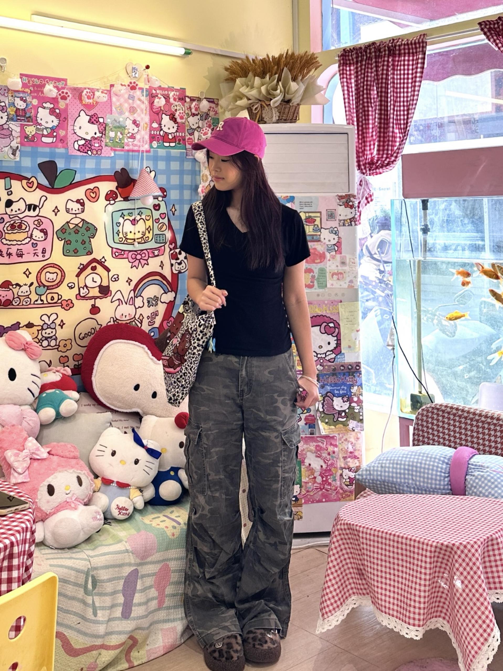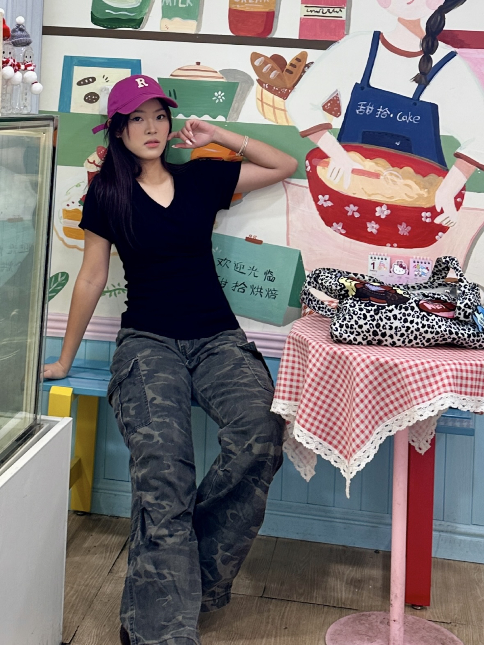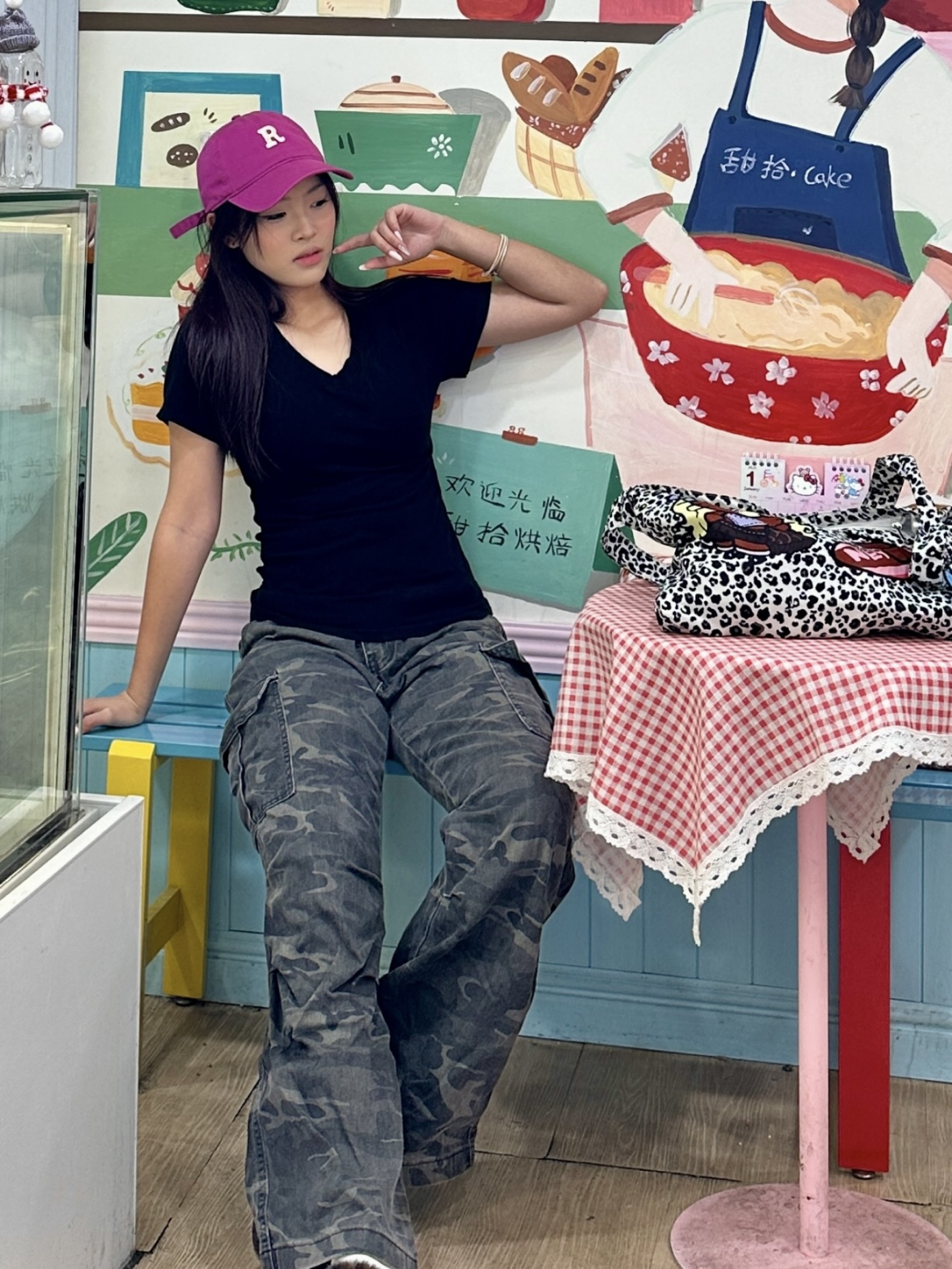 基础款修身版型,微V领设计拉长颈部线条,显瘦又带点小性感,是百搭的打底单品,能平衡下装的厚重感。 灰绿色迷彩印花自带街头感,多口袋工装设计增加了机能感,阔腿版型修饰腿型、藏肉显瘦,是美式复古风的核心单品,和甜妹风的配饰形成反差感。