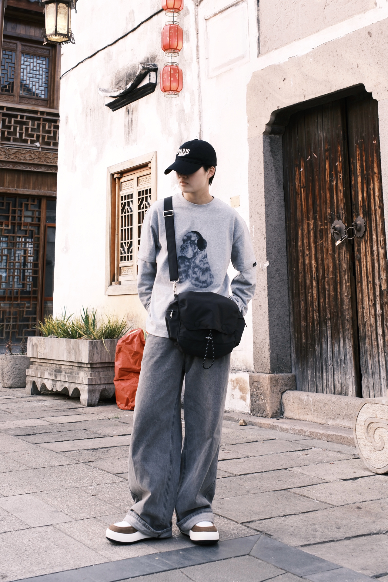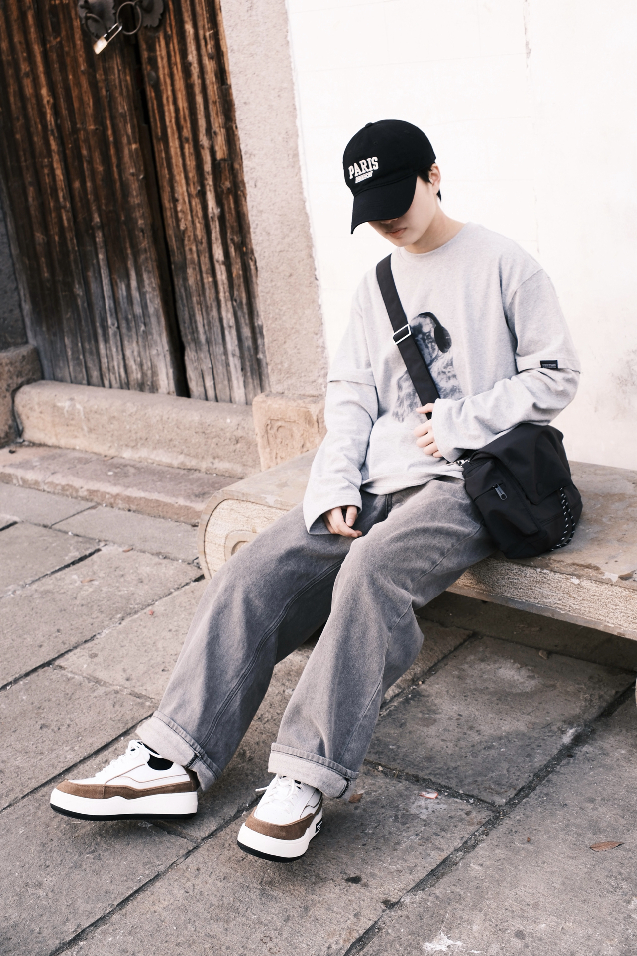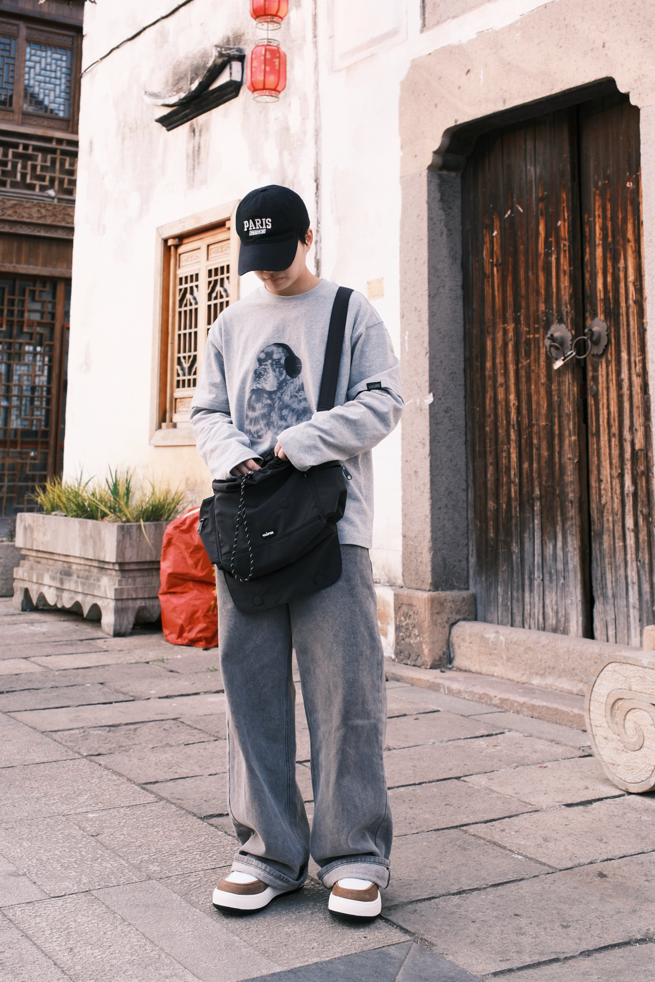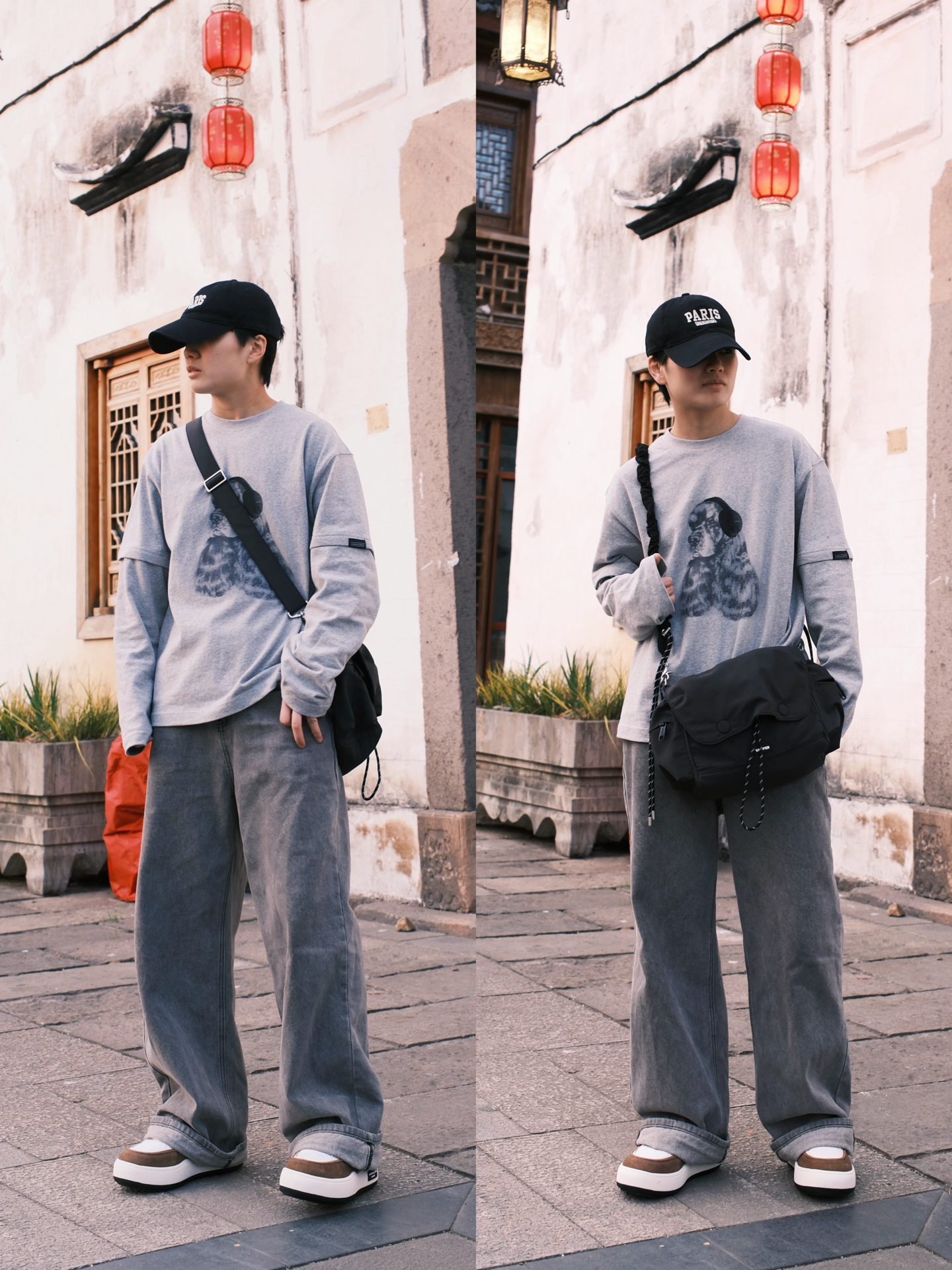 ☝🏻一个周末的午后 踩着碎光钻进江南的老巷 不想穿得太刻意🙅 就用一身灰调的松弛感🩶 浅灰的假两件长袖带小狗印花 🤔斜挎包是这次出门的默契搭档 黑色尼龙面料摸起来扎实又轻便 翻盖设计带着日系简约感 两款肩带自由选择搭配👻 板鞋是整套穿搭的点睛之笔 白棕拼色刚好和灰调衣裤形成对比 麂皮与皮革的拼接让质感升级 厚底设计悄悄增高了几厘米 其实穿搭从来不是为了迎合谁 而是在日常里找到自己最舒服状态 👜:...