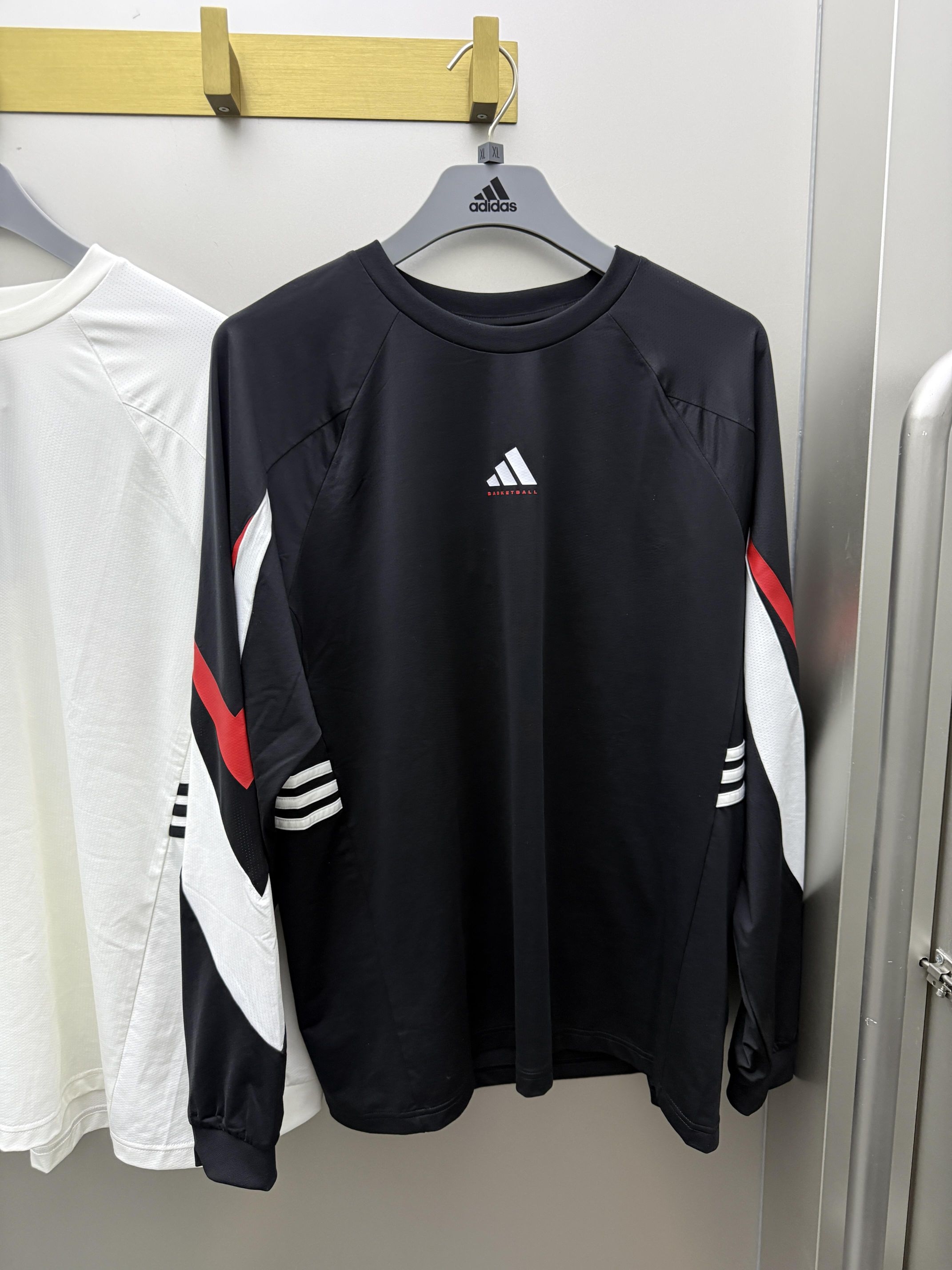 👕 上衣:adidas IA8935 - 经典黑底+红白撞色拼接,视觉冲击力拉满,棣棣同款版型宽松不挑身材 - 透气网眼面料,打球时不闷汗,日常穿也很舒服 - 胸前小logo低调有质感,袖子的条纹设计自带运动氛围感