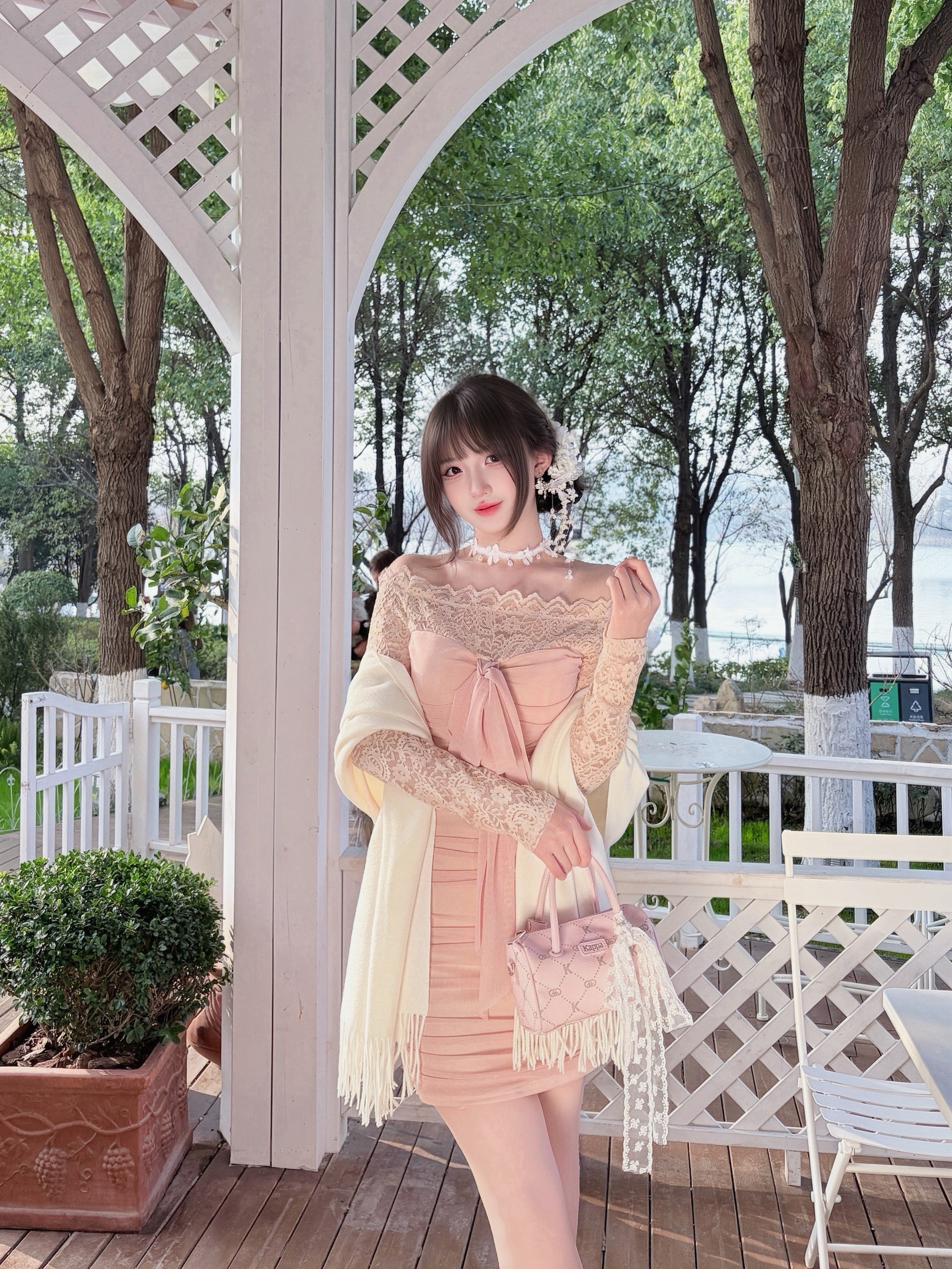 裸粉色💖一字肩蕾丝裙➕奶油白围巾 搭配baby粉枕头包➕同色系高跟鞋 上身温温柔柔的🐰 特别高级显气质呀✨ 这个枕头包是我最近的心头爱🥰🥰 软软糯糯的配色 少女心满满的!! 搭配小裙子🎀牛仔裤都特别好看呀 真的很喜欢这种百搭的高颜值单品💕✨