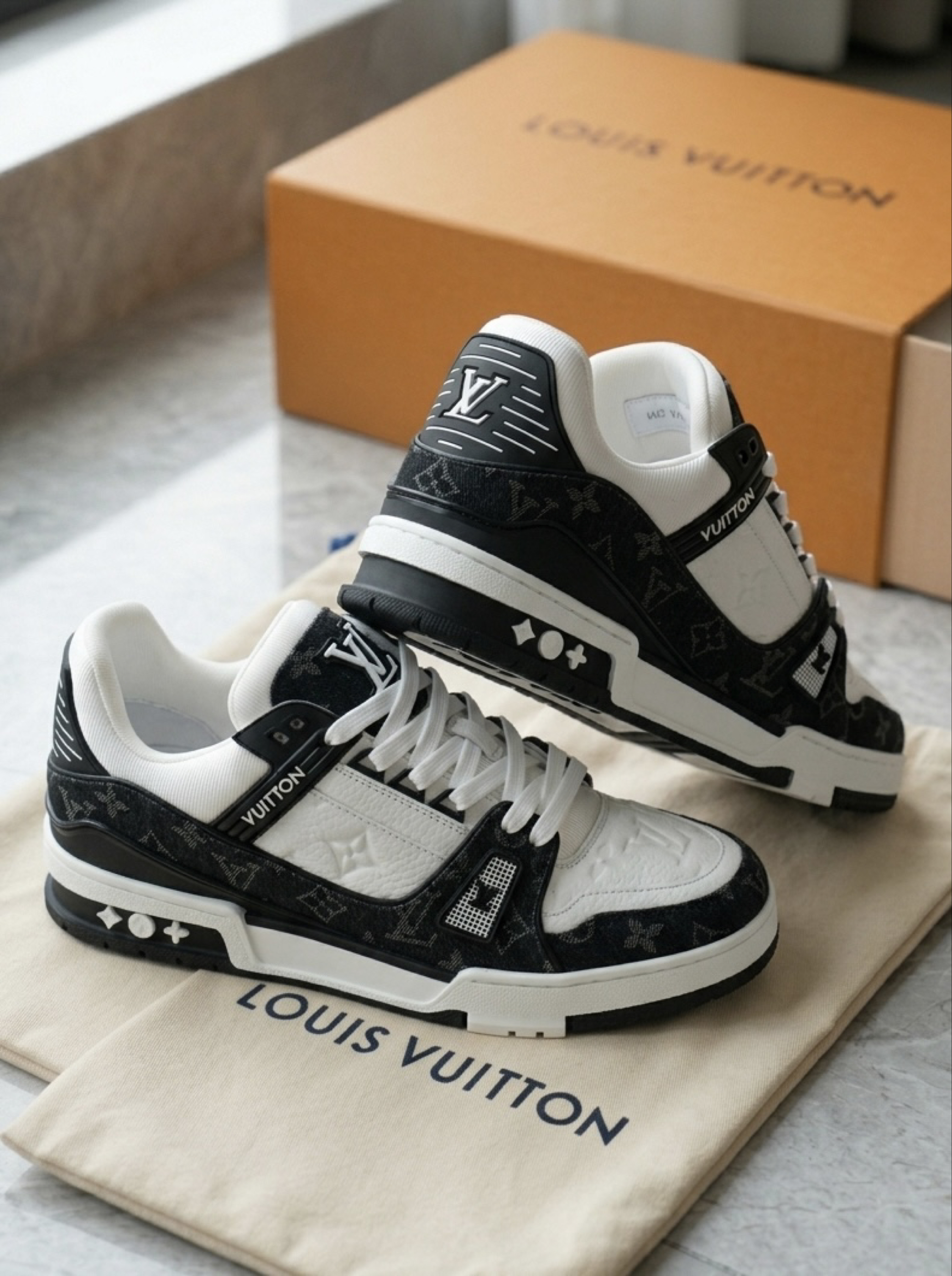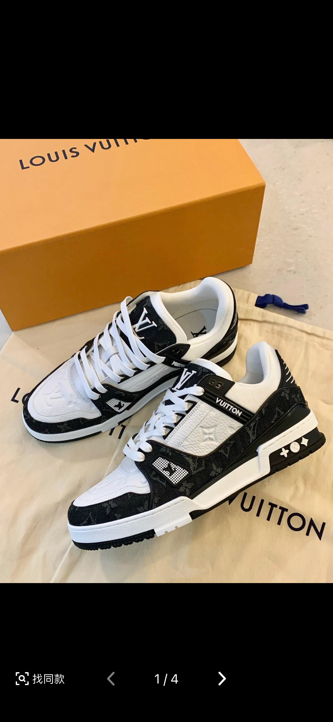 这双LV Trainer熊猫款,我纠结小半个月才下手的。一开始觉得黑白配色会不会太单调,上脚之后才发现是真的耐看不挑人。 鞋身是压纹皮革和牛仔老花的拼接,细节做得挺细的,摸起来质感也够,不会显得廉价。鞋型是偏利落的板鞋款,码数很正,包裹感够但不挤脚,日常逛个街走久了也没觉得累脚。 平时搭直筒牛仔裤或者束脚卫裤都好看,黑白配色也不用费脑子想搭配,通勤或者出门玩都能穿,男女同款,情侣搭情侣款也挺合...