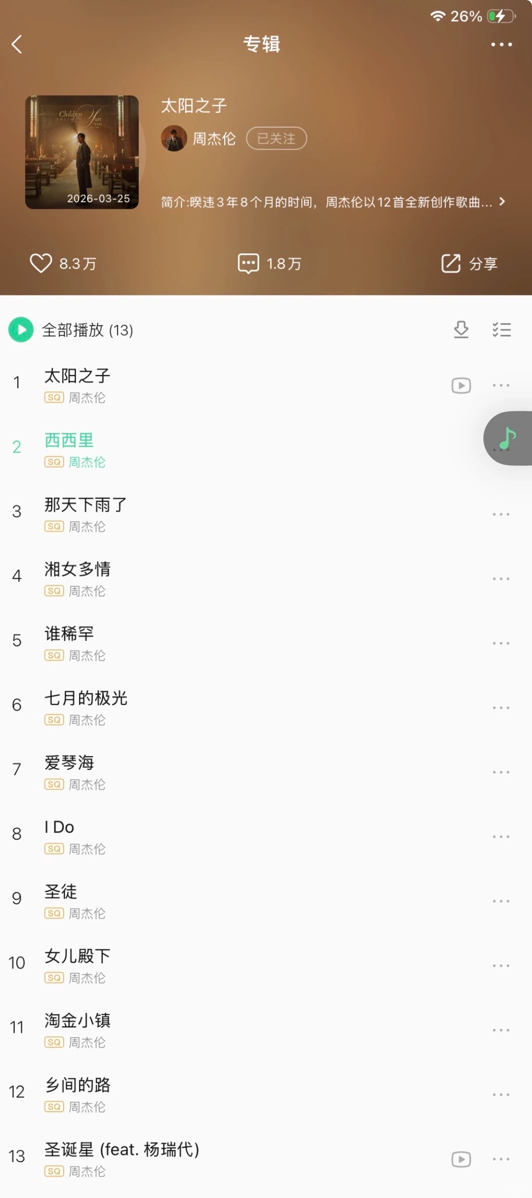 3月25日全球数字平台上线 内地版实体专辑即将公布 专辑封面取景巴黎教堂考究19世纪的陈设美术(图三) 呈现悬疑暗黑氛围 首波同名主打《太阳之子》MV即将以酷炫之姿与大家见面,这支长达6分58秒的MV充满了创意巧思,并结合精彩的动画与后期制作。杰威尔音乐将于3月24日在电影院举办全球首映会,邀请媒体与歌迷一同欣赏周杰伦的最新作品,迎接3月25日《太阳之子》专辑的全球发行。 专辑完整曲目列表(图...