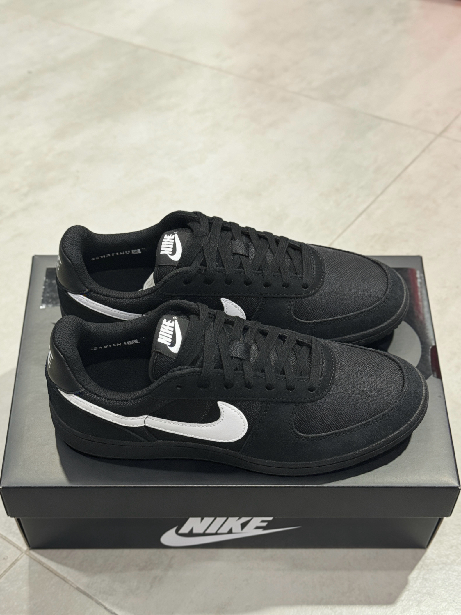 终于入手了这双Nike Field General,实物真的比图片香太多了。 ✅ 材质:翻毛皮+织物拼接,上手很有分量,不是那种轻飘飘的廉价感。 ✅ 配色:黑白经典款,巨百搭!不管是运动裤还是牛仔裤,随便一套都很显干净。 ✅ 脚感:脚感偏扎实,日常走路完全没问题,鞋底纹路抓地也稳。 性价比真的拉满了,几百块穿出千元质感,懂的都懂!👟