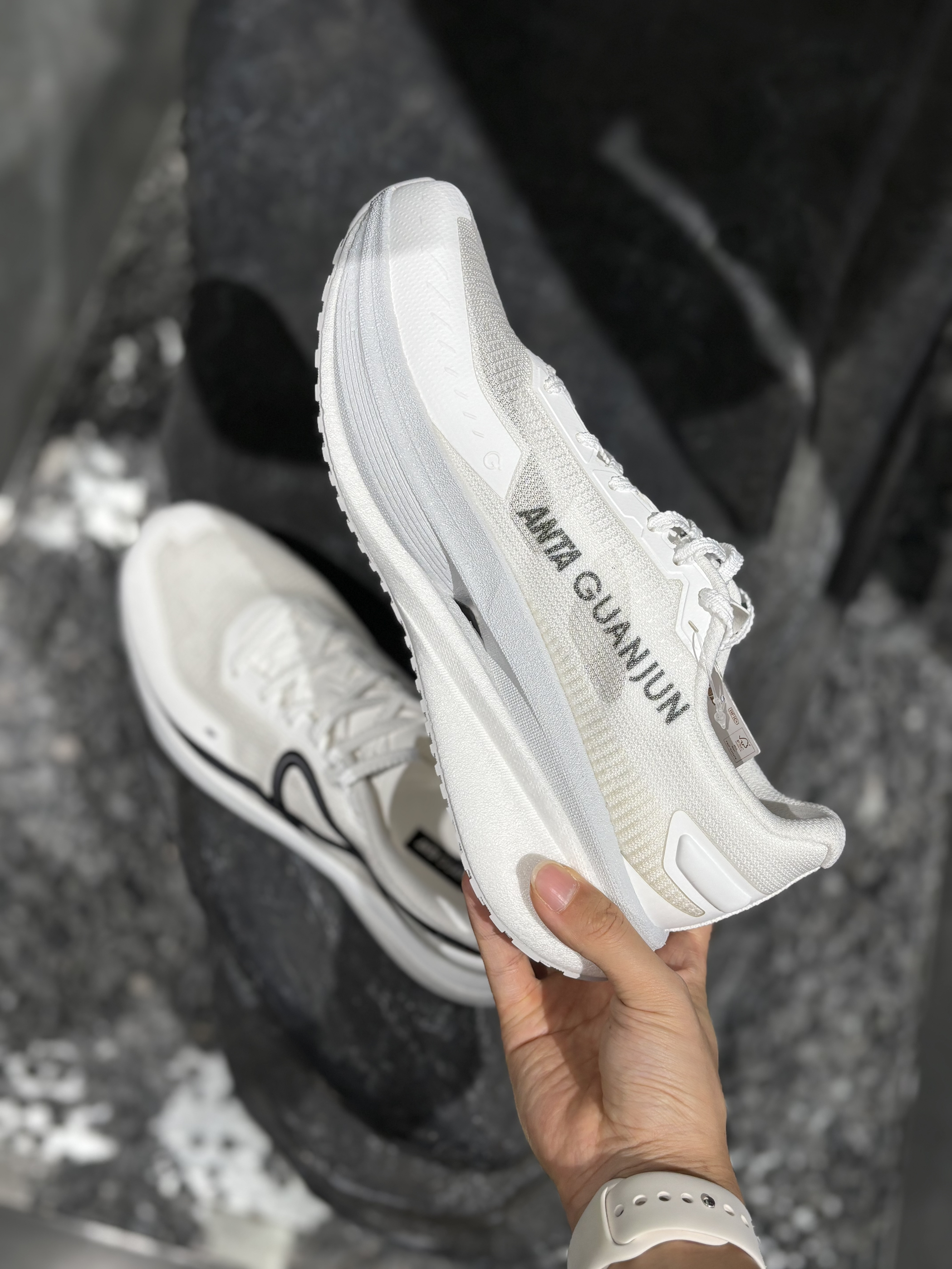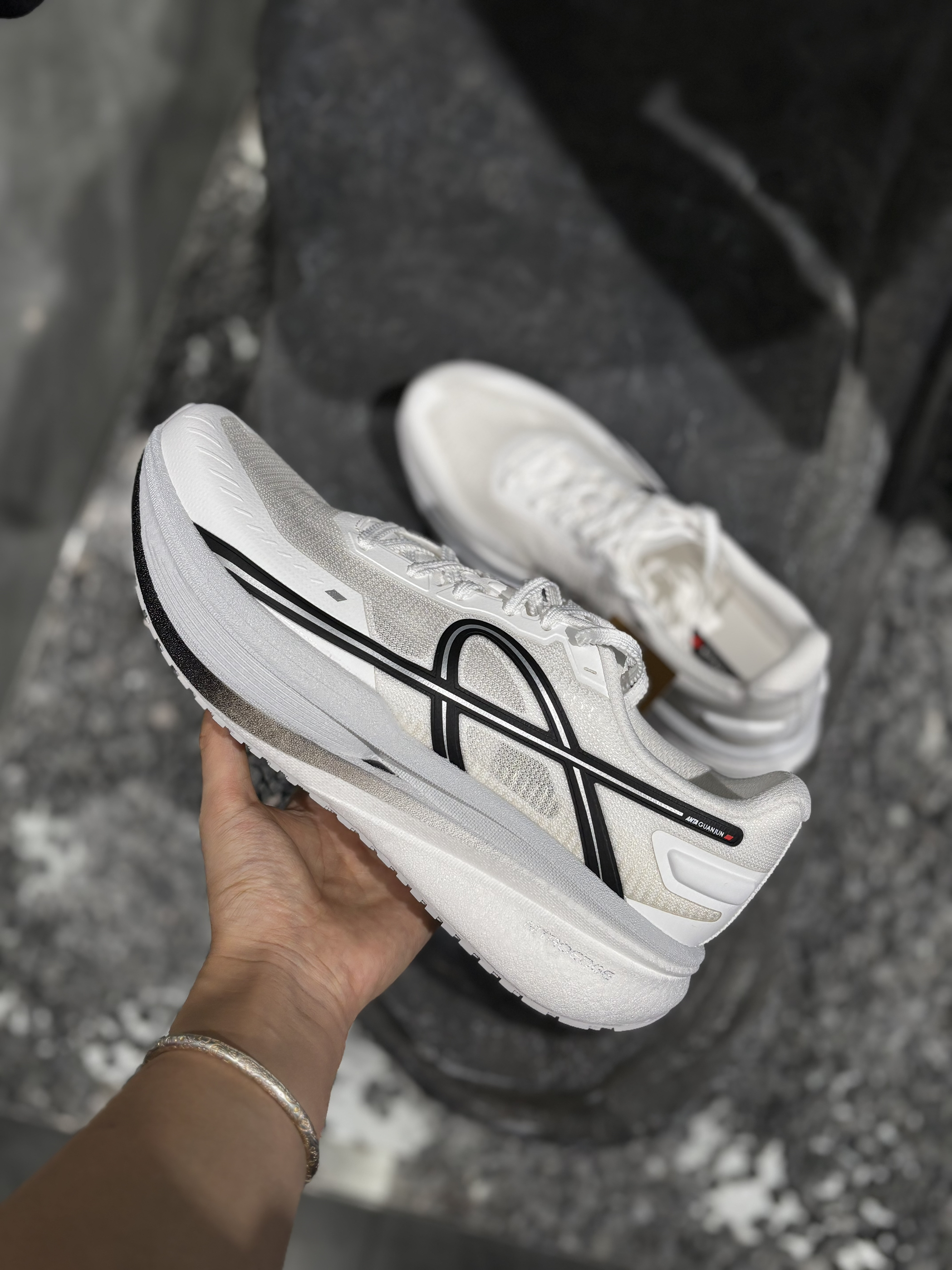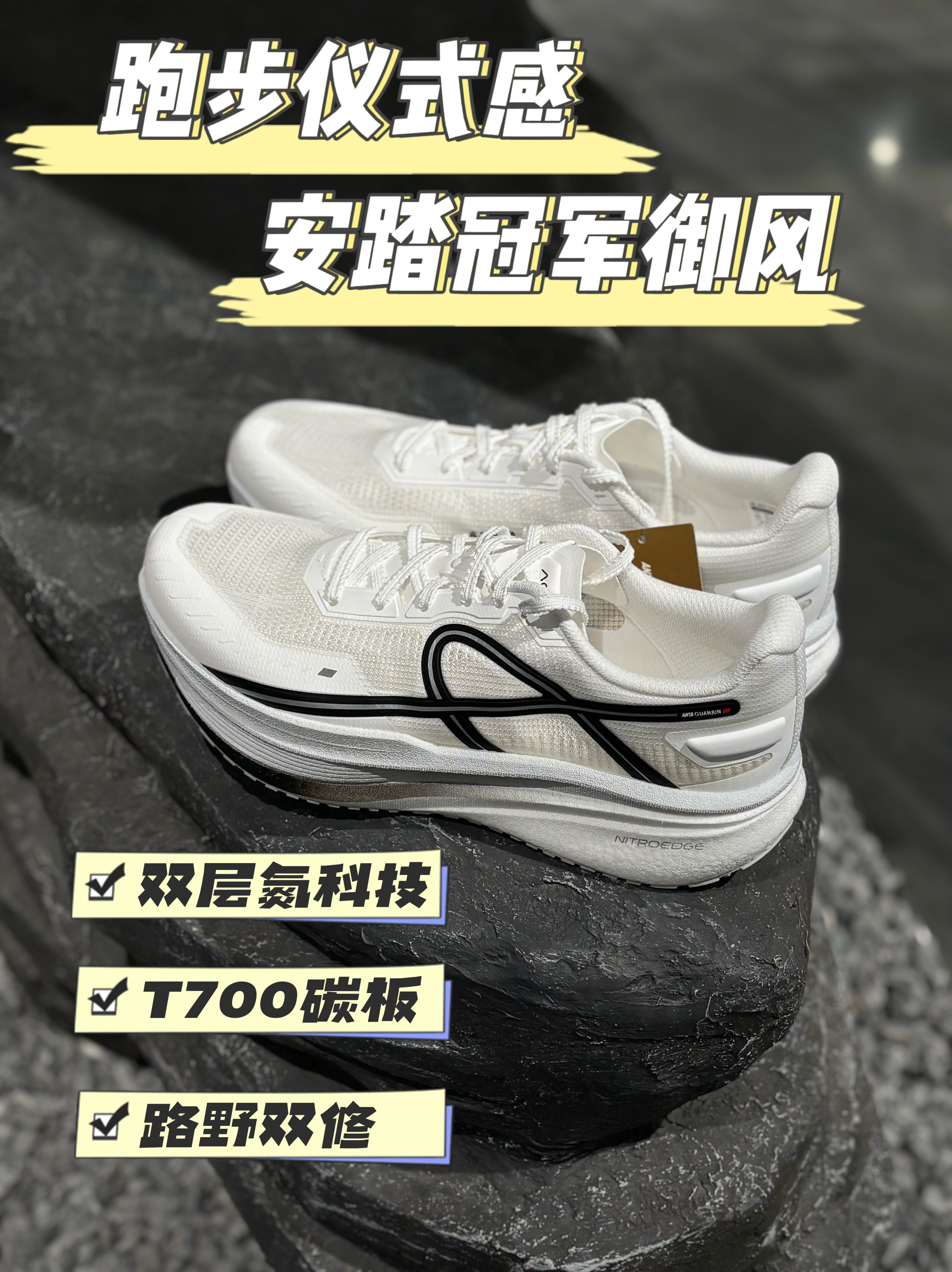 安踏冠军御风碳板跑鞋,白黑配色干净到发光! 双层氮科技中底+全掌T700碳板,缓震回弹一步到位, 飞织鞋面透气不闷脚,多地形大底抓地超稳, 通勤、慢跑、长距离拉练都能hold住, 颜值与实力双在线,春日开跑就穿它!