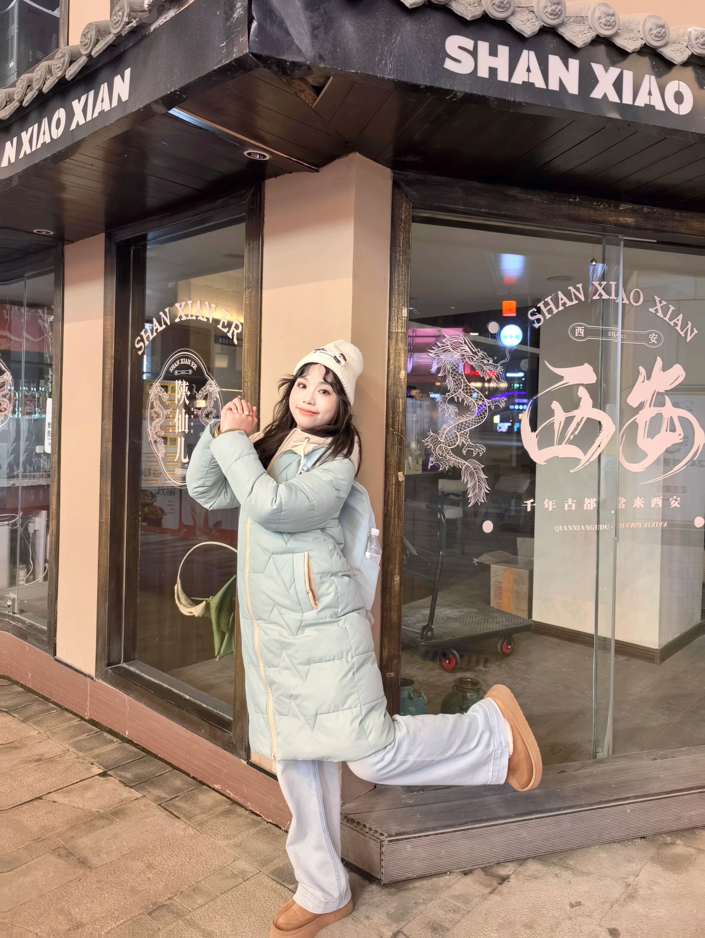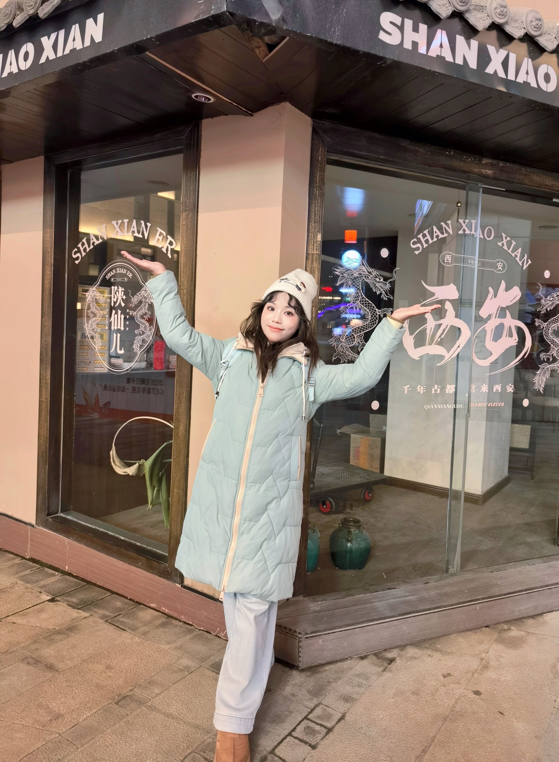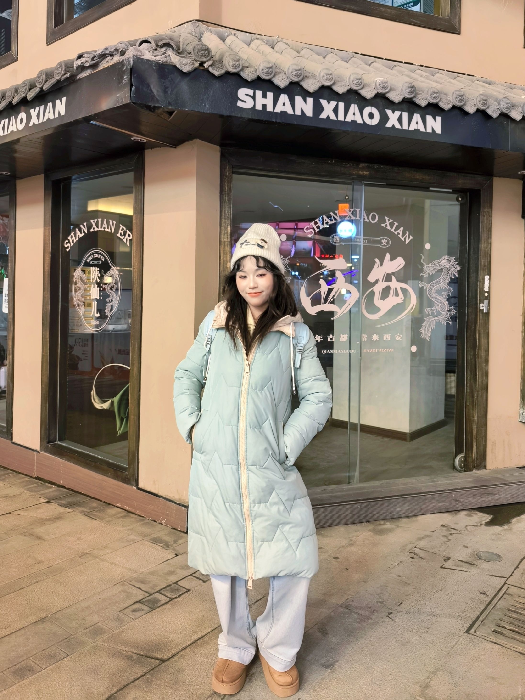 在西安的老巷街头逛吃,这件薄荷绿羽绒服直接戳中我的心巴! 清新的浅绿色调温柔又显白,中长款的版型显得人很修长,超好看!行走在街头既有氛围感又很保暖 软糯的质感穿起来很舒服,搭配浅色系的牛仔裤和雪地靴,休闲感真的拉满了!