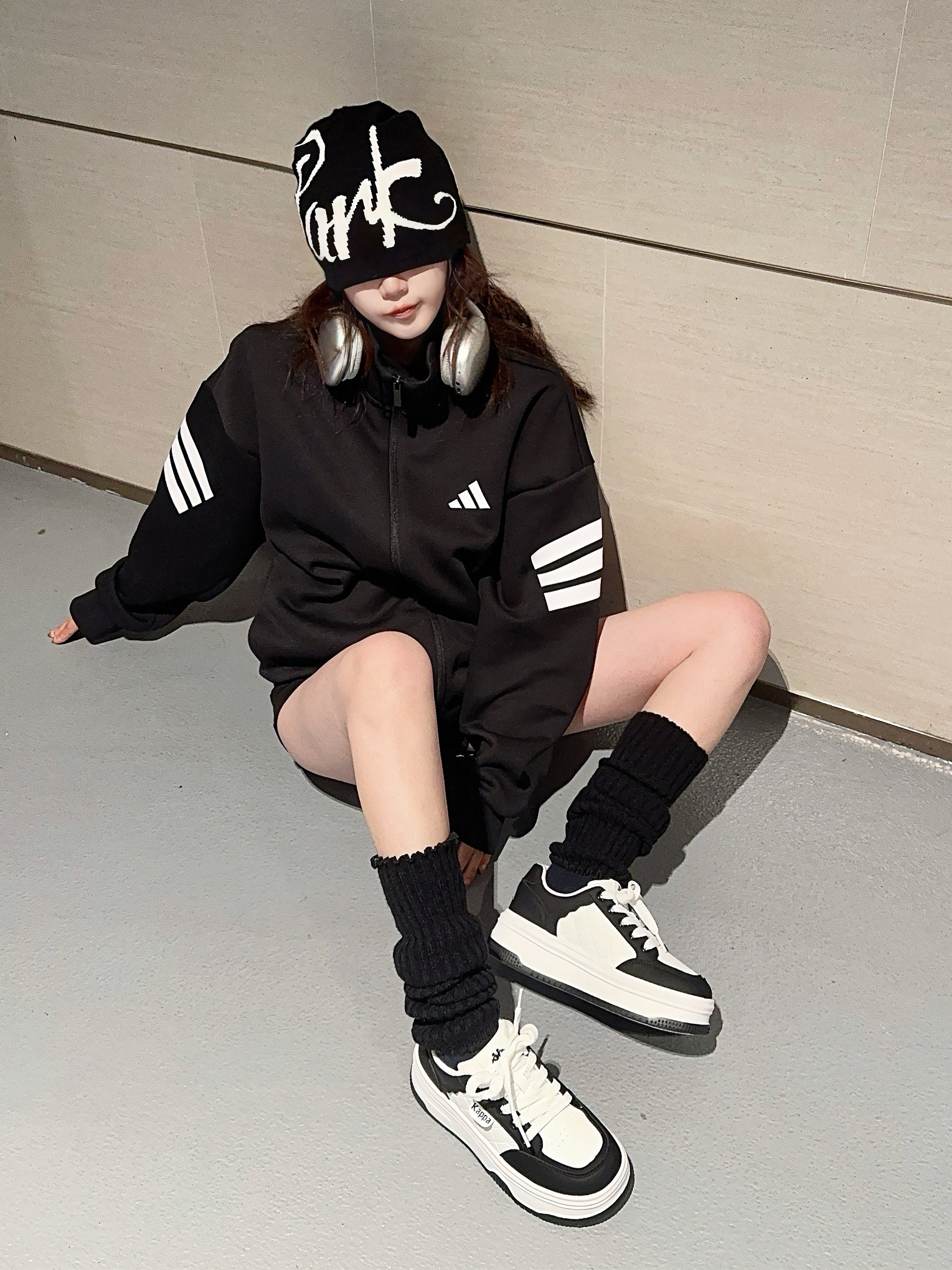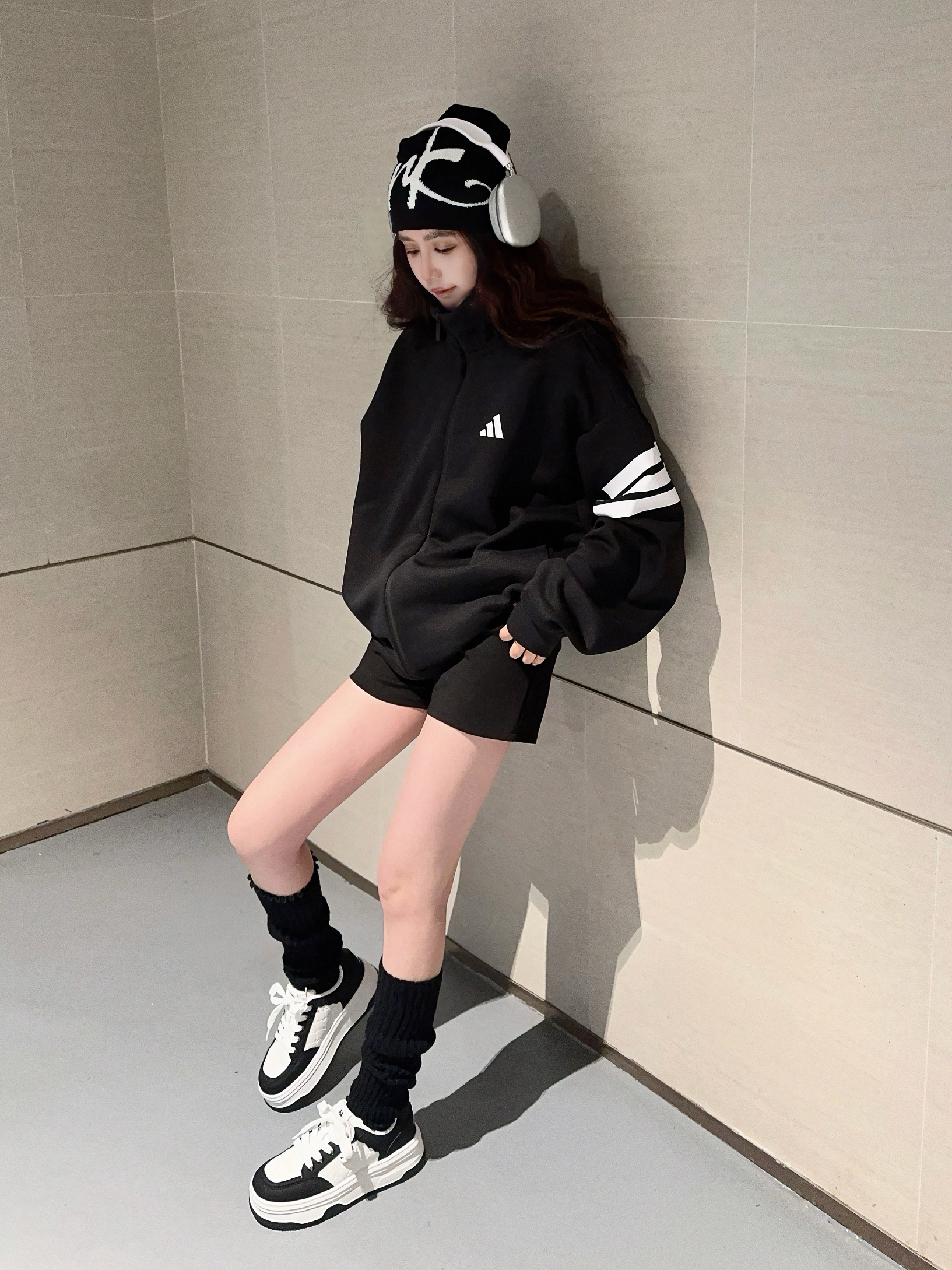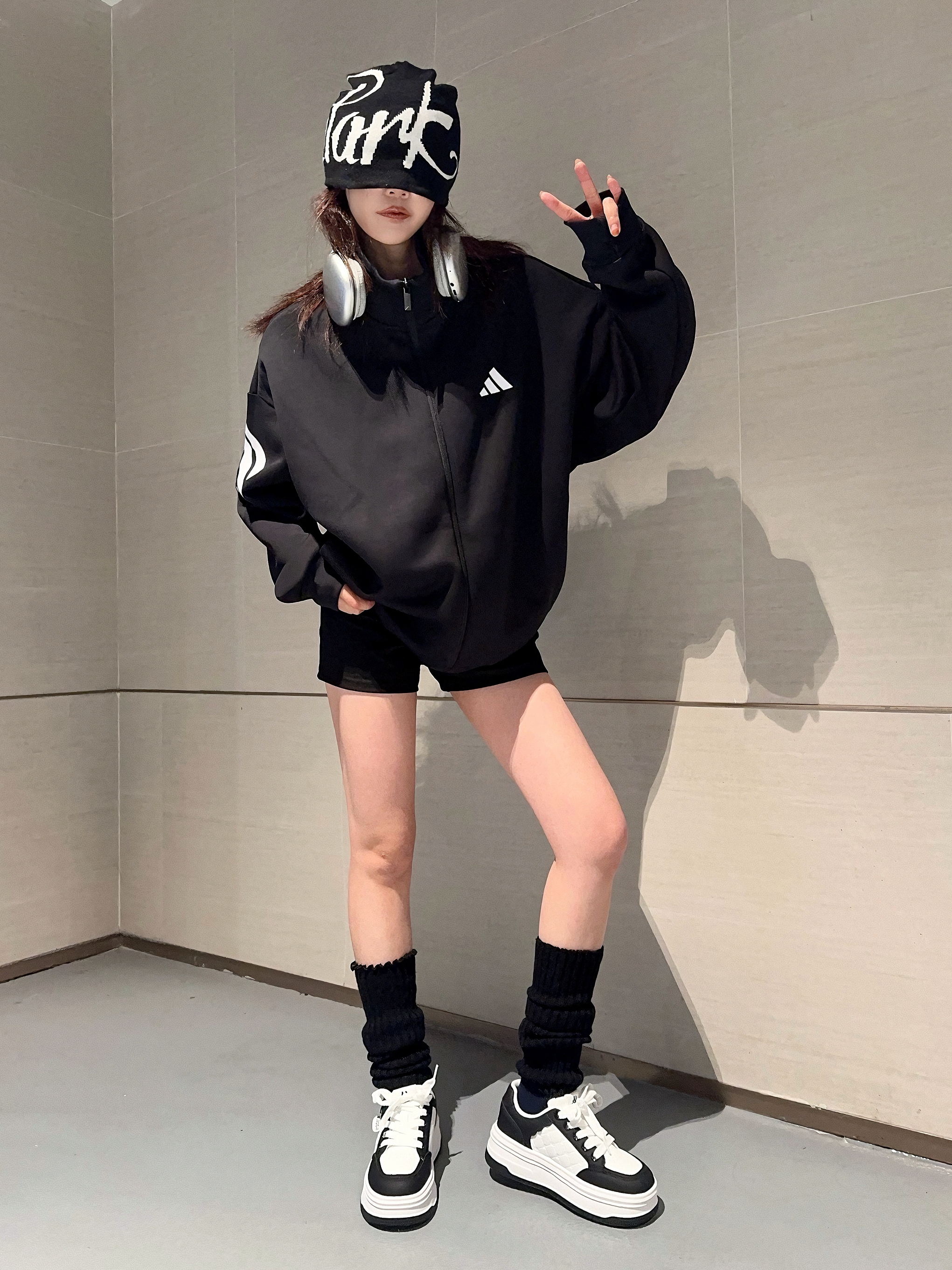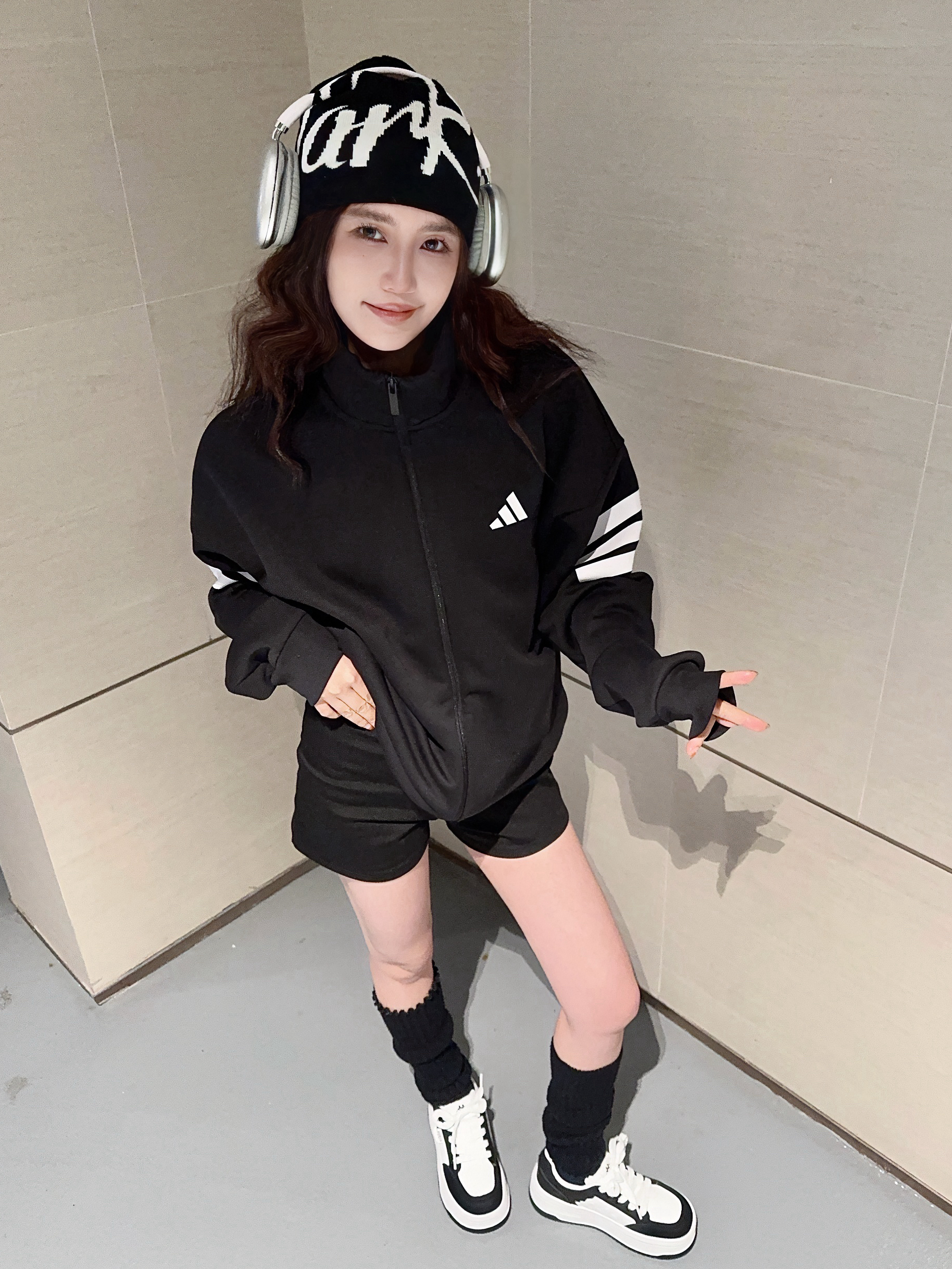 经典的黑白色,泰百搭时髦了!! 短裤这么一穿,运动休闲范儿狠狠拿捏了! 春天我真的对这种不费力运动美学毫无抵抗力哈哈。 而且外套有弹力,穿着很舒服, 跑步运动的时候穿也很舒服自在,chao爱了!