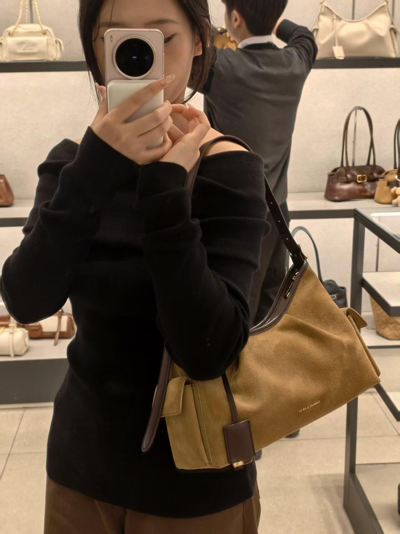 🍂这款腋下包采用再生人造麂皮,焦糖棕色搭配深棕拼接,复古又时髦!双侧口袋设计,容量大,通勤日常都超实用👜。肩带可调节,单肩or腋下背都OK,简约褶皱+金属吊牌细节,质感满分✨。麂皮柔软细腻,秋冬搭配棕色系服饰氛围感直接拉满,是秋冬必入的百搭包包!