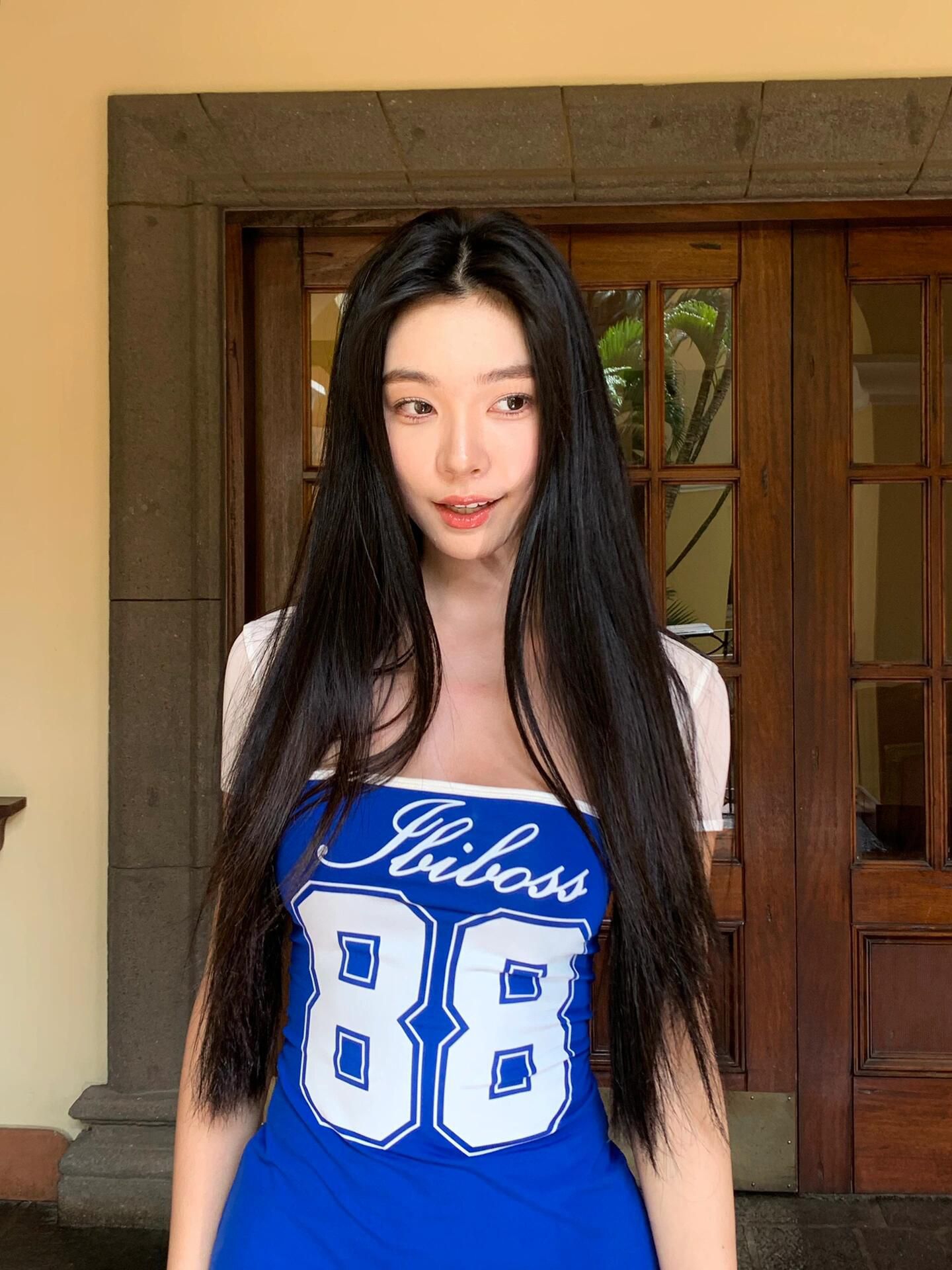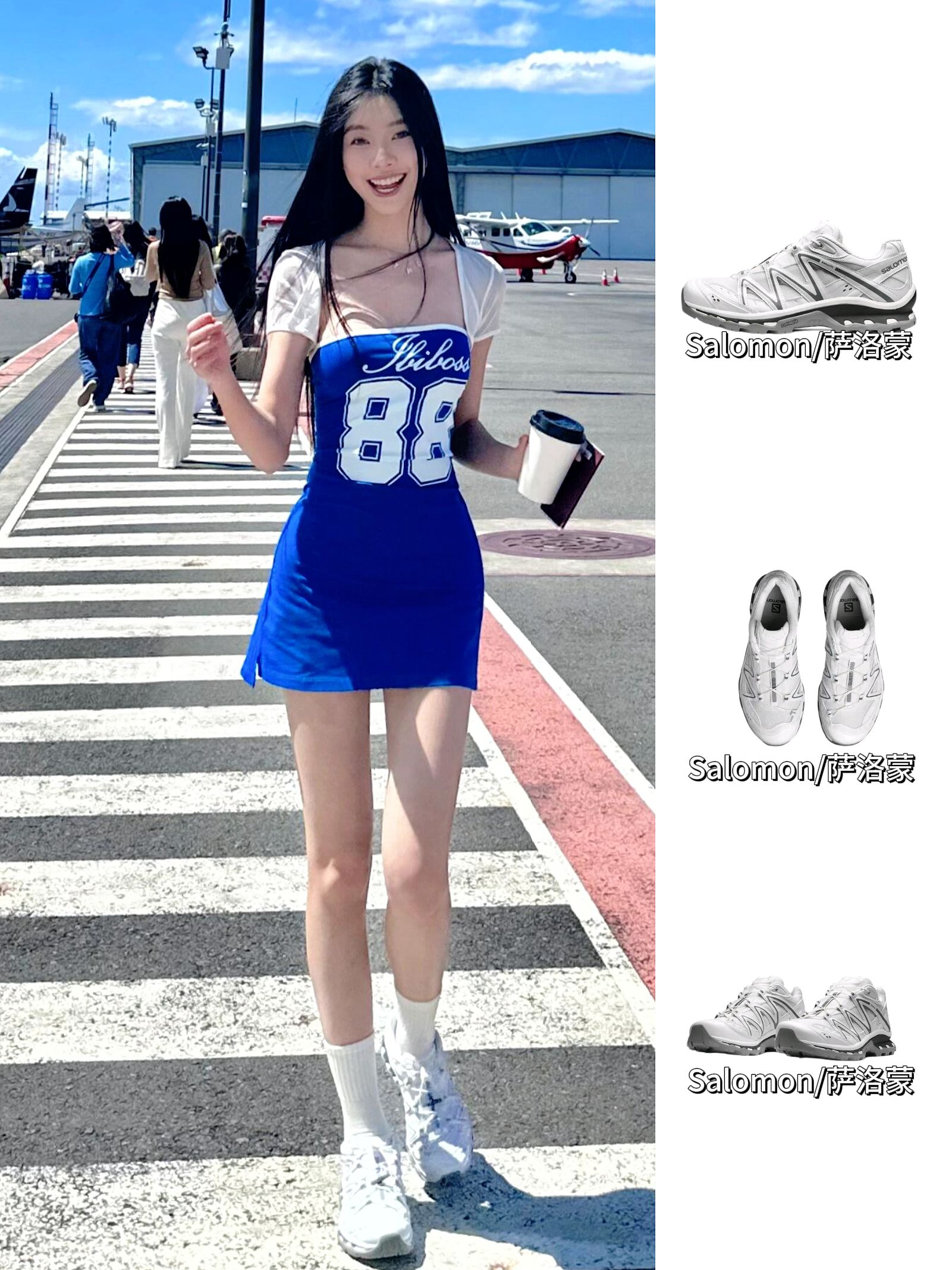 辣妹球场风+户外鞋的反差感太绝了✨ 这套真的把美式辣妹和户外感焊在身上了!蓝白撞色球衣裙超显白,数字印花直接拉满运动元气,短款版型把腰线和腿衬得又细又长,配个白短袖小坎肩还能藏住拜拜肉,日常穿也不会太露。 脚上这双Salomon小白鞋是灵魂!本来以为会很违和,结果软乎乎的鞋型中和了辣妹感,走路还巨舒服,机场暴走都没压力。整体甜酷平衡得刚好,拍照巨出片,走在路上回头率直接拉满,谁穿谁是活力少女本...