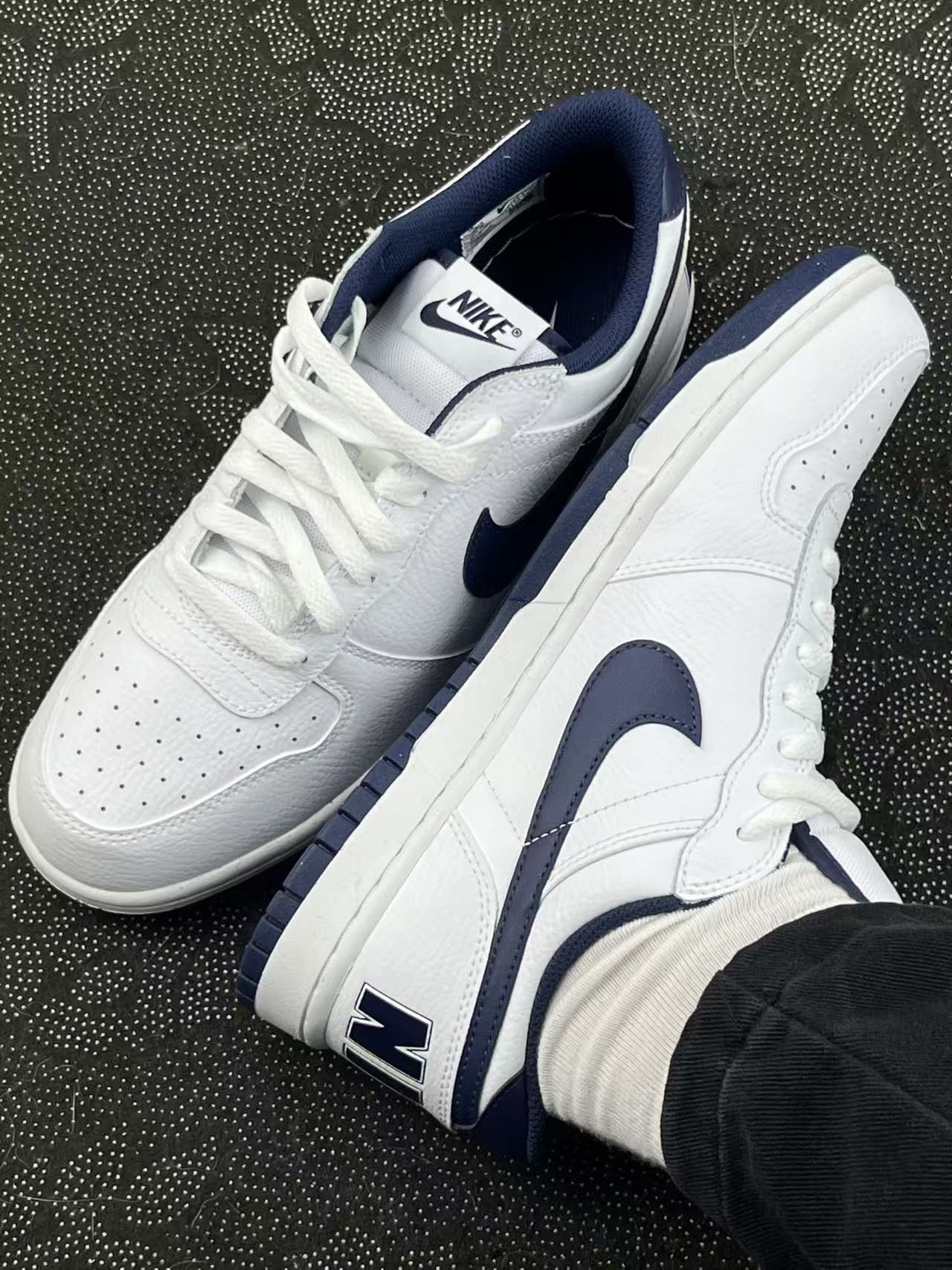 日常通勤穿了快两周,整体是舒服但不惊艳的感觉。 鞋面是荔枝纹皮革,摸起来挺扎实,不过刚上脚时鞋舌有点硬,走久了才慢慢贴合。配色是经典白+藏青,低调耐脏,配牛仔裤、运动裤都不挑,日常出门很省心。