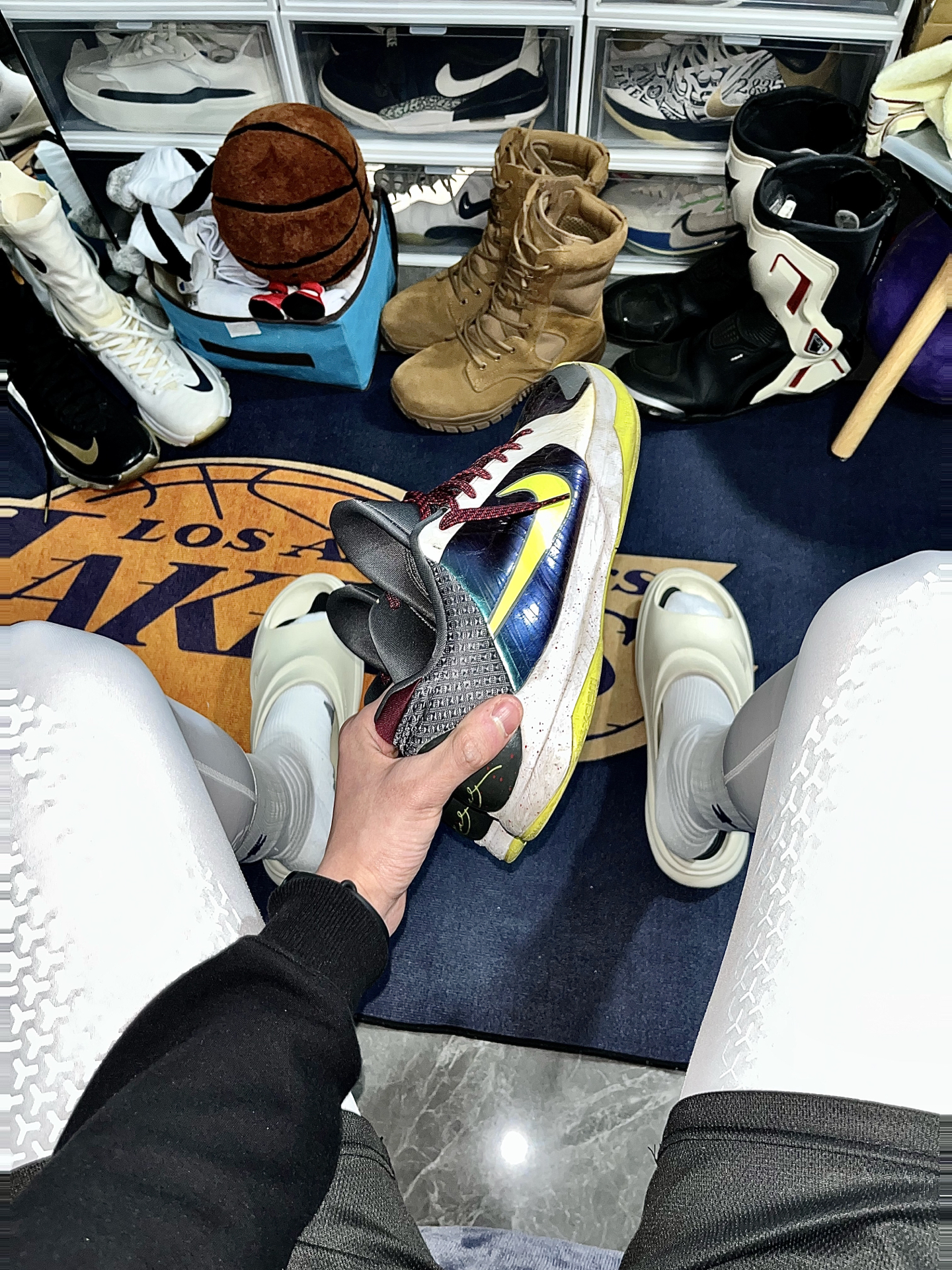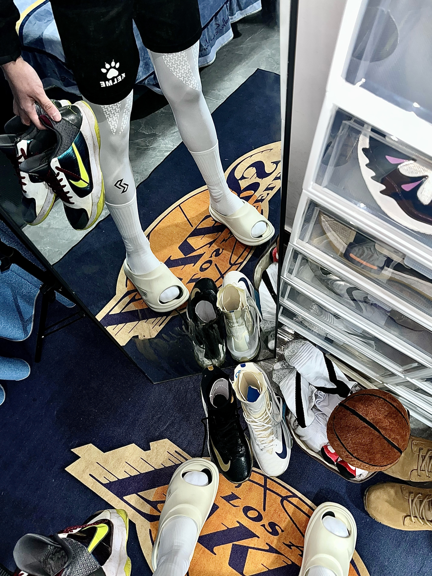 拖鞋配球袜的松弛感, 加上手里的战靴,是“随时准备上场”的状态。 周围堆着的篮球、球鞋收纳盒, 把热爱都写在细节里,复古运动风直接拉满, 舒服又有态度 #科比同款战靴 #宝藏篮球鞋分享 #预习一下春季穿搭 #我要上热门篮球鞋🏀 #黑皮白袜体育生