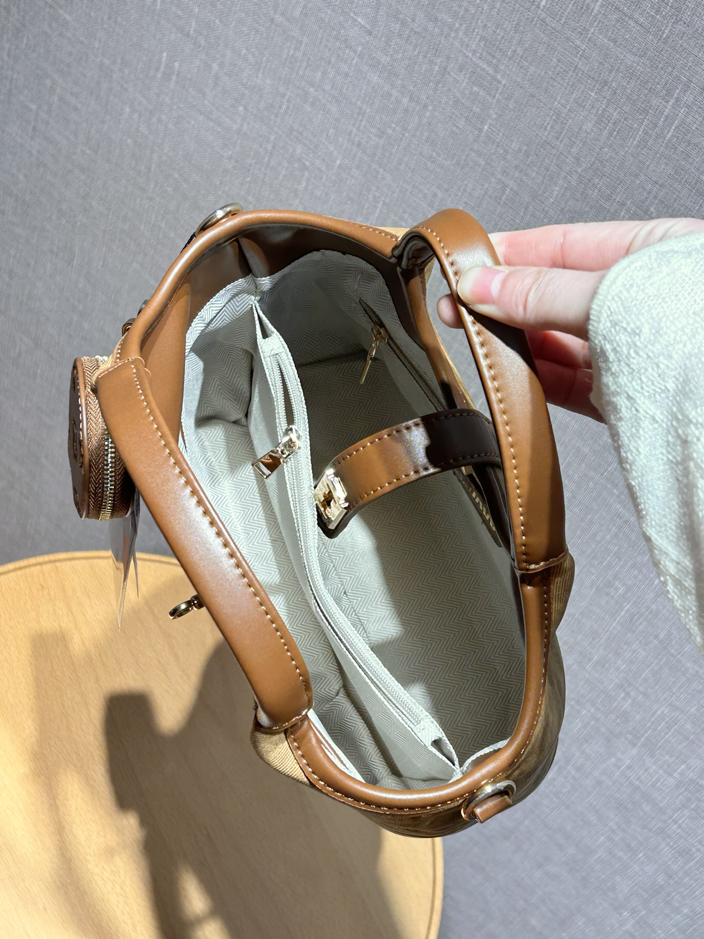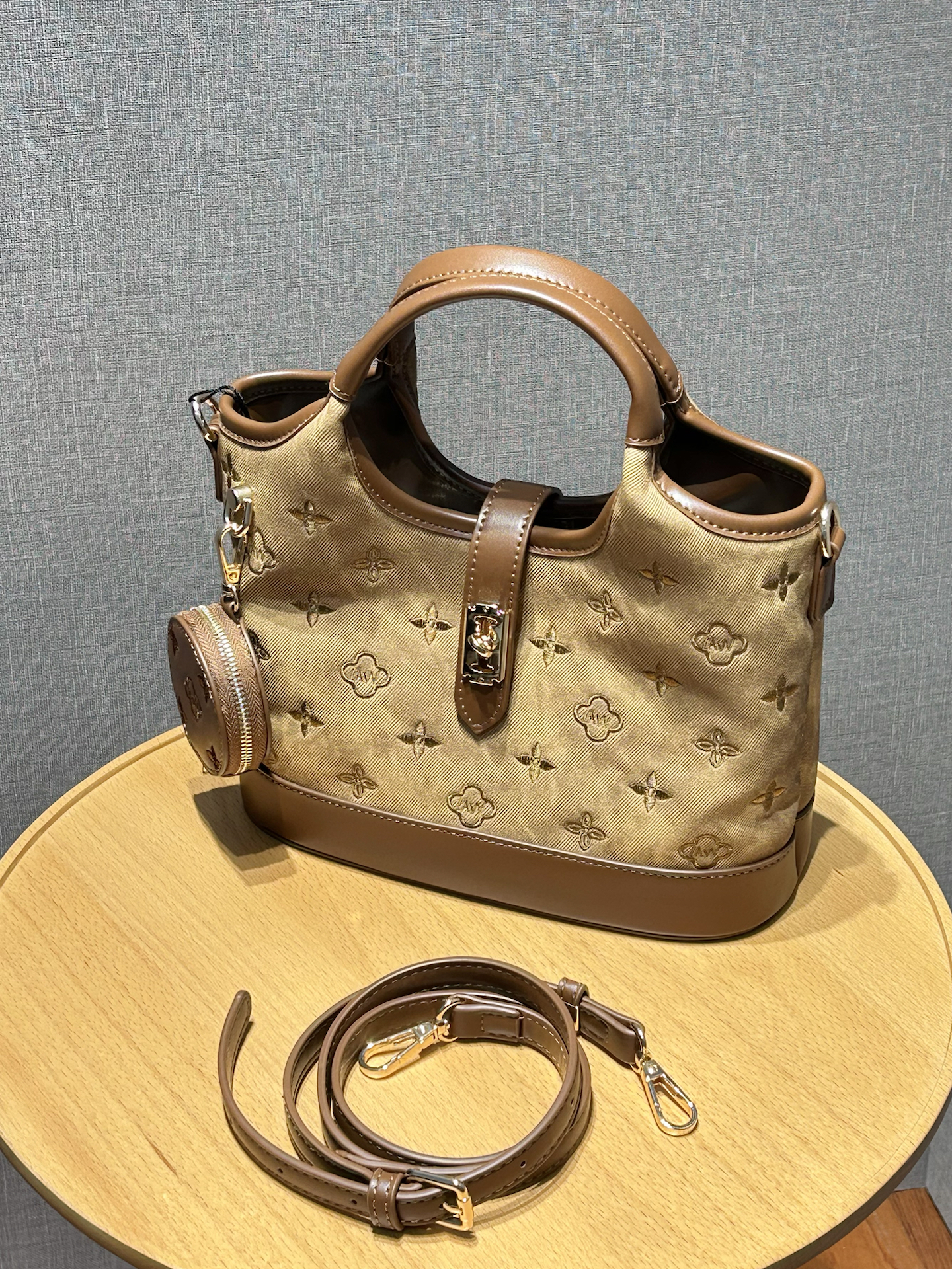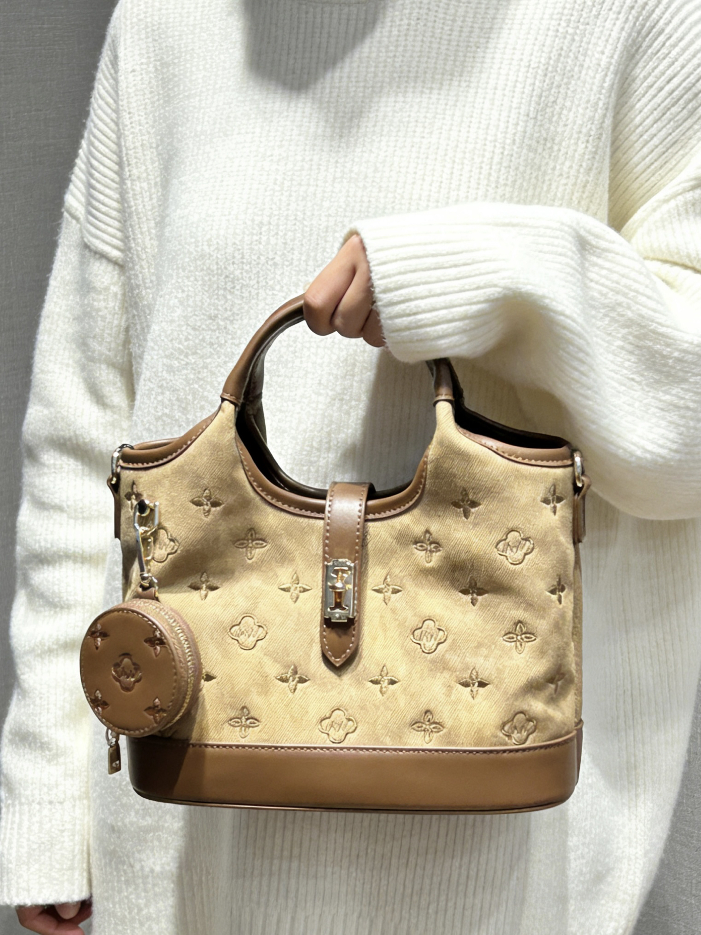 介个复古棕菜篮子包太适合日常通勤了 麂皮感面料配棕色皮边 质感还蛮细腻的 立体压纹图案很精致 还搭配了一个小圆包 平时出门容量够装日常用品了 内里还有分层收纳很方便 搭配斜挎肩带 通勤出游都合适 复古色调平时还蛮好搭配衣服的 #春季配饰预习清单 #这样搭包好看 #送到心巴上的配饰 #我不买包的fag又破了 #提前预习一下早春穿搭
