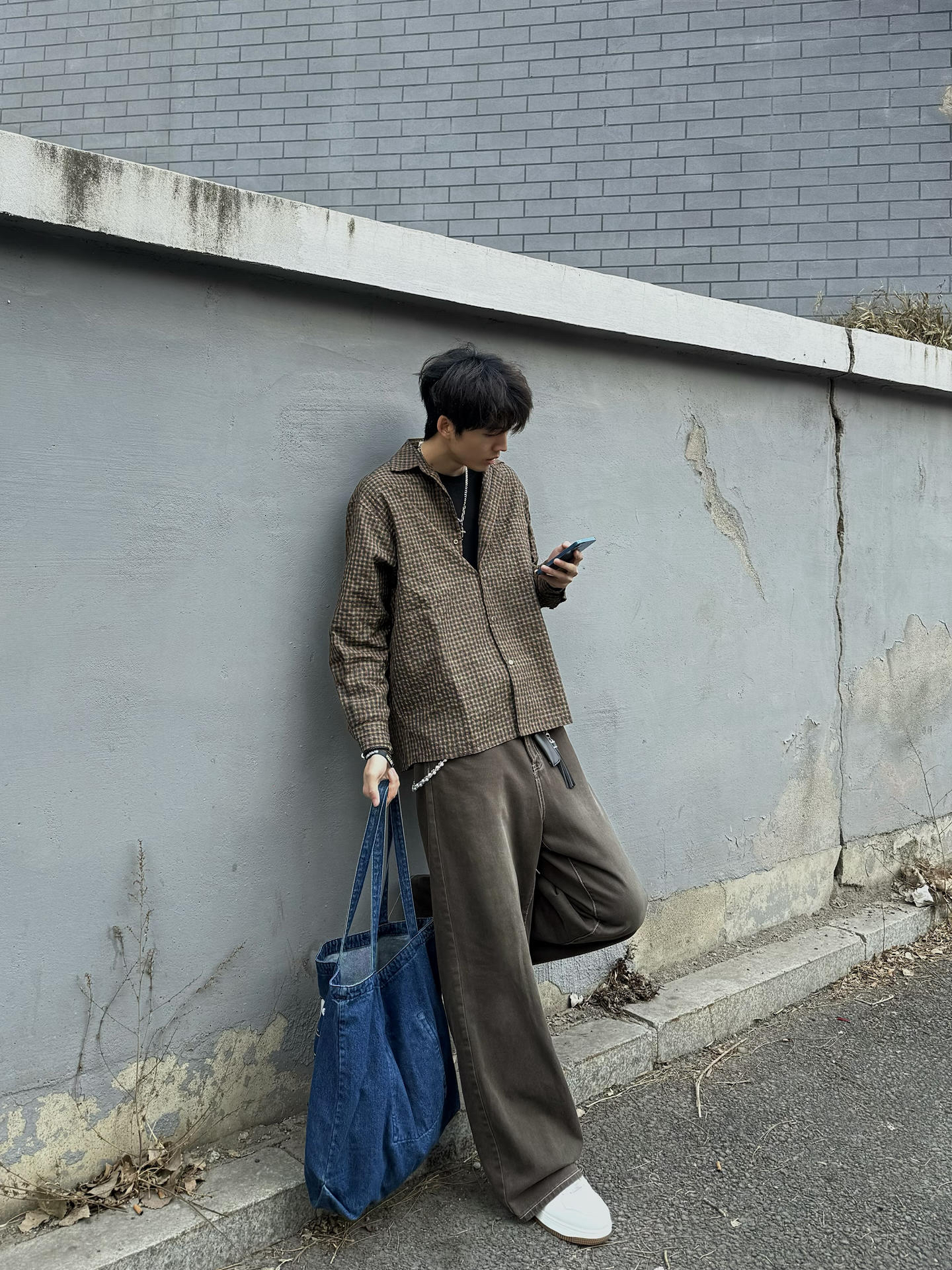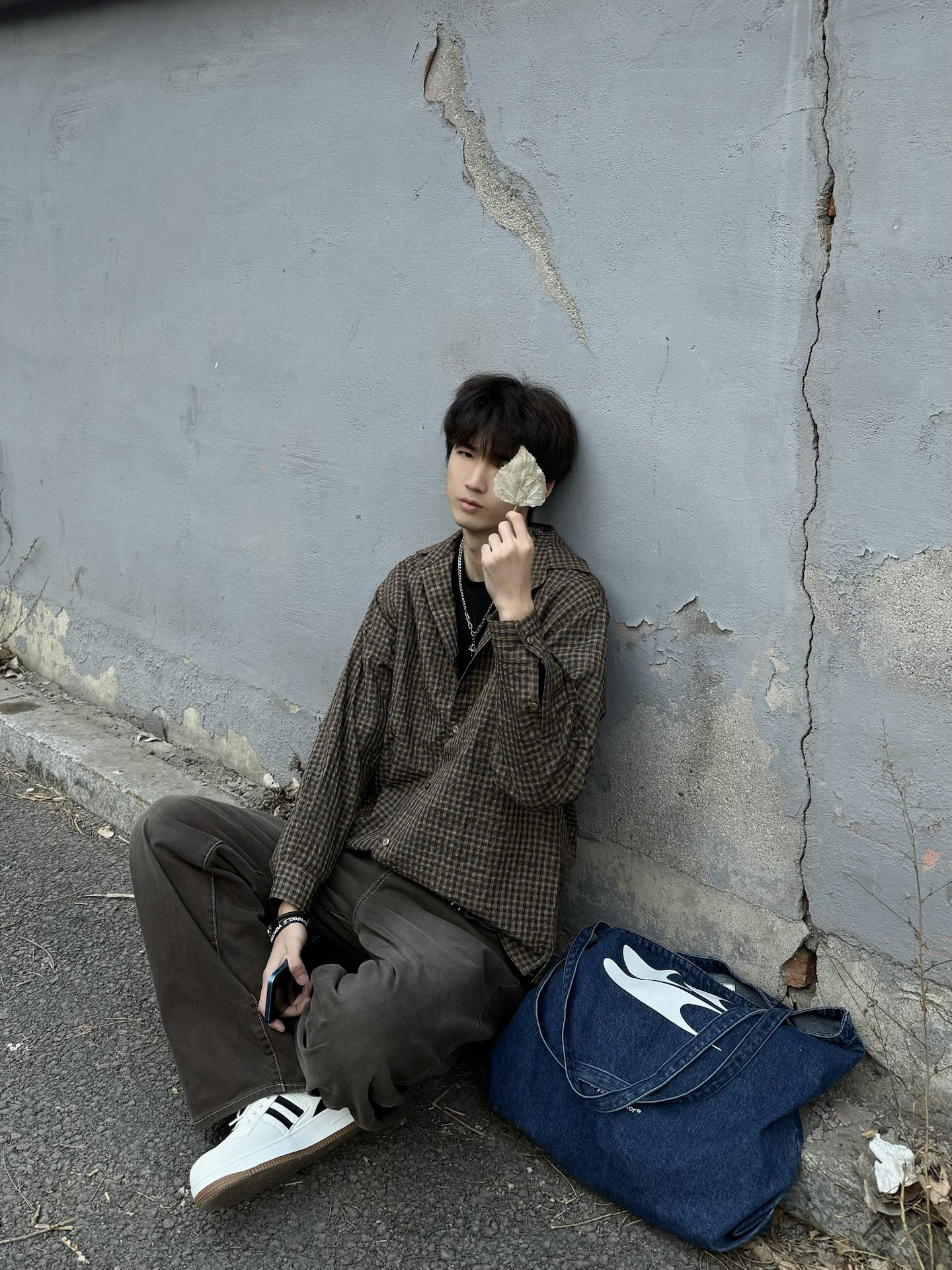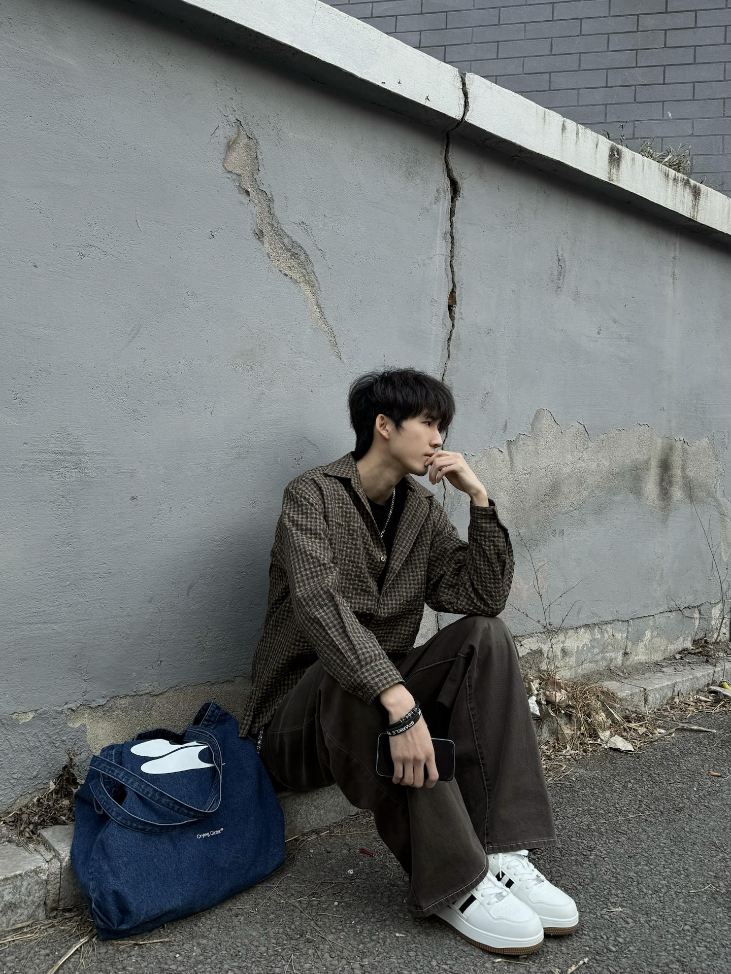 最近天气太舒服了☁️ 穿得松松垮垮出门晃悠一圈✌️ 搞件棕格衬衫直接当薄外套穿👔配了同色系的深棕阔腿裤 一身暖乎乎的色调 看着就很舒服😌 踩双小白鞋 背个能装下所有零碎的托特包 靠在墙根晒晒太阳 捡片叶子瞎拍几张hhh 感觉时间都慢下来了 真喜欢这种不用费脑子的日子 也太爽了吧🤓 #裤子选的好穿搭没烦恼 #男春日大学生OOTD #老钱风穿搭 #5G速通春日穿搭 #今日份暖色系外套分享