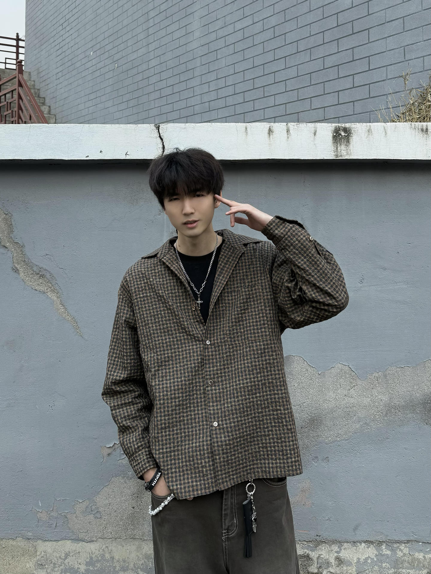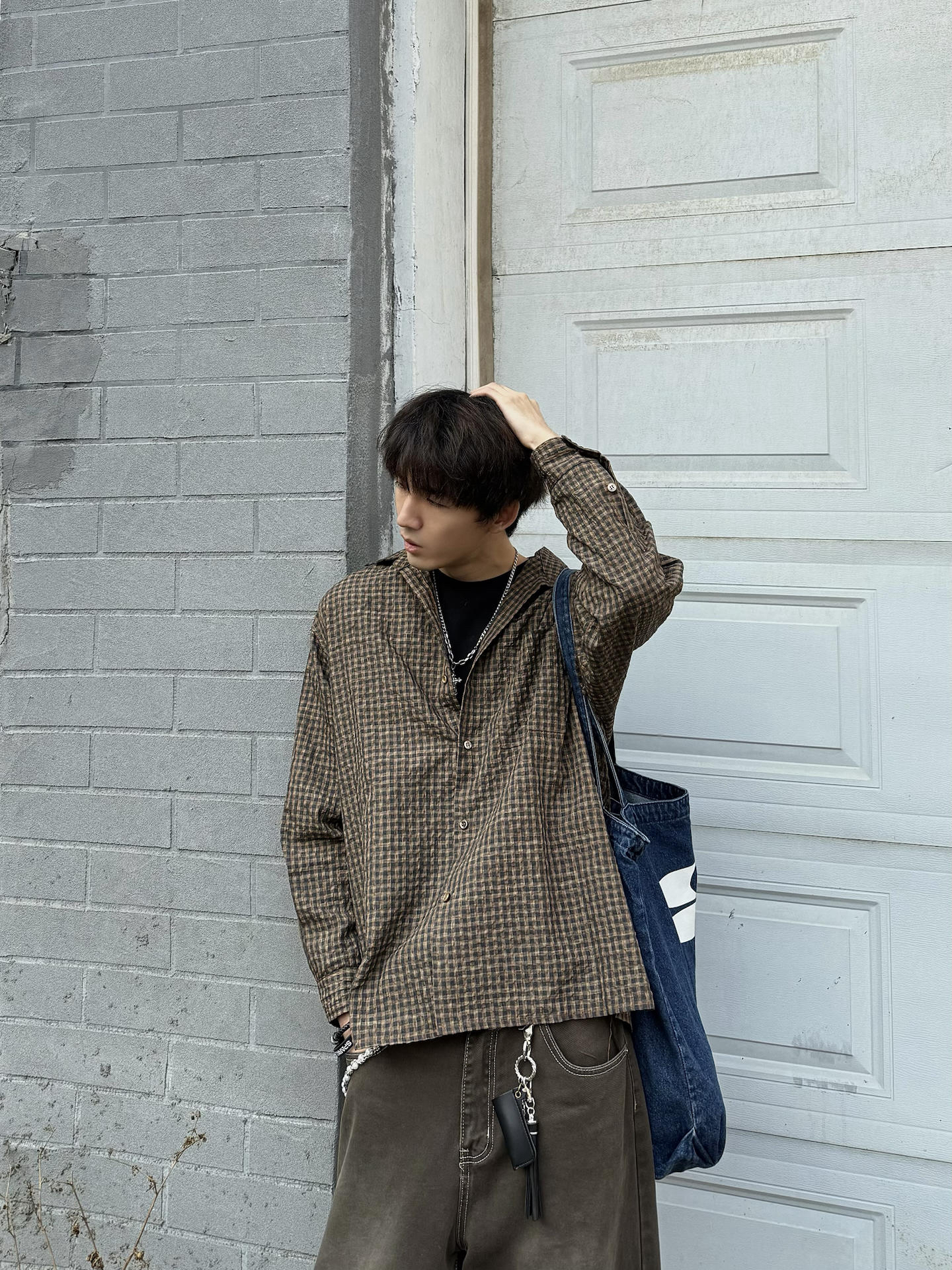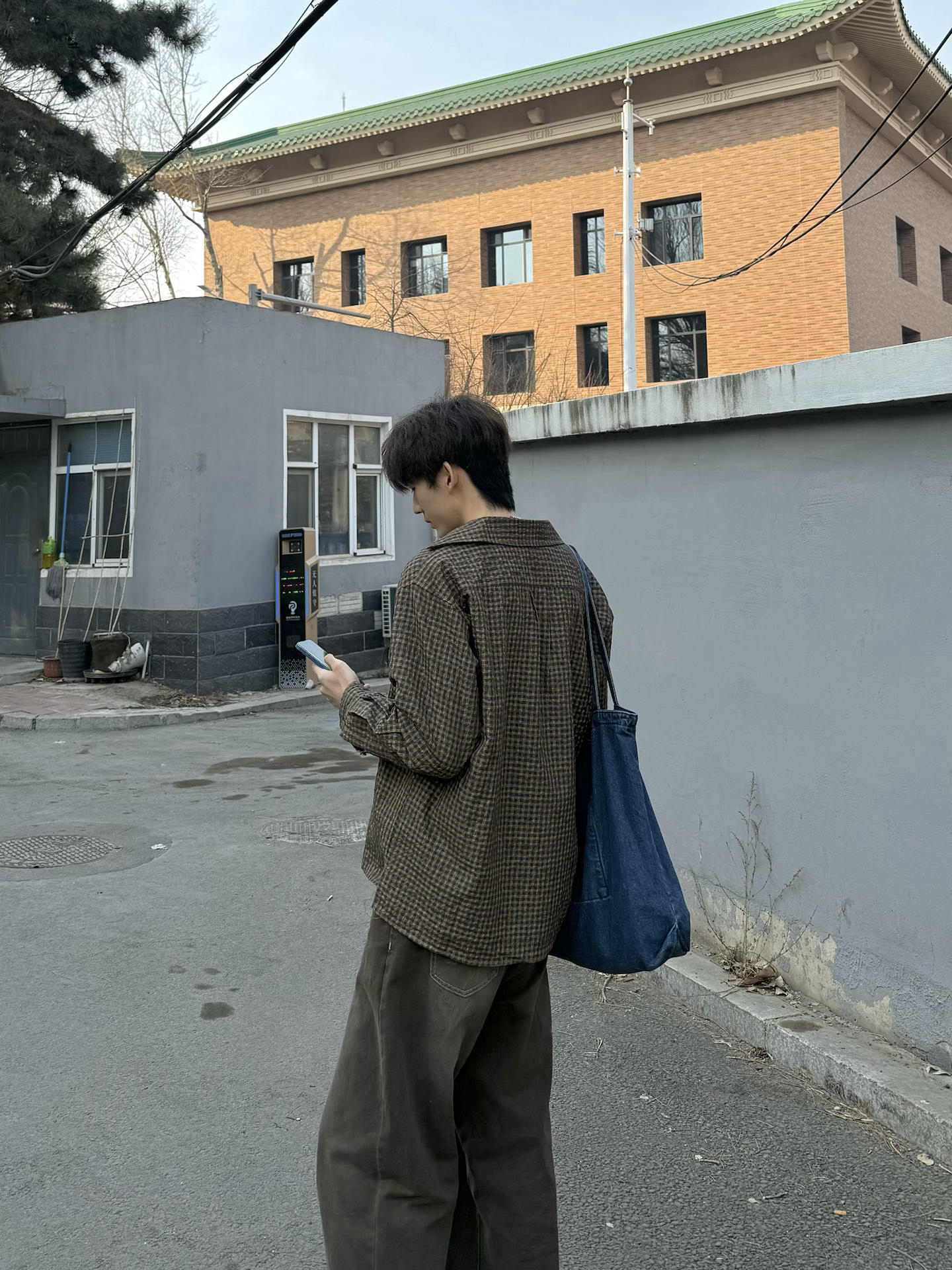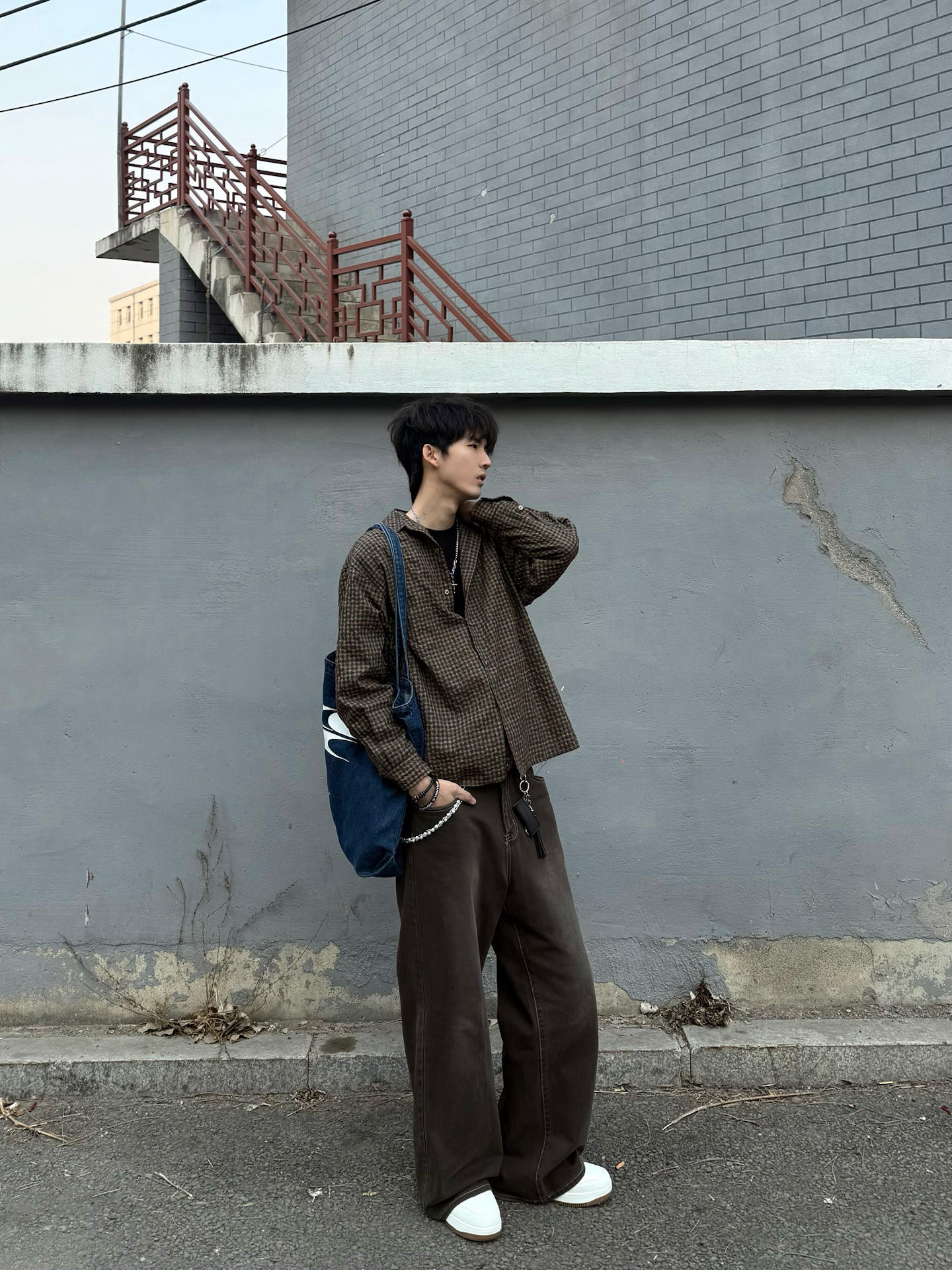 最近天气太舒服了☁️ 穿得松松垮垮出门晃悠一圈✌️ 搞件棕格衬衫直接当薄外套穿👔配了同色系的深棕阔腿裤 一身暖乎乎的色调 看着就很舒服😌 踩双小白鞋 背个能装下所有零碎的托特包 靠在墙根晒晒太阳 捡片叶子瞎拍几张hhh 感觉时间都慢下来了 真喜欢这种不用费脑子的日子 也太爽了吧🤓 #裤子选的好穿搭没烦恼 #男春日大学生OOTD #老钱风穿搭 #5G速通春日穿搭 #今日份暖色系外套分享