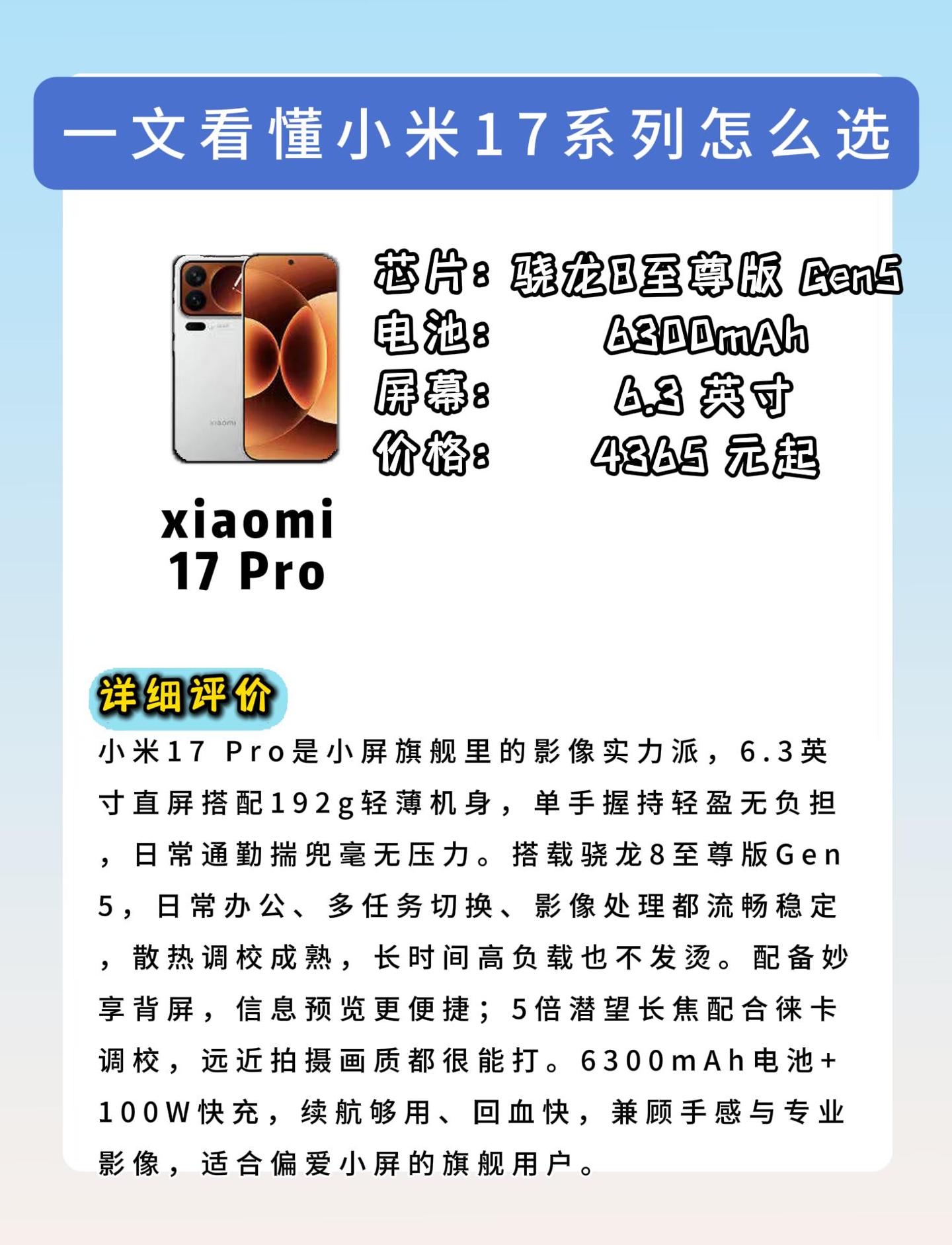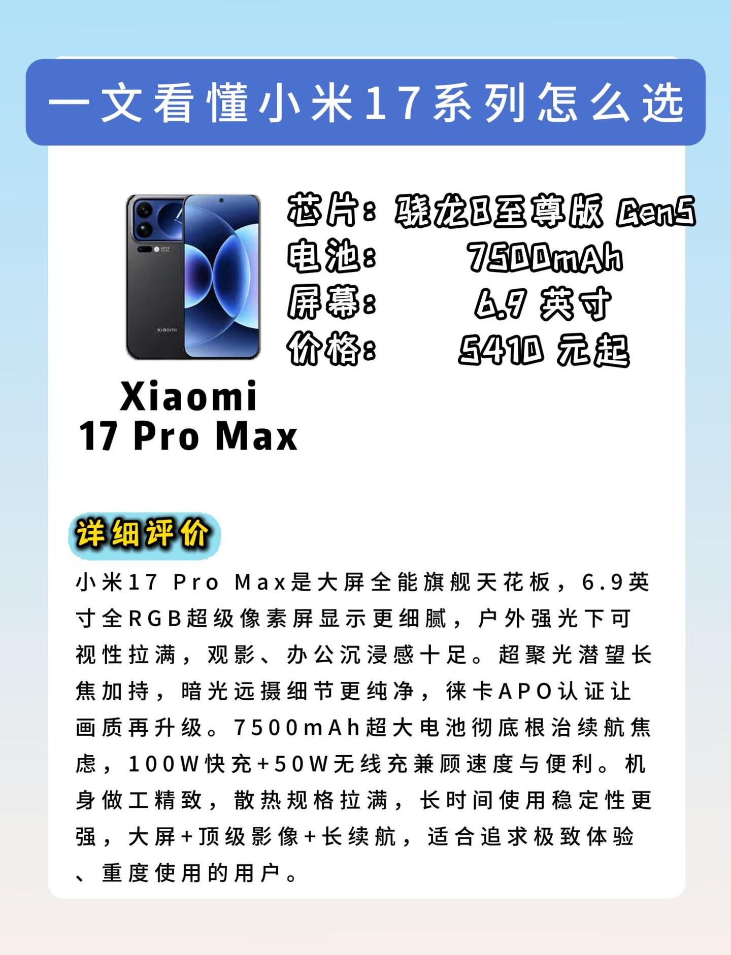 #一文看懂怎么选 数码圈这波小米旗舰王炸对决直接炸翻全场!小米17、17 Pro、17 Pro Max三款搭载骁龙8至尊版Gen5的新机重磅登场,把高端机的性能、影像、手感卷到了全新高度。不管你是追求均衡实用的日常党、偏爱小屏影像的进阶用户,还是痴迷大屏顶配的重度玩家,这三款实力派总能精准戳中你的需求点。今天咱们就把这三款机型扒个底朝天,看看谁才是你口袋里的年度真香旗舰! 小米17直接把“全能...
