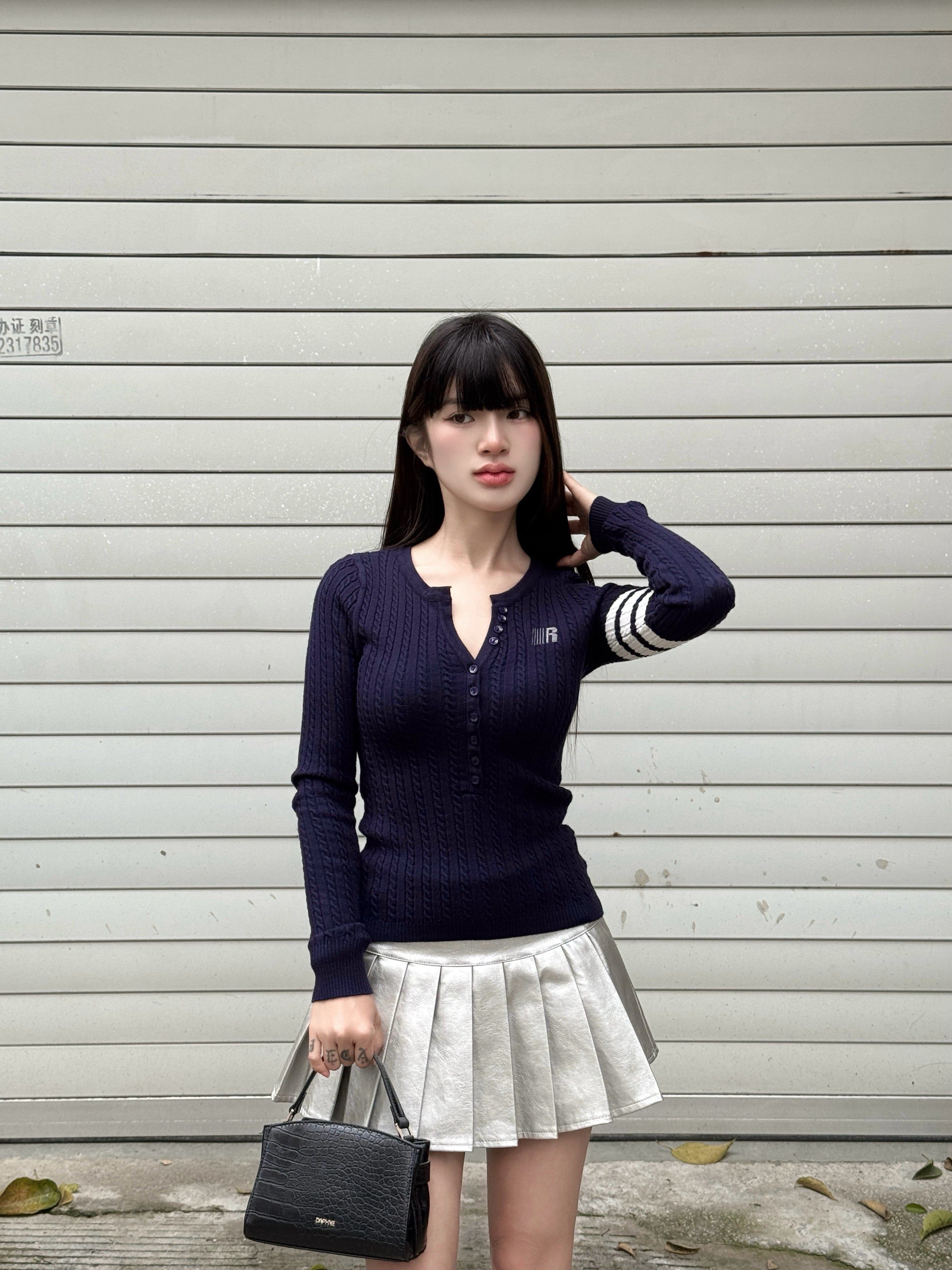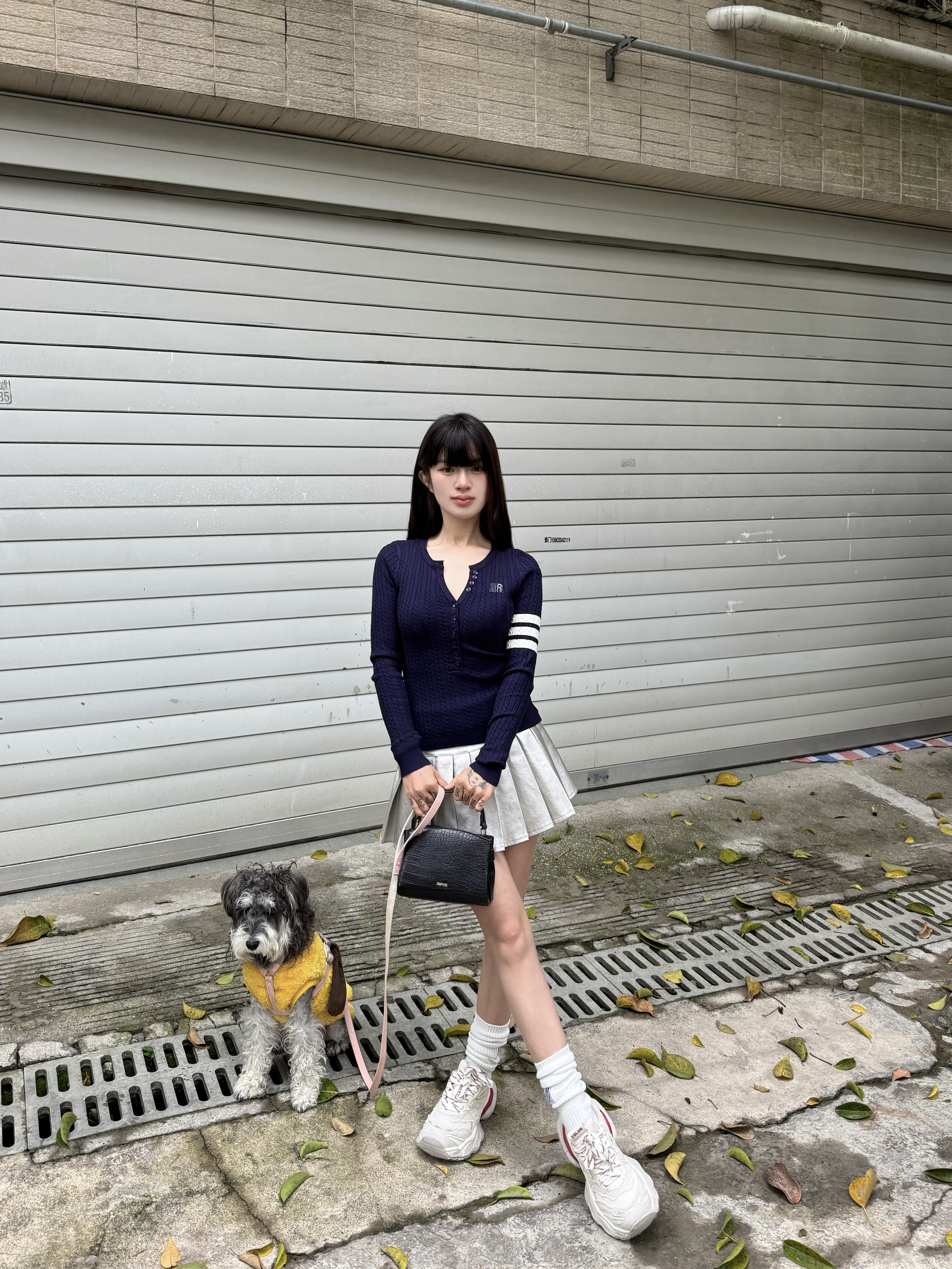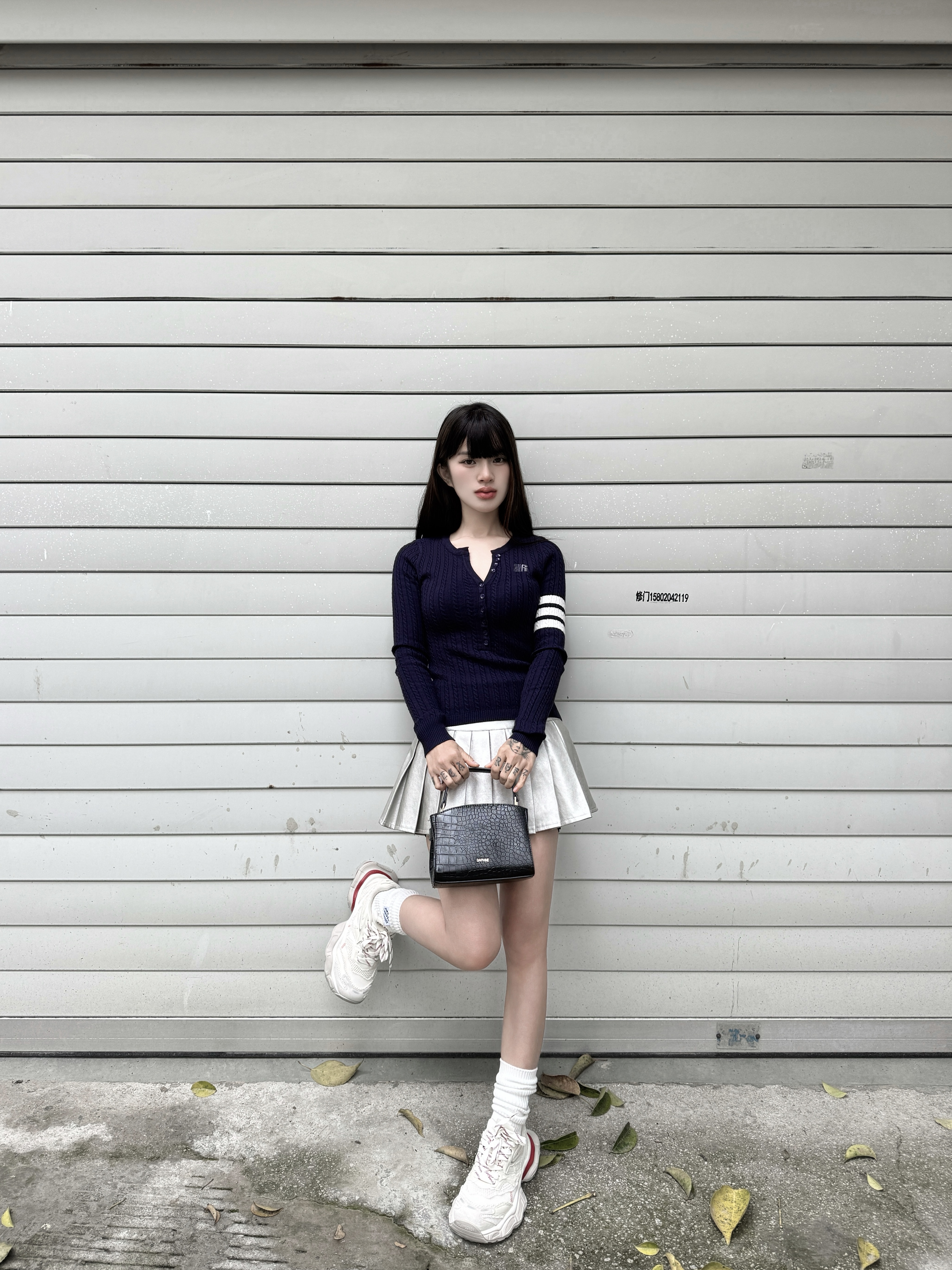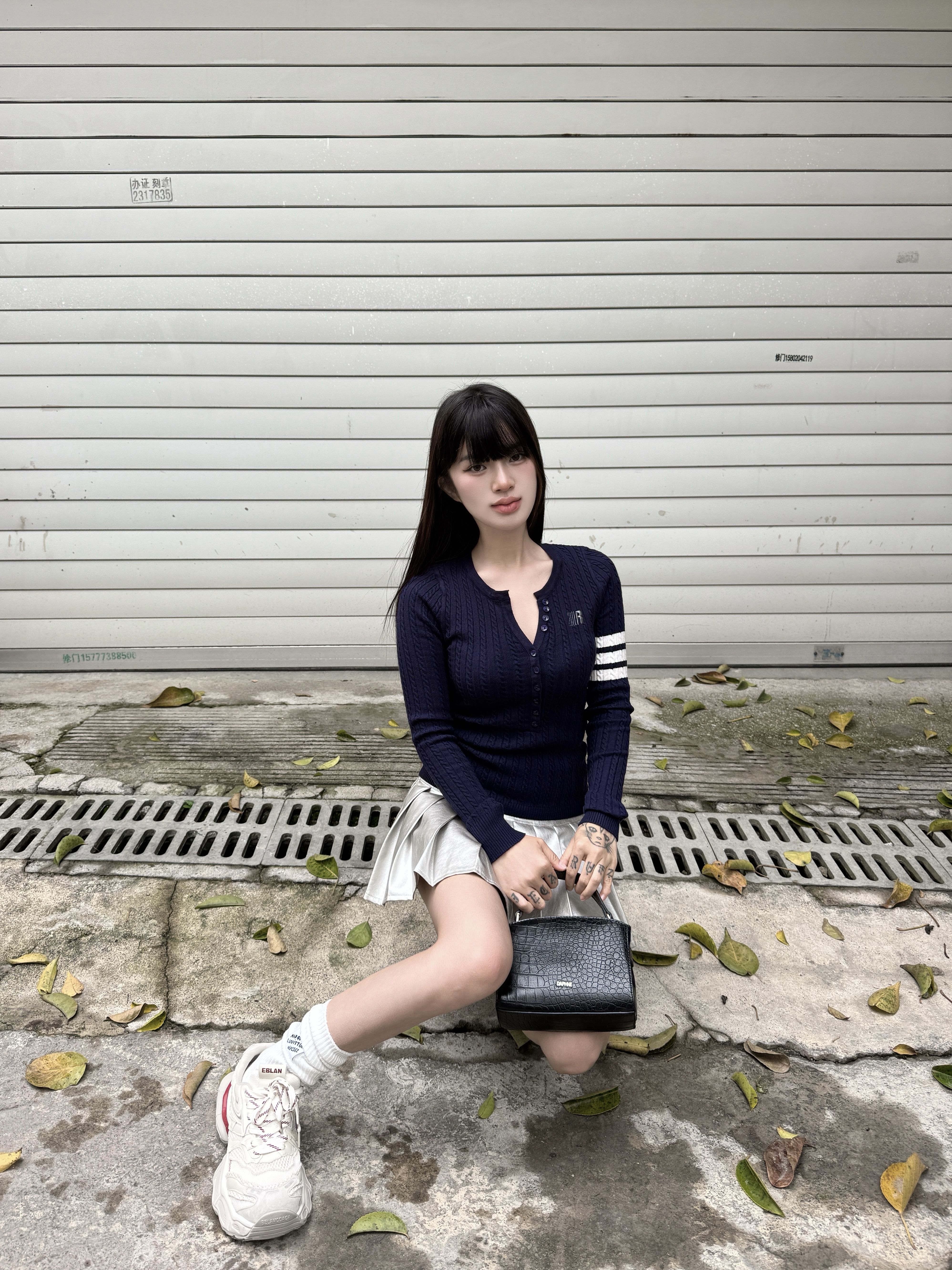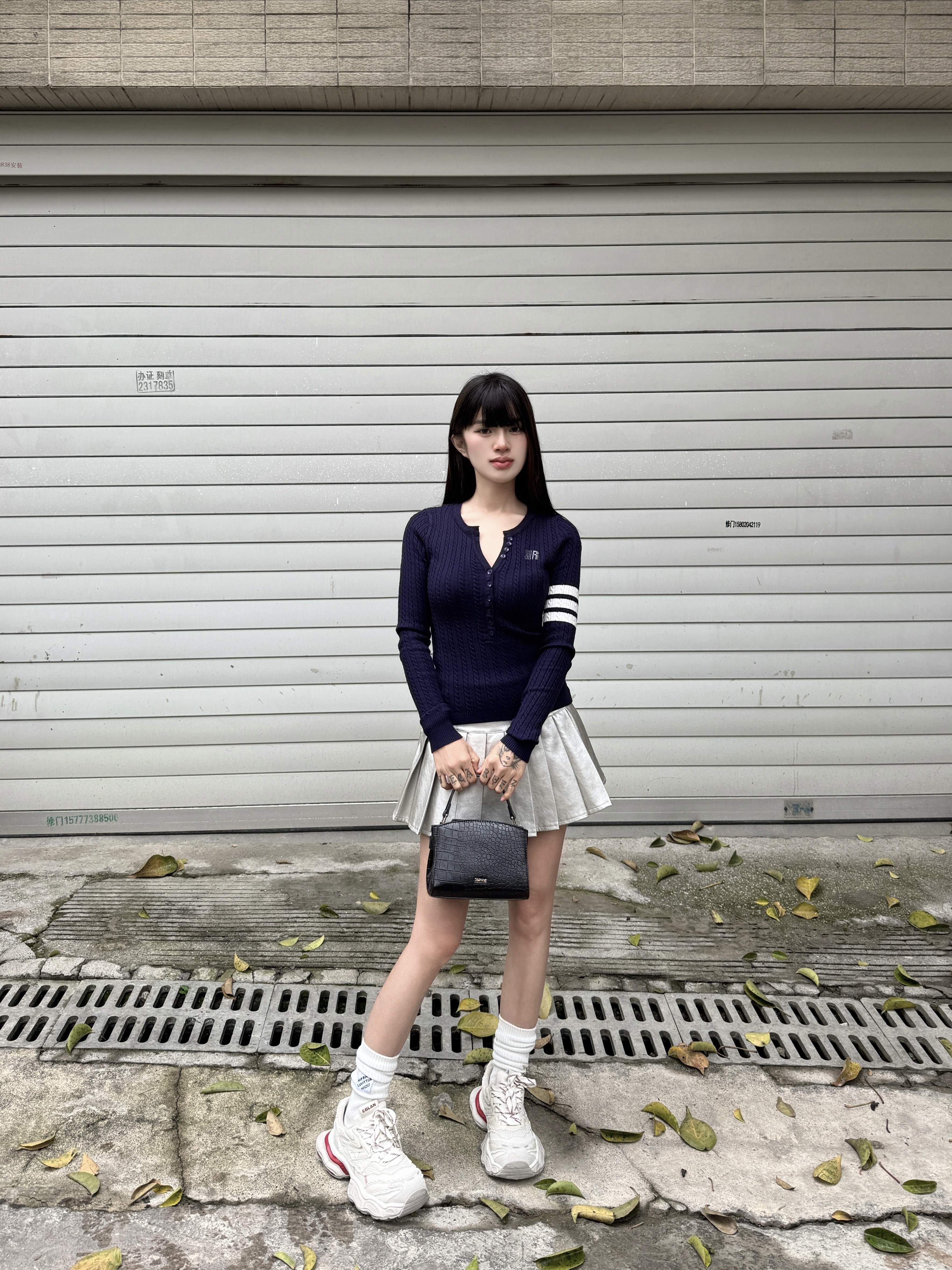 🏫藏青麻花开衫+银色百褶裙,经典学院感直接拉满 🧚♀️搭配厚底老爹鞋秒变元气少女,小个子也能穿出大长腿 👛随手拎起黑色小方包,站在卷门前,韩系画报感瞬间拿捏🤏 舒服又出片的日常穿搭,温柔又有活力