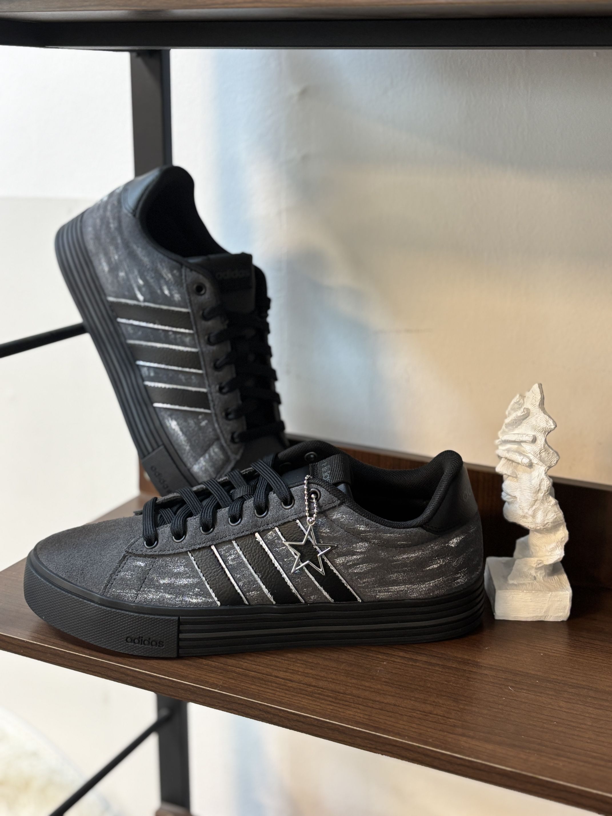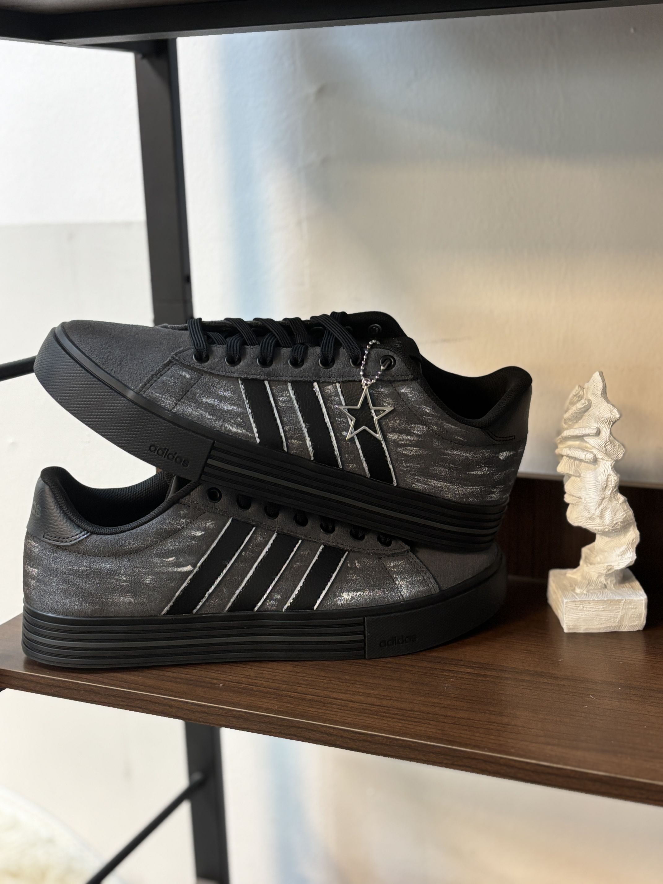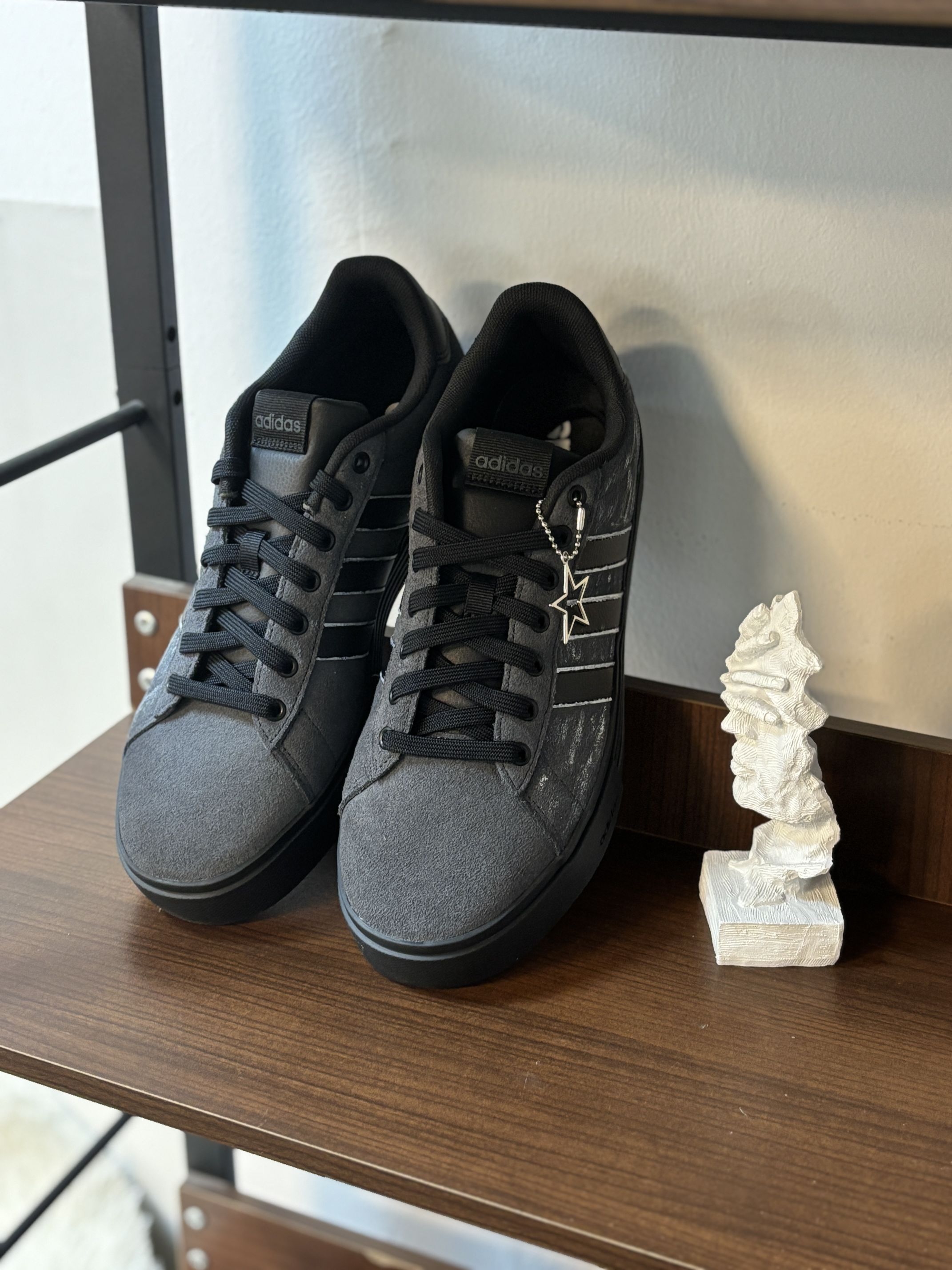 这双adidas Daily星芒款真的很对我胃口,做旧银灰翻毛皮+黑条纹,低调又有质感,鞋侧挂的镂空星芒挂饰是点睛之笔,不夸张但辨识度拉满。日常通勤、上课或者周末逛展都能穿,配工装裤、直筒牛仔裤都很顺,黑灰配色耐脏又百搭,厚底还能悄悄增高。鞋型偏利落,不挑脚型,走路也稳,属于那种穿好几年都不会过时的基础款,日常穿舒服又耐看,完全不挑场景😎