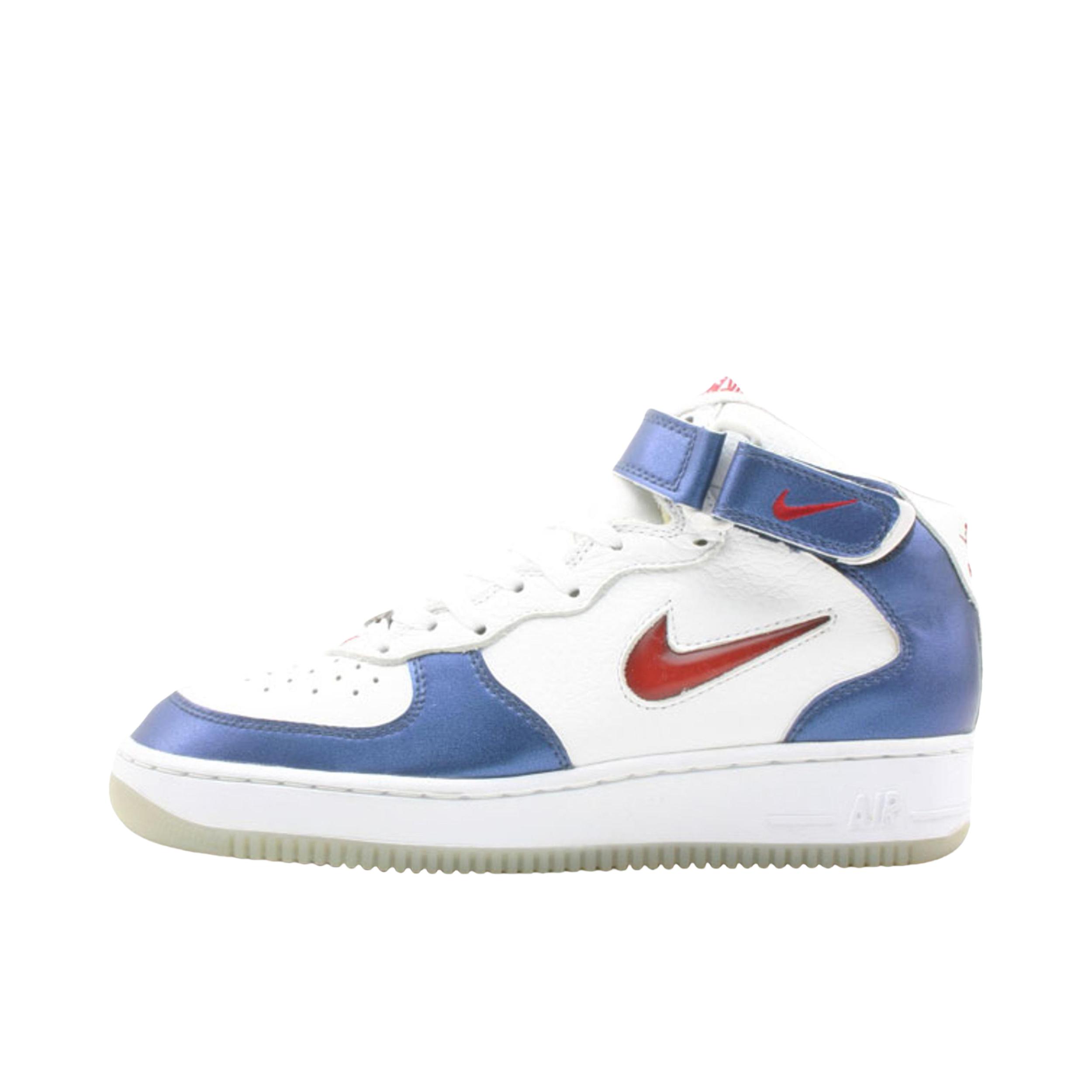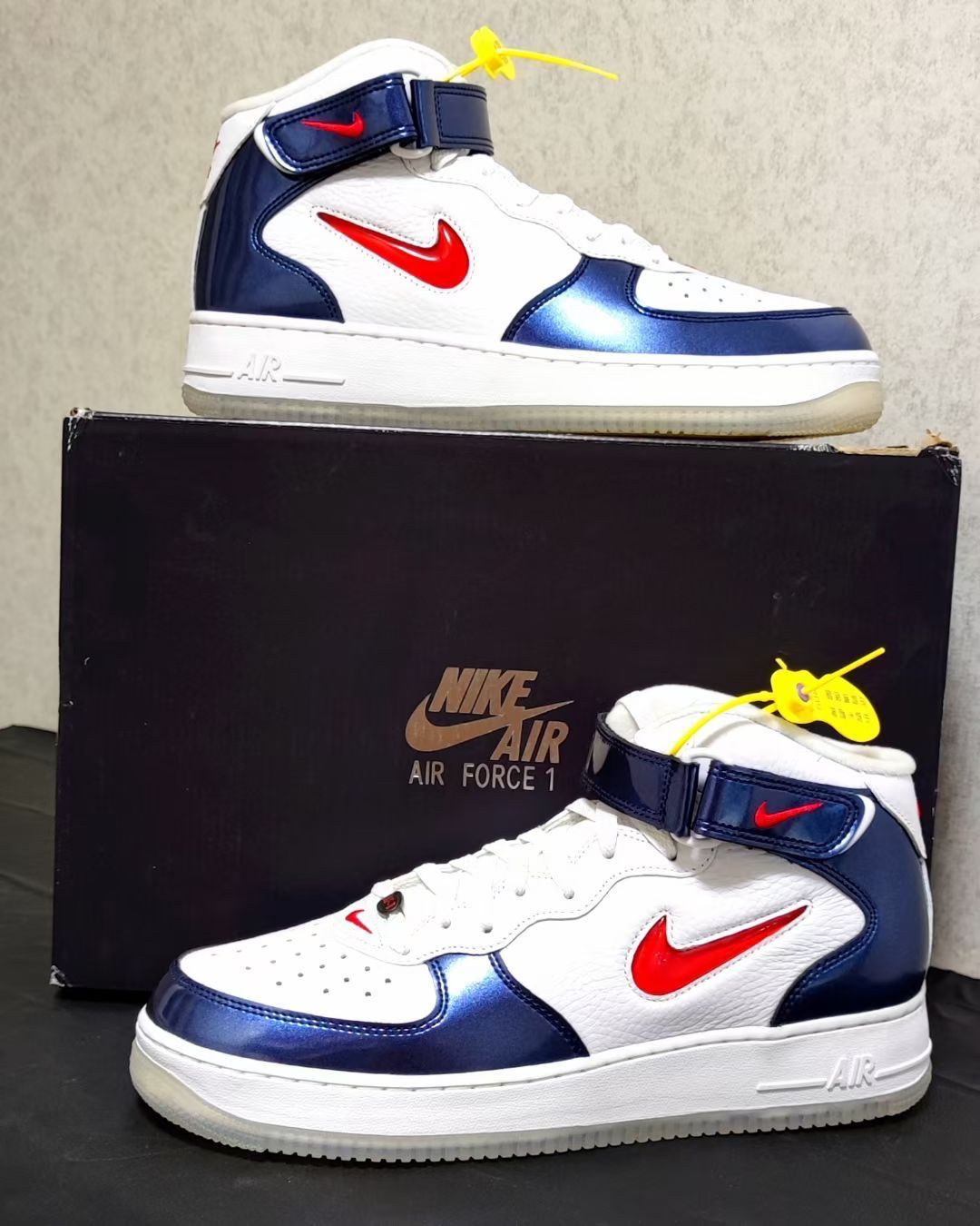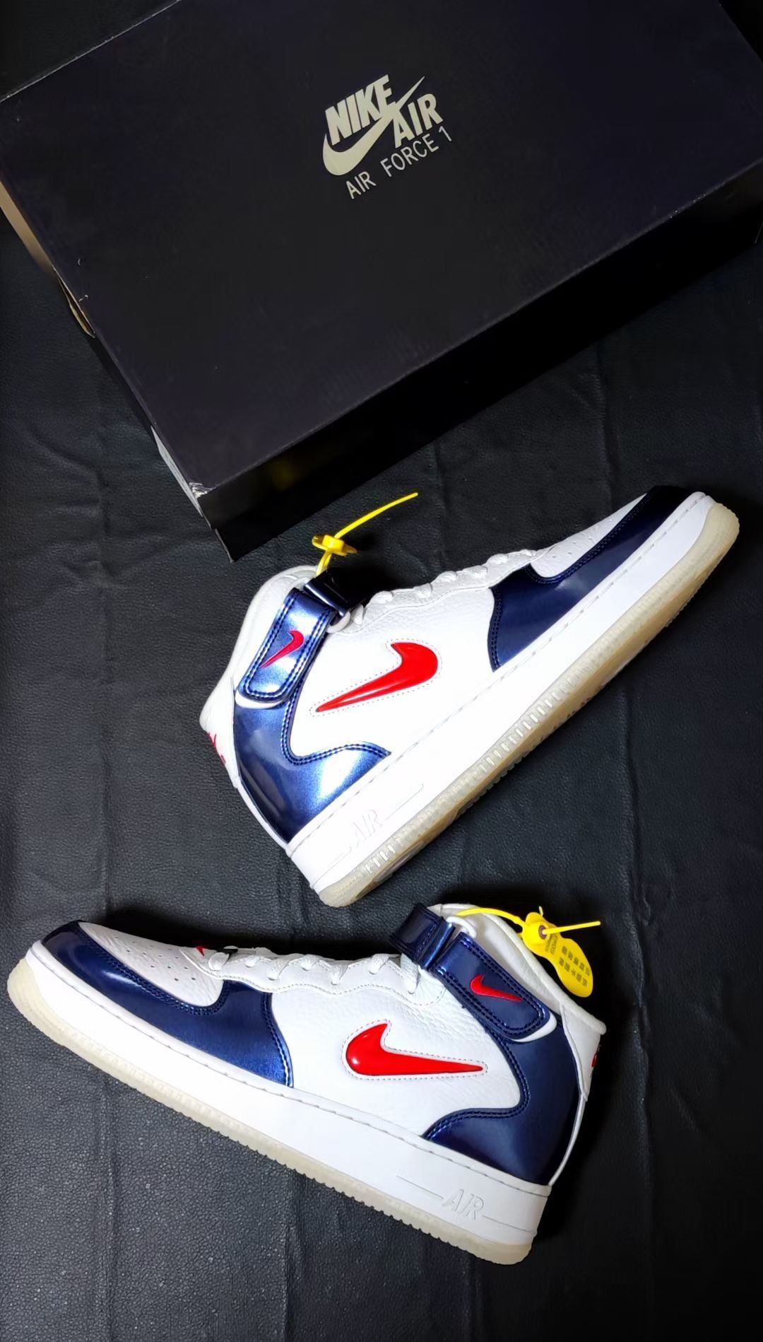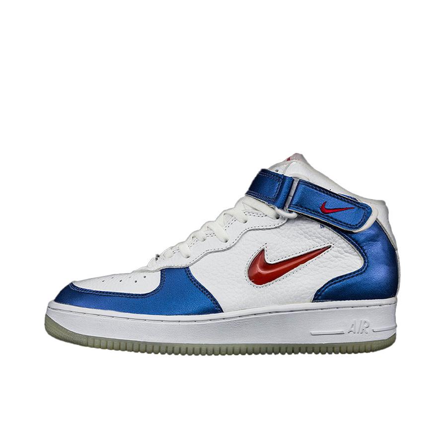 Nike Air Force 1 耐克空军一号 板鞋 外观设计 这双 Nike Air Force 1 Mid(中帮)以经典的空军一号轮廓为基底,通过色彩碰撞与材质拼接重塑复古潮流: - 色彩搭配:白(皮革鞋面)+ 藏蓝(漆皮/亮面革)+ 红(Swoosh、后跟Logo),致敬“USA”主题的经典红白蓝组合,视觉冲击力强烈,兼具美式复古与街头活力。 - 材质细节: - 鞋面:白色部分为...