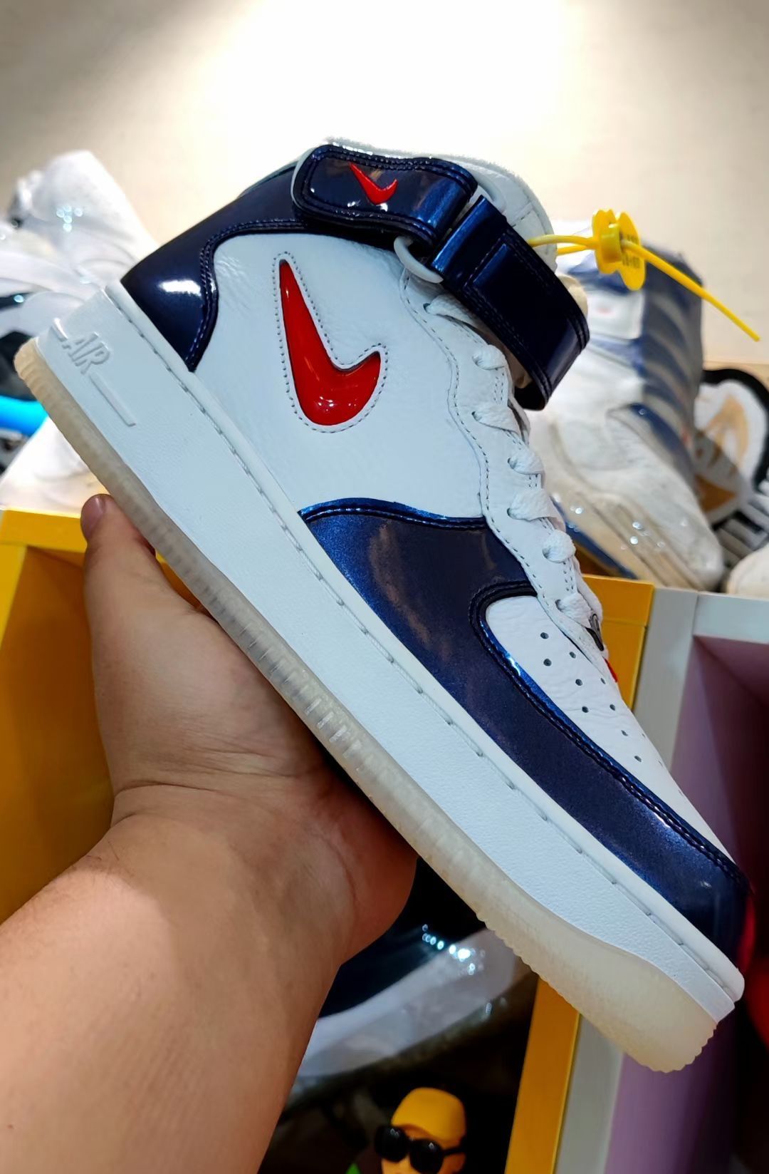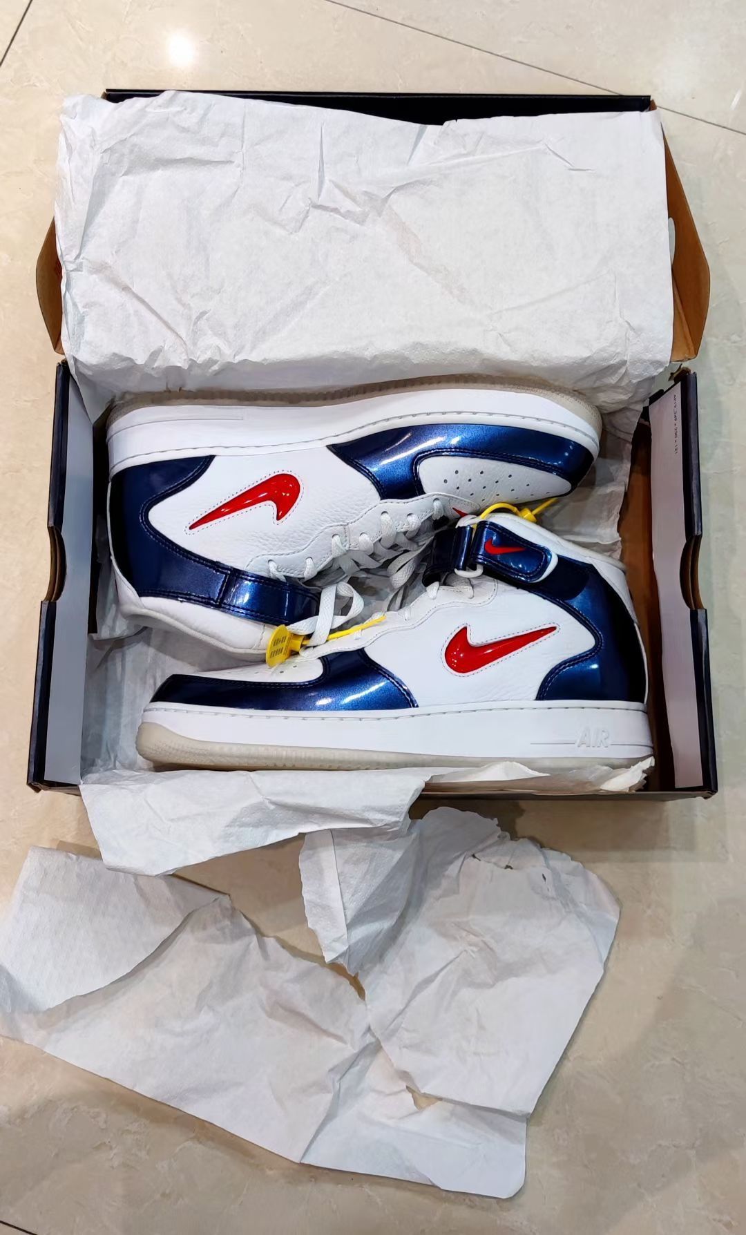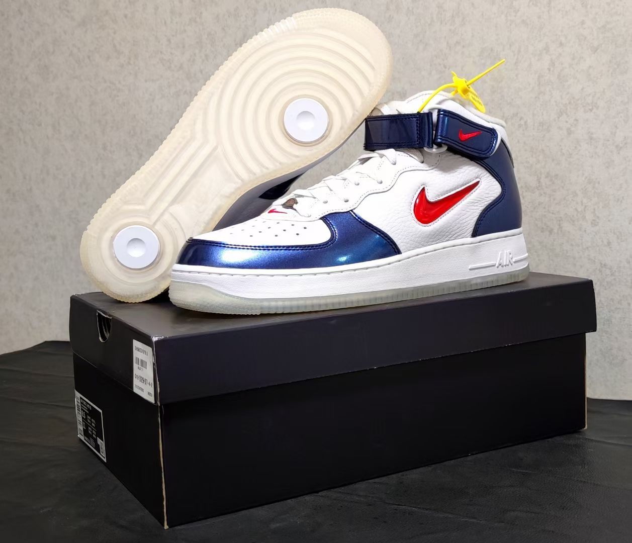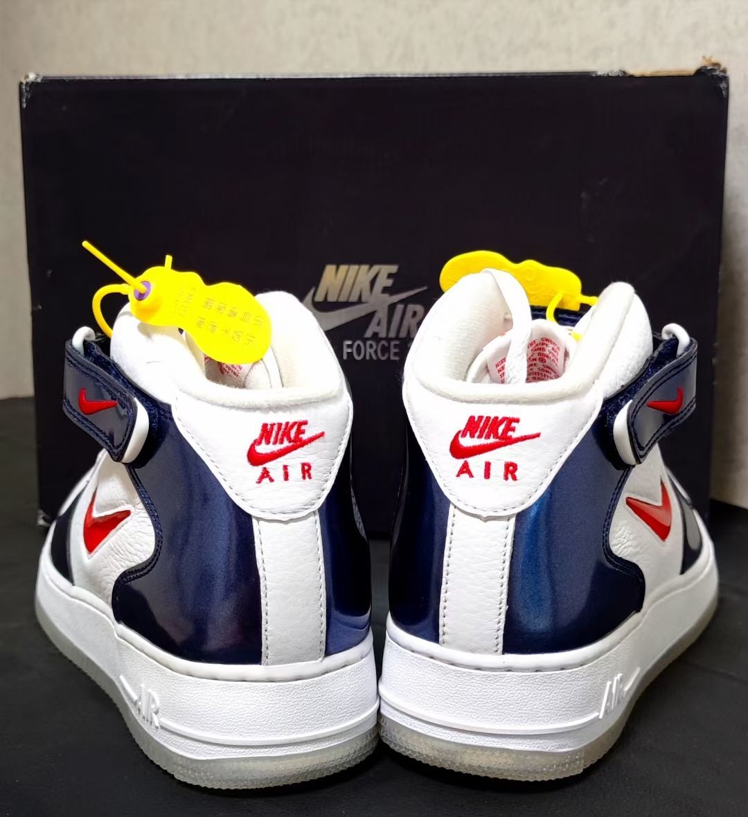 Nike Air Force 1 耐克空军一号 板鞋 外观设计 这双 Nike Air Force 1 Mid(中帮)以经典的空军一号轮廓为基底,通过色彩碰撞与材质拼接重塑复古潮流: - 色彩搭配:白(皮革鞋面)+ 藏蓝(漆皮/亮面革)+ 红(Swoosh、后跟Logo),致敬“USA”主题的经典红白蓝组合,视觉冲击力强烈,兼具美式复古与街头活力。 - 材质细节: - 鞋面:白色部分为...
