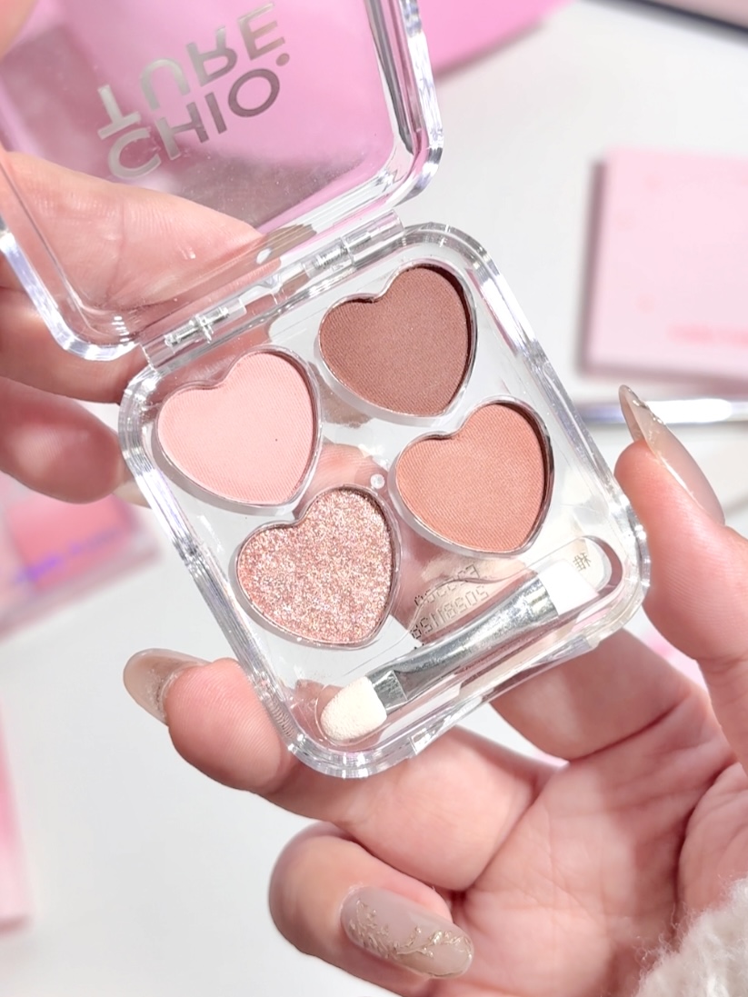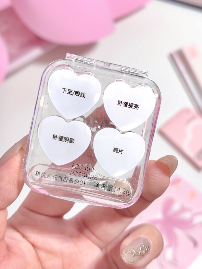 谁懂这盘爱心卧蚕盘也太会了吧💖 四个颜色全是温柔挂的,哑光打底+细闪提亮,新手也能画出妈生感卧蚕! 浅粉色铺卧蚕基底,棕棕色加深轮廓,橘棕色过渡眼尾,碎钻闪片点在眼中,眼睛瞬间圆溜溜又无辜~ 透明壳+爱心压纹,颜值高到想揣在包里天天带!