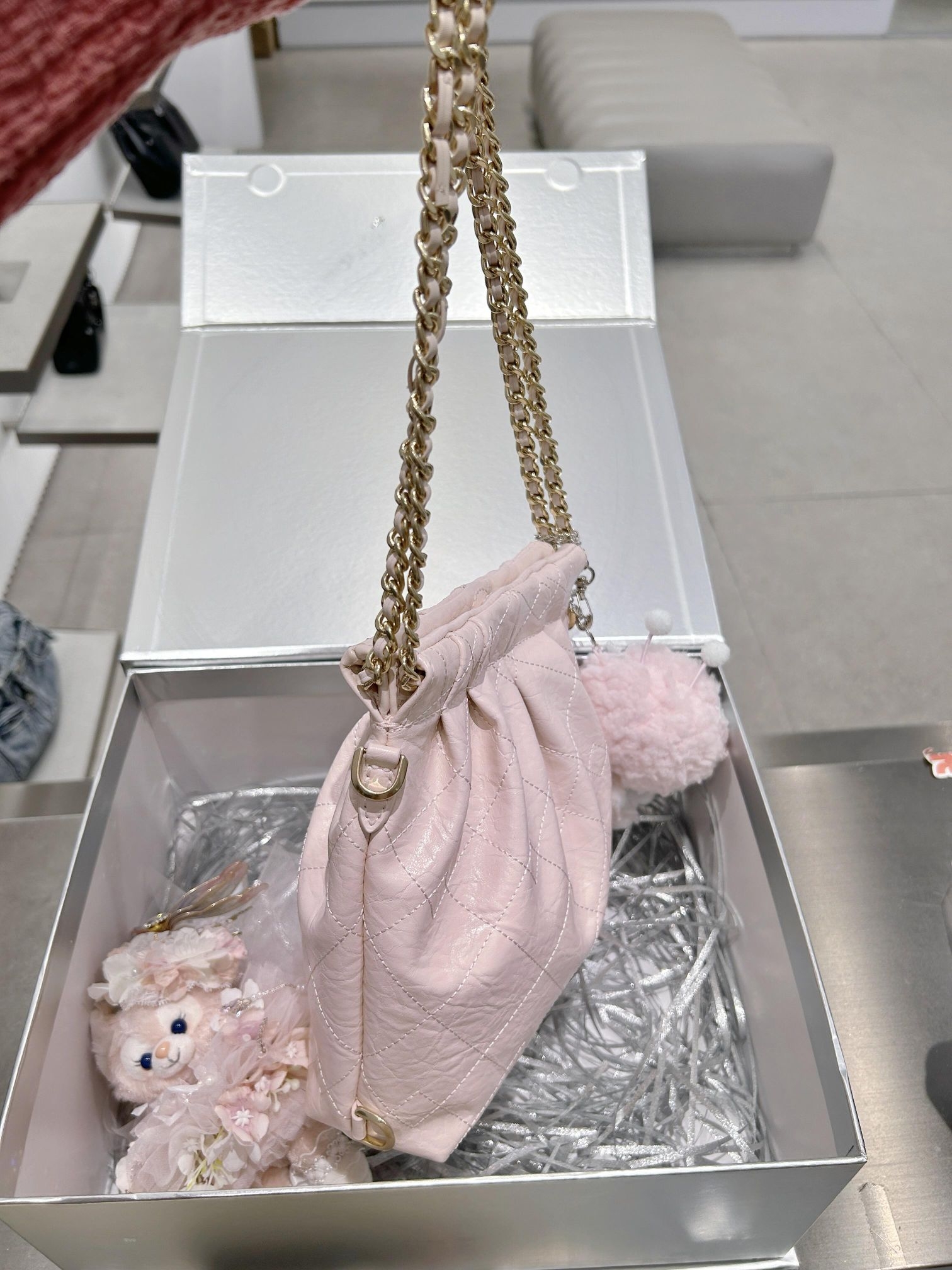 论有一个vip的闺蜜帮忙排队多幸福,昨天就拿到了新出的柔粉色🫧小流浪包,今天才有空和大家分享,这个颜色真的太嫩了,实物偏一点点奶粉色,像块儿草莓蛋糕🍰,实物细节很有质感。光线充足的时候会嫩白,正常光线下就是奶呼呼的柔粉色~斜背很可爱,容量放下 promax、粉饼和太阳伞⛱️可以嘟~搭配毛衣或者浅色外套都好看,喜欢可爱链条包的大满足!!