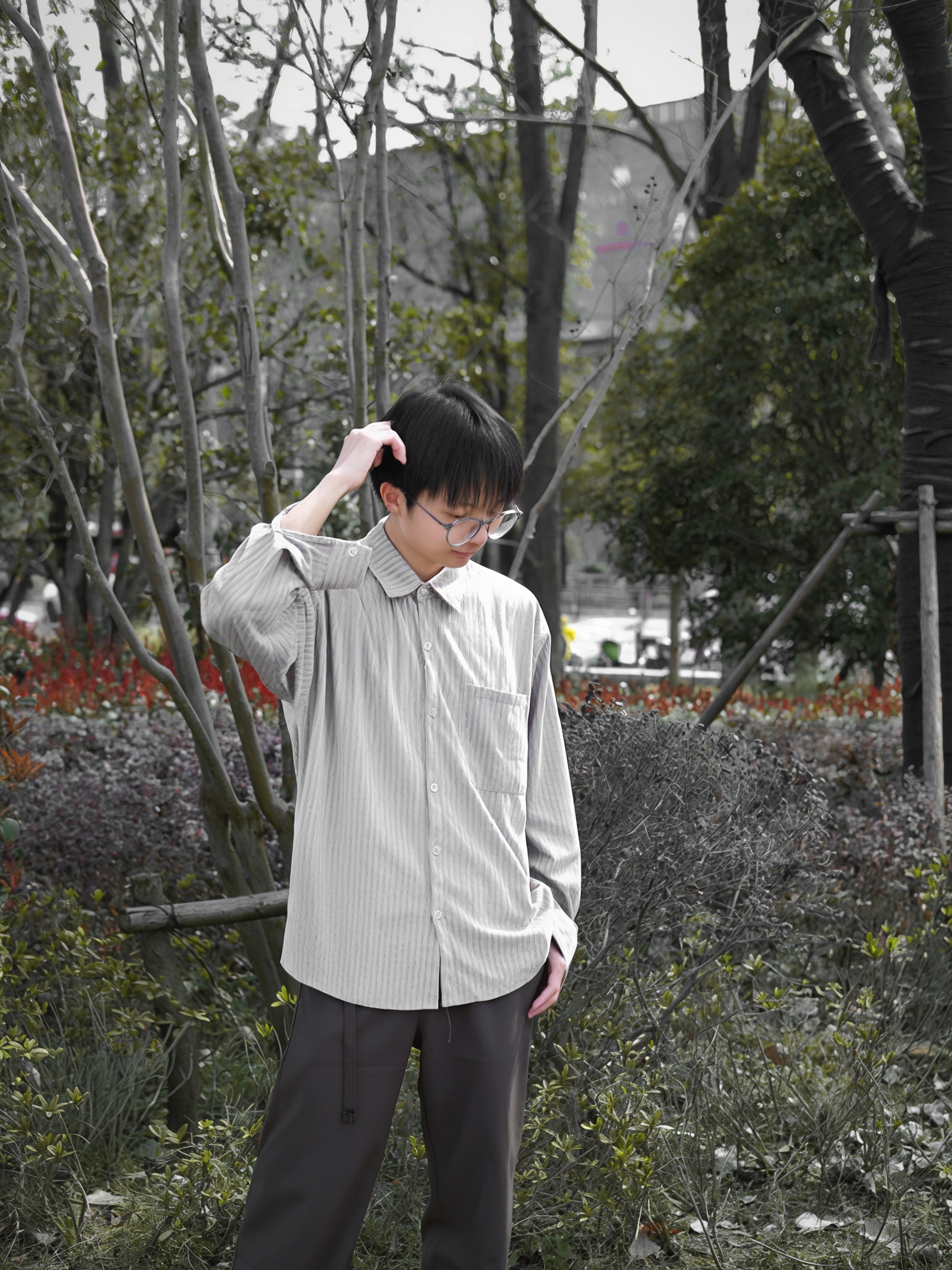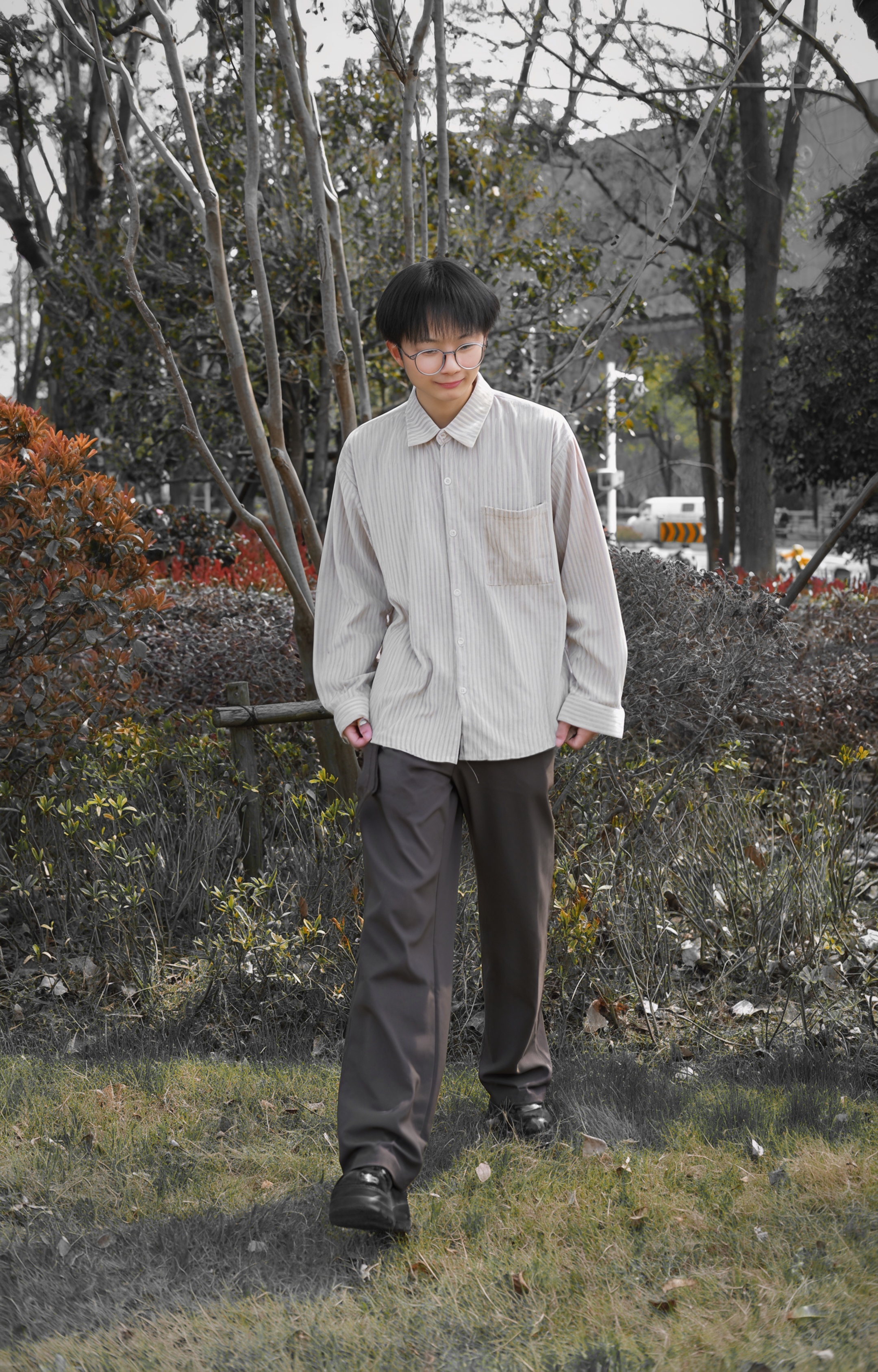 我觉得春天就该穿得清清爽爽,这件浅条纹衬衫刚好接住了春风的温度,站在树影里,连呼吸都慢了下来。 我喜欢这种不费力的松弛感,不用刻意打扮,也能和眼前的绿意好好相处。