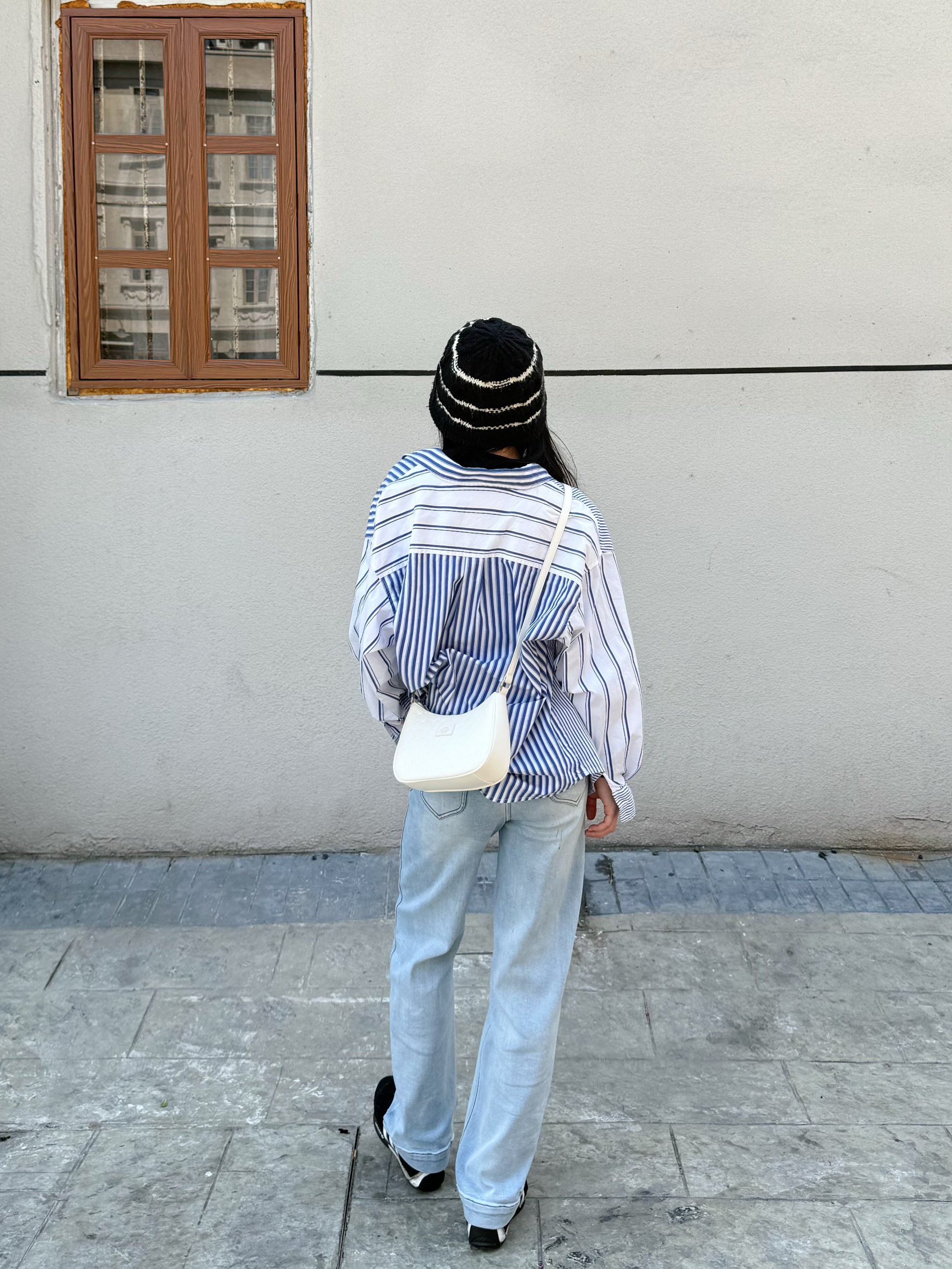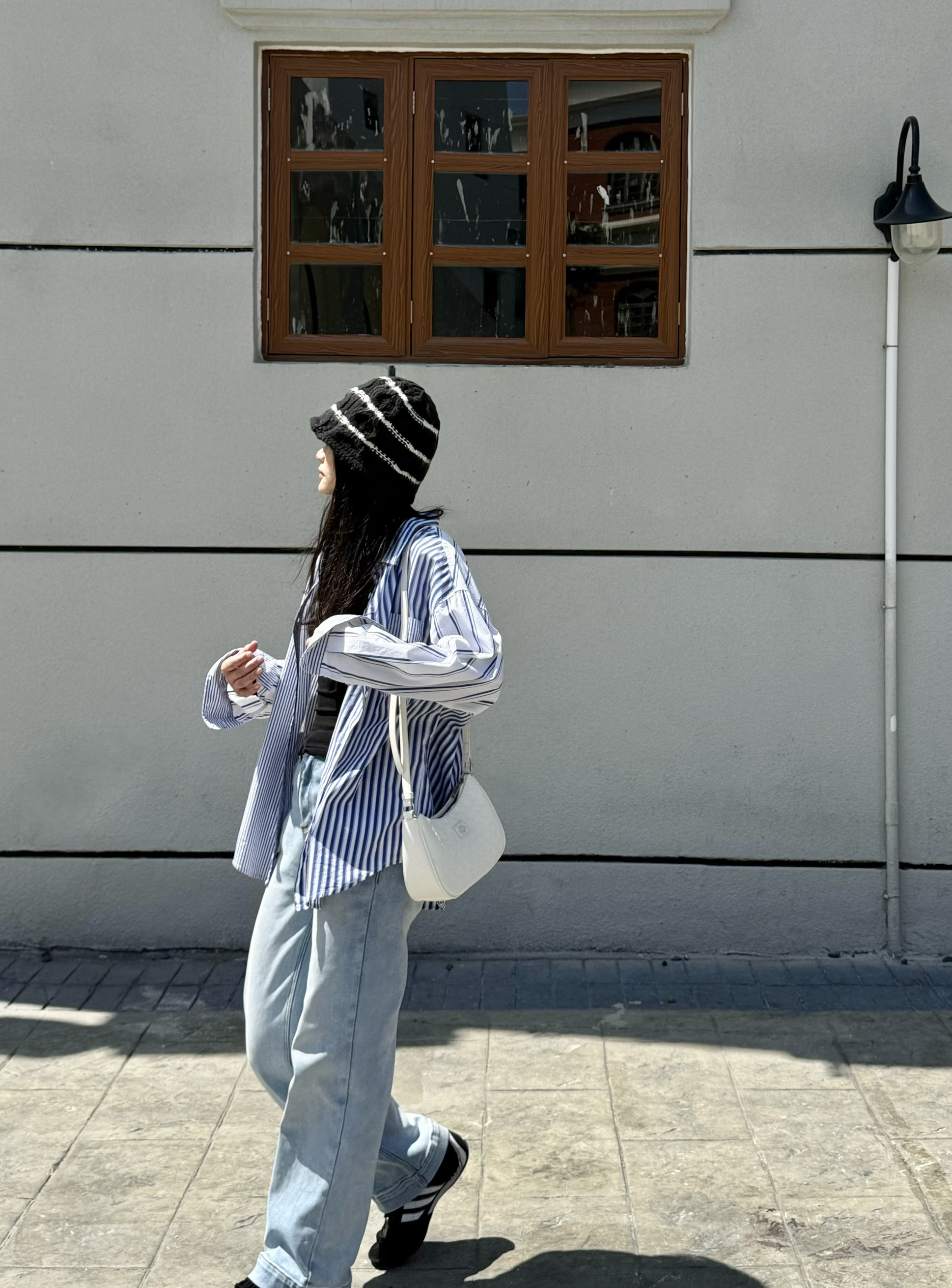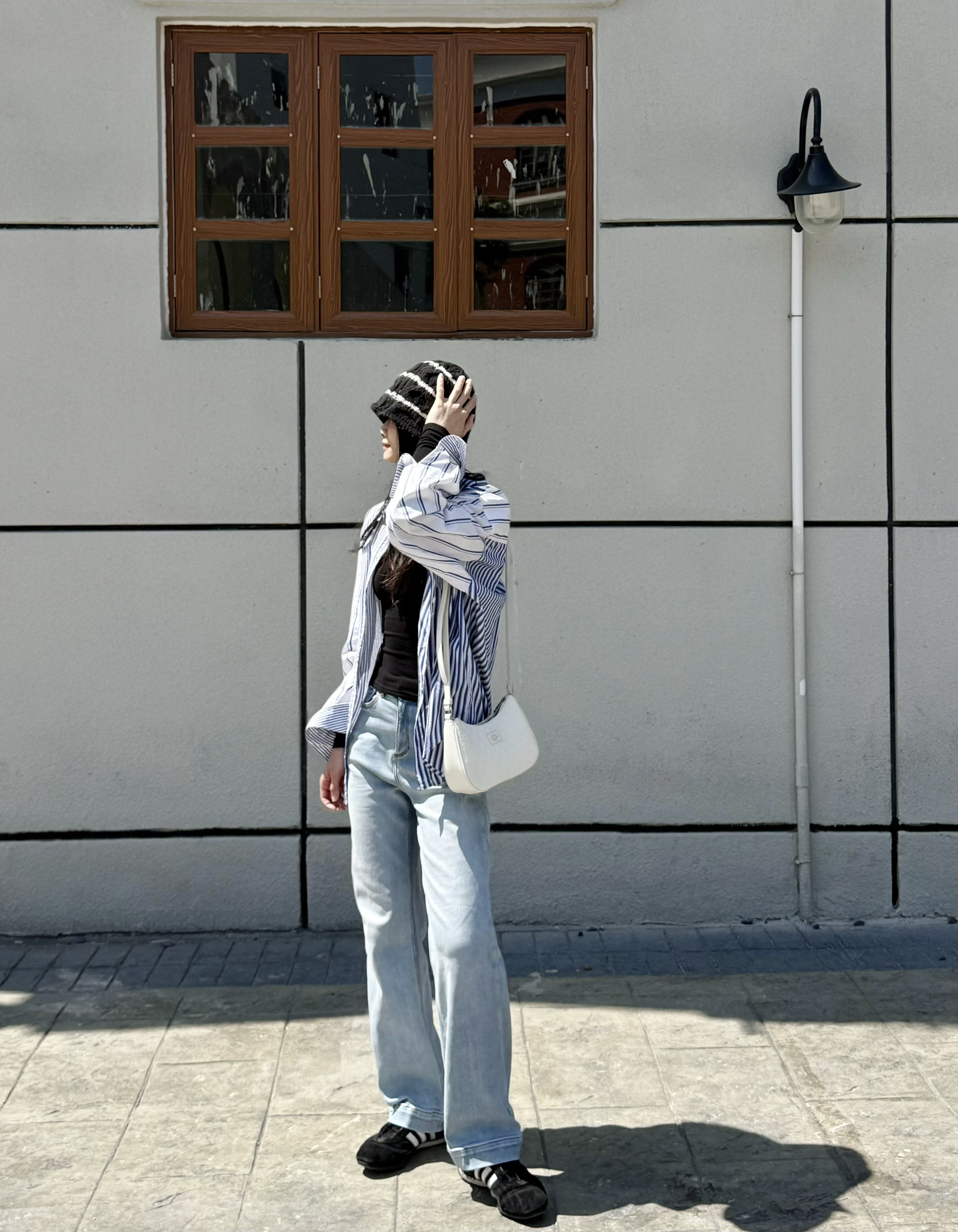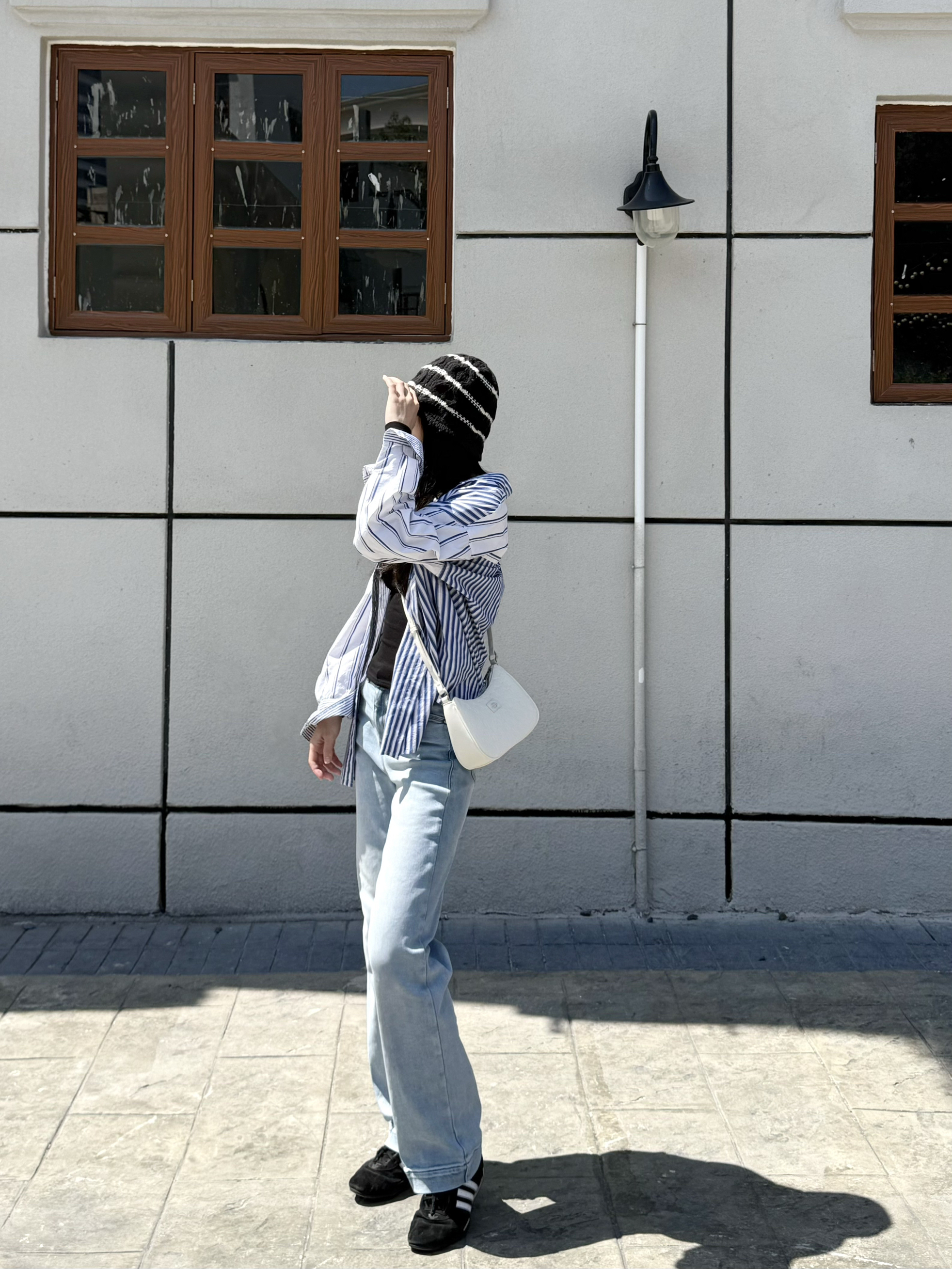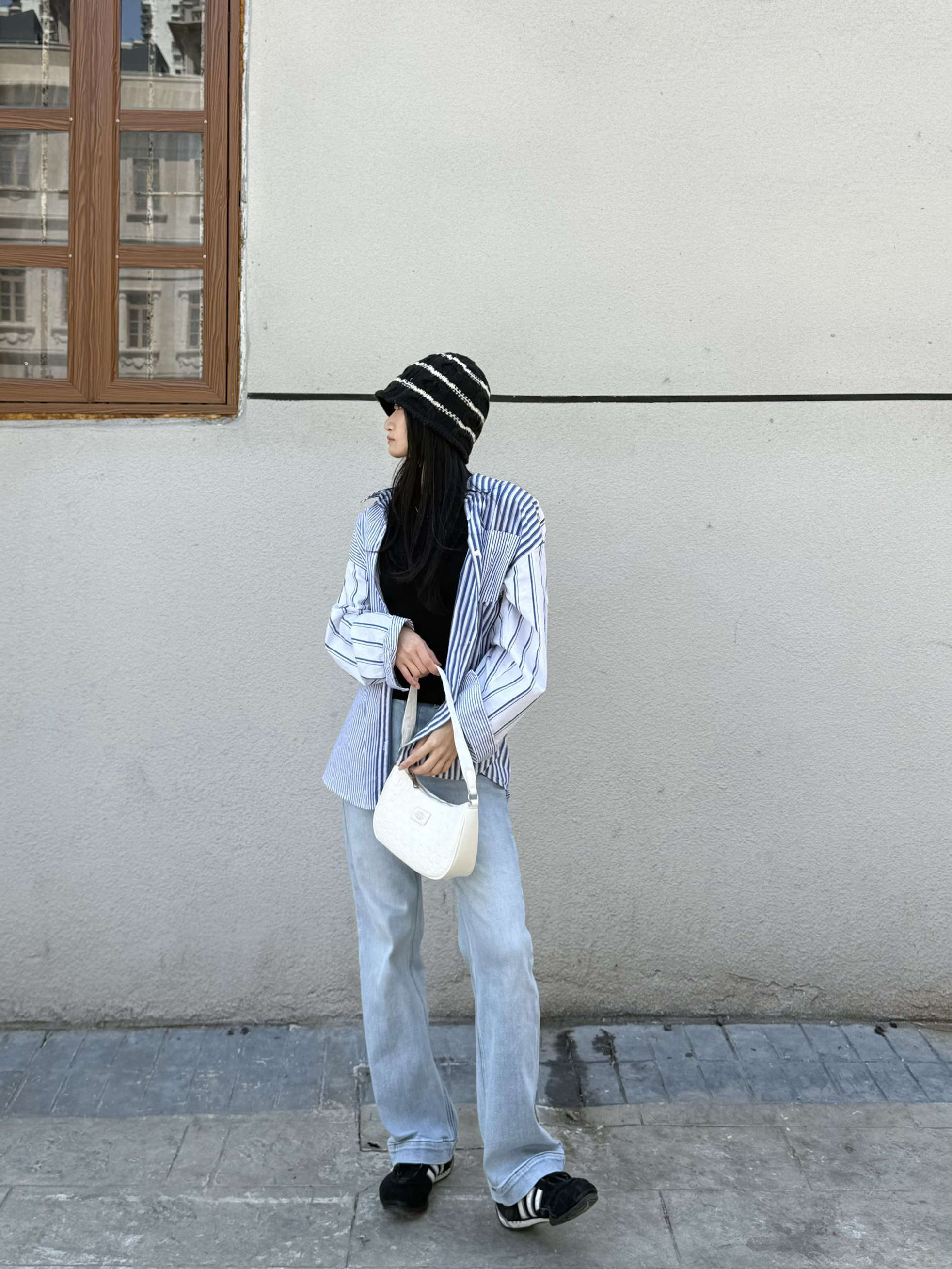今日人设 氧气韩女感~ 蓝白黑配色简直太出片了!!! 谁懂 蓝色格子衫➕浅色牛仔裤 ➕黑色保龄球鞋 搭配上 Dickies 白色腋下包🤍 拿捏韩女氛围感✨