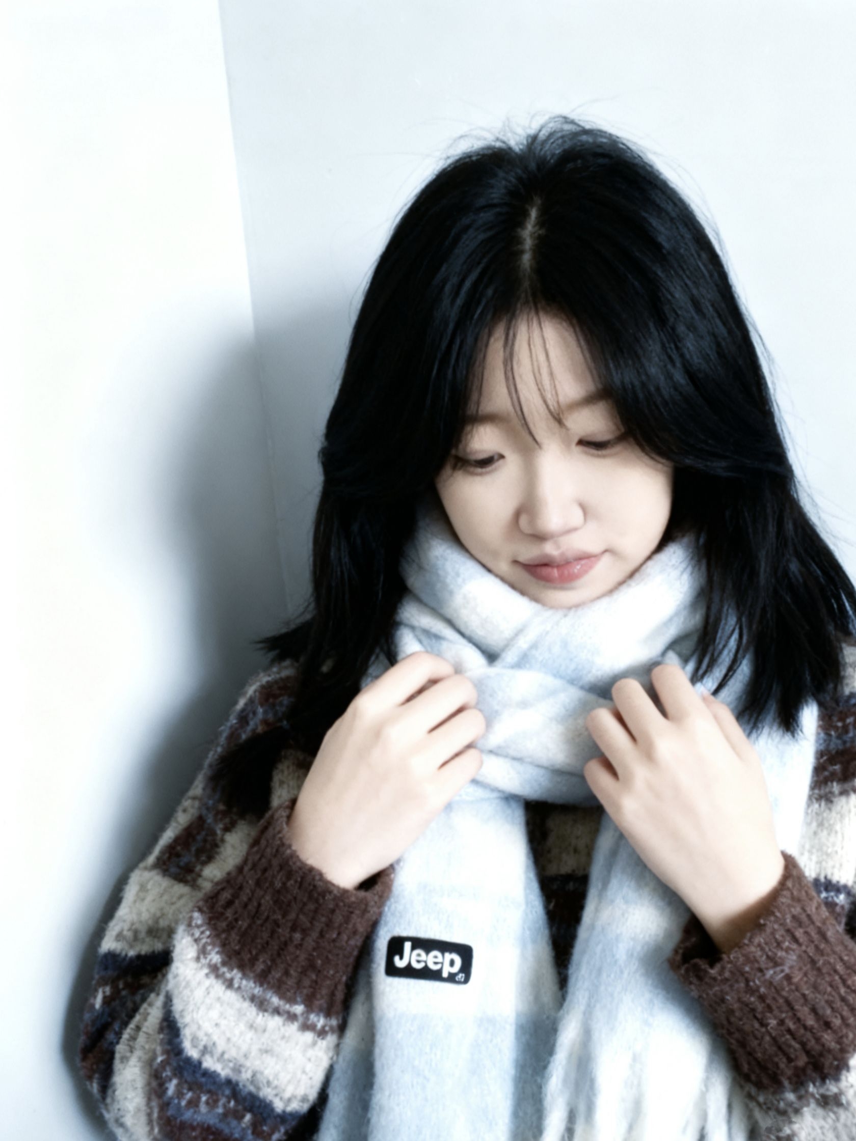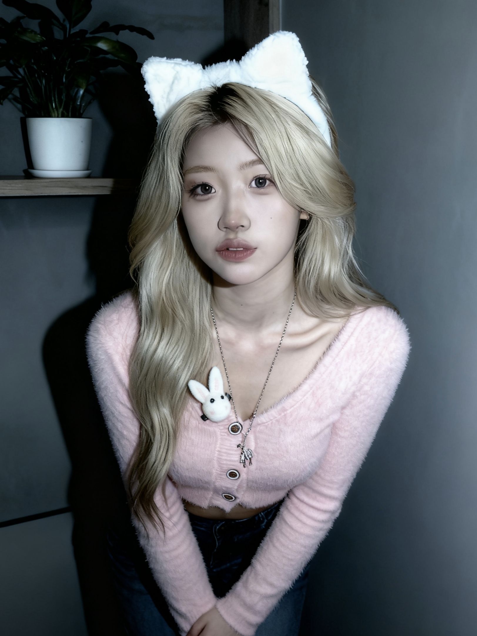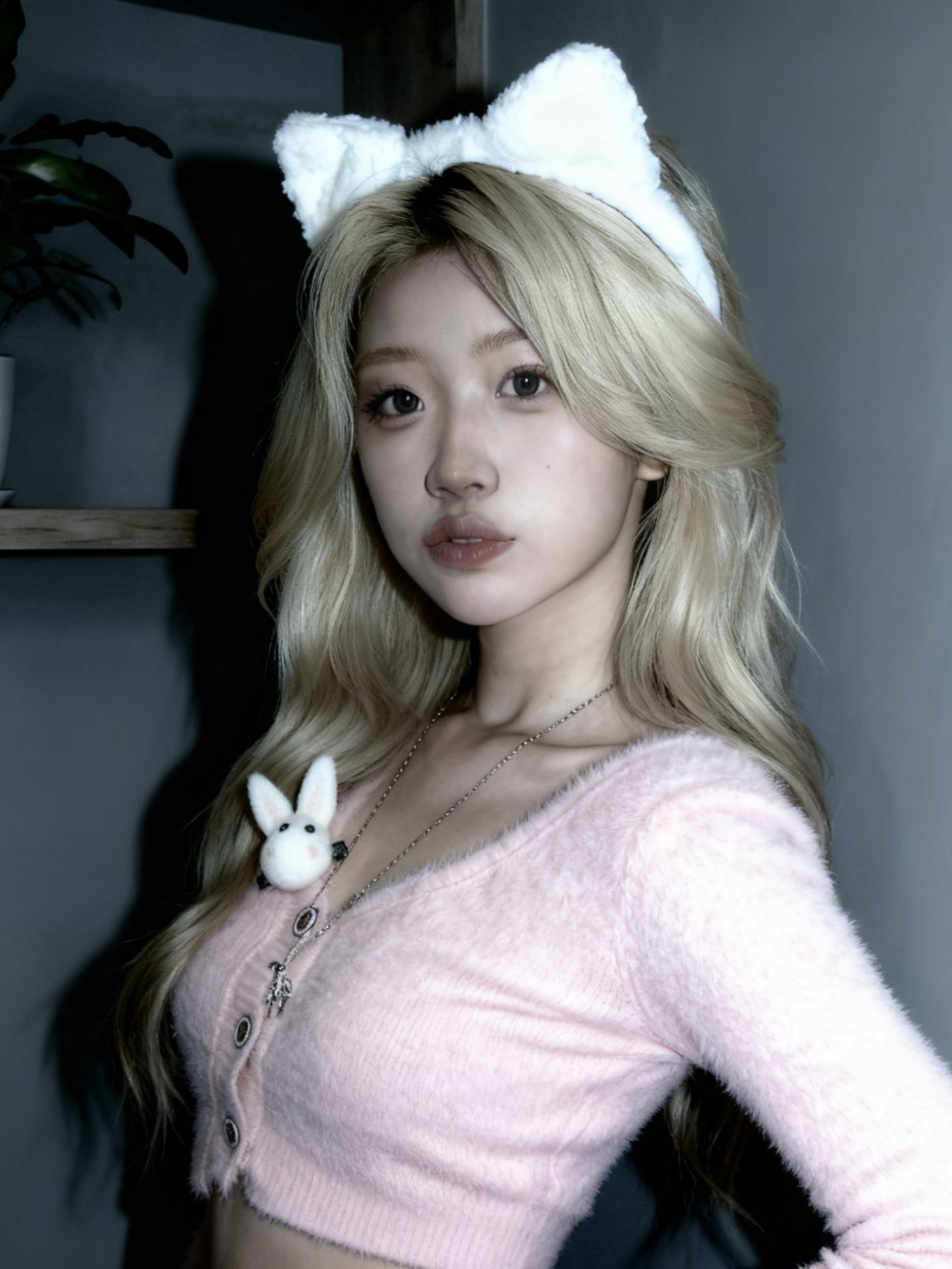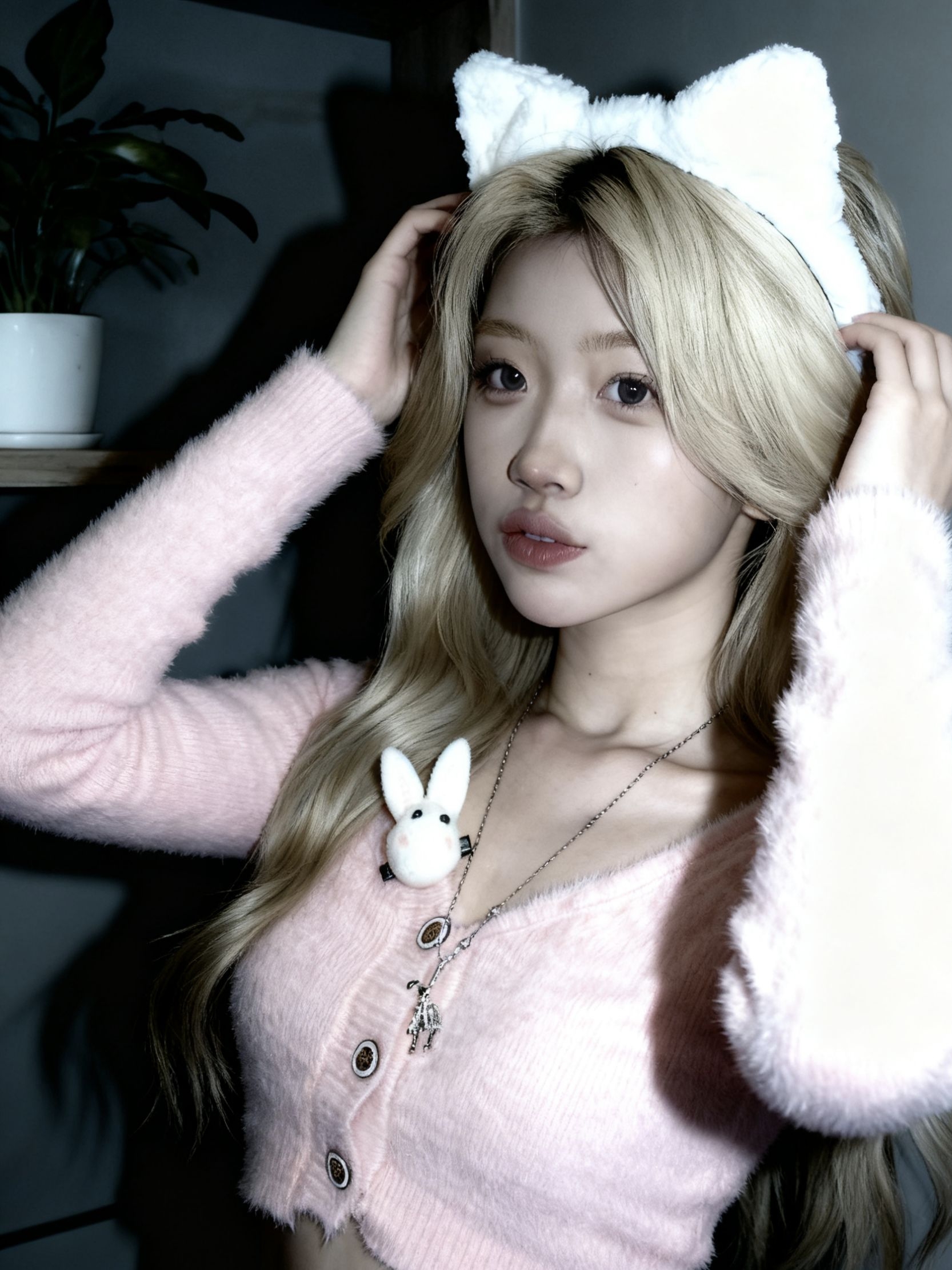 浅金发色和白色猫耳发箍, 粉色毛绒短款上衣温柔又显比例,胸前的小兔别针是点睛之笔,甜妹感十足。 冷调光线衬得整个人又软又清冷,是让人一眼就沦陷的猫系少女感,慵懒又可爱。