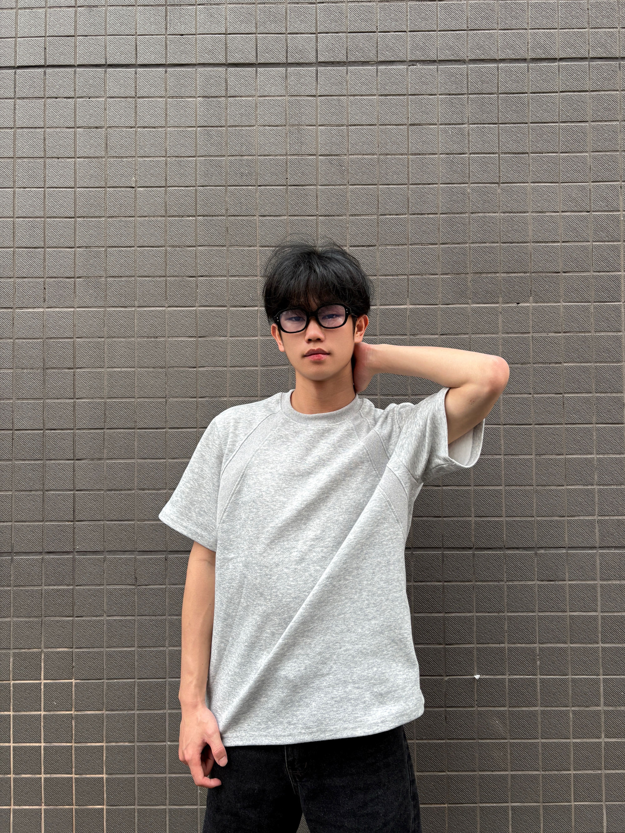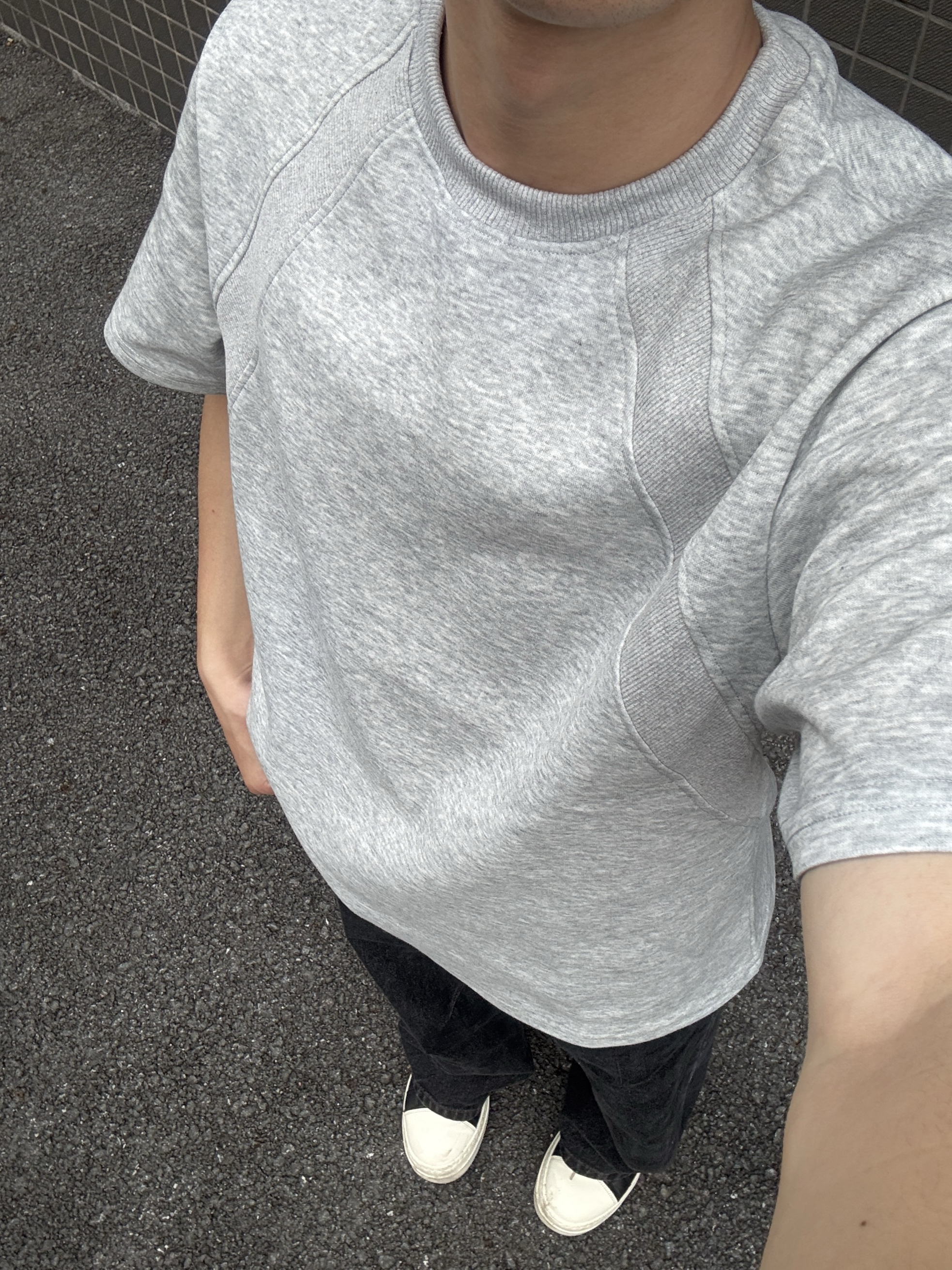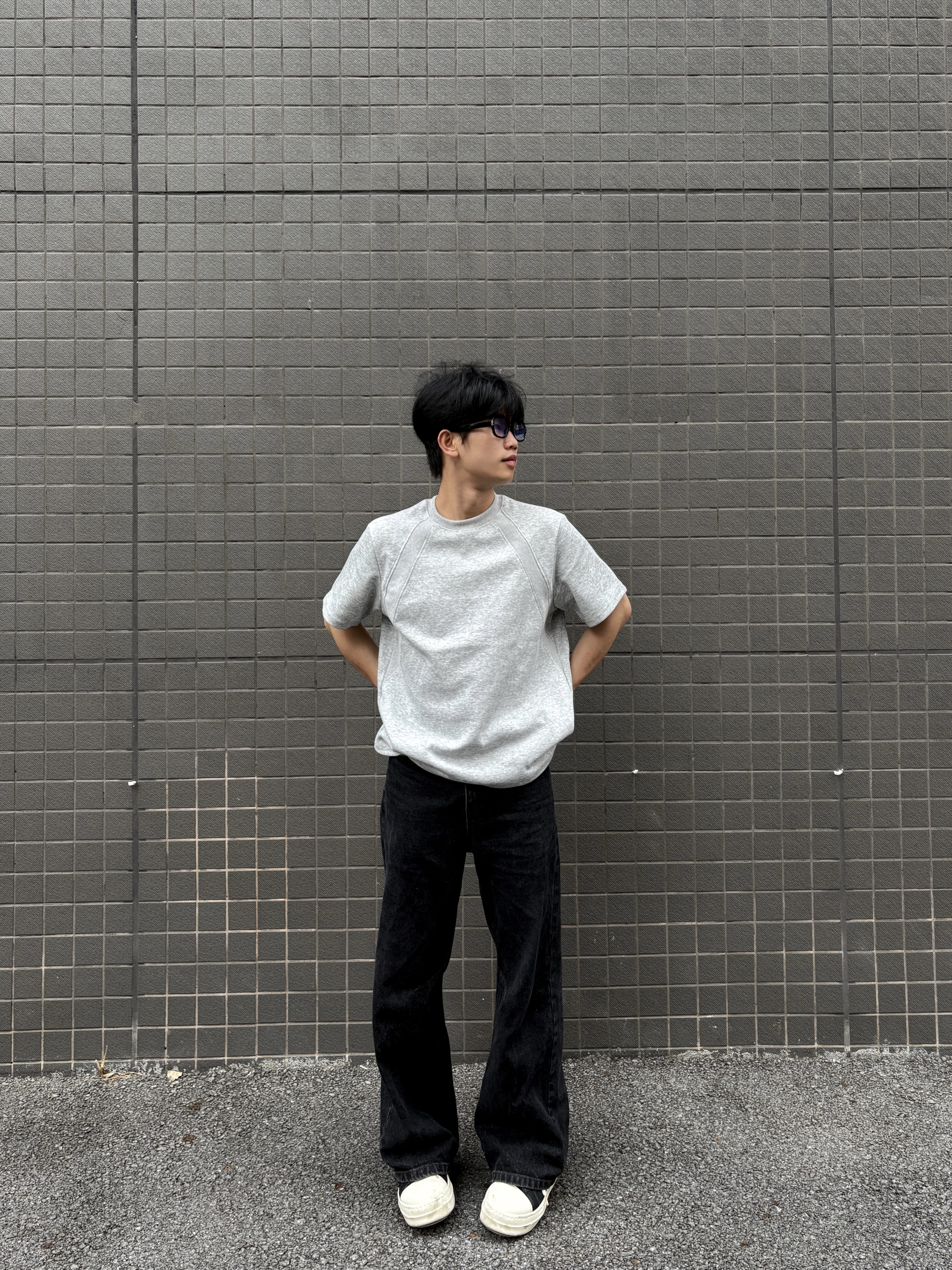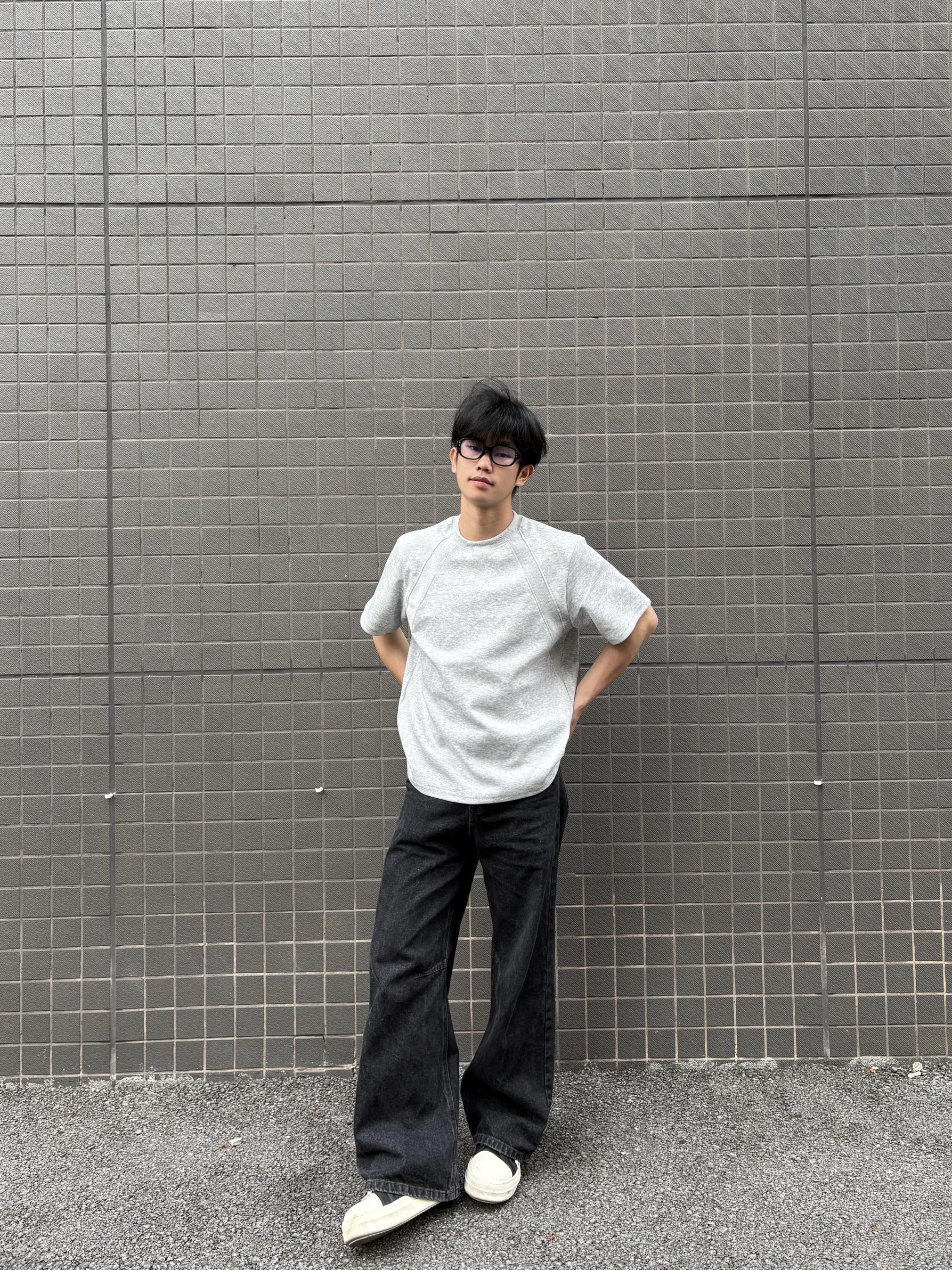 上身这件太空棉空气层短袖,灰调真的太显白了,正肩boxy版型把肩线修饰得特别好看,硬挺但不闷,夏天穿也有凉感,出汗也不容易皱,健身或者日常通勤都能穿。 下身搭了一条做旧黑牛仔裤,宽松的裤型和短款上衣刚好呼应,美式街头感直接拉满👖