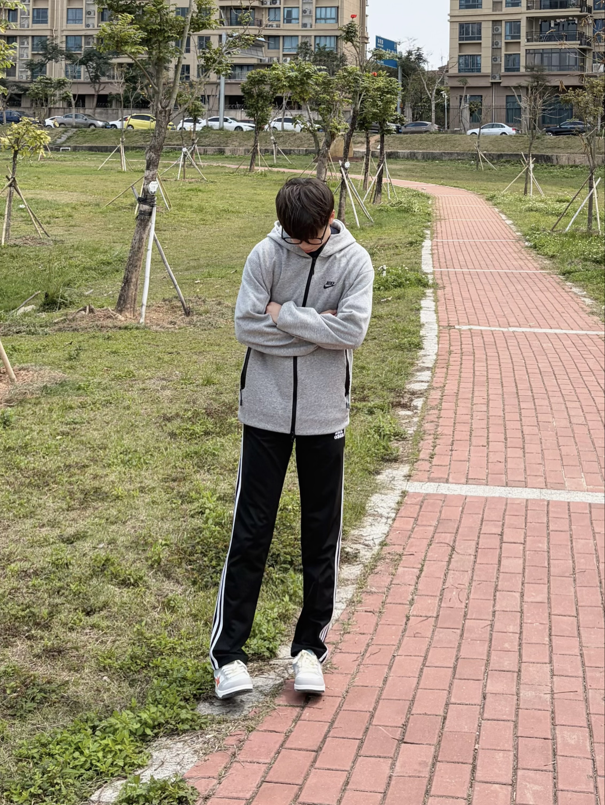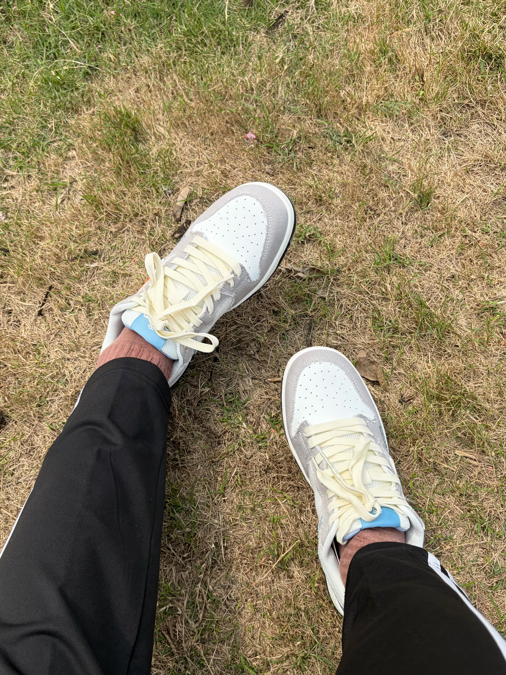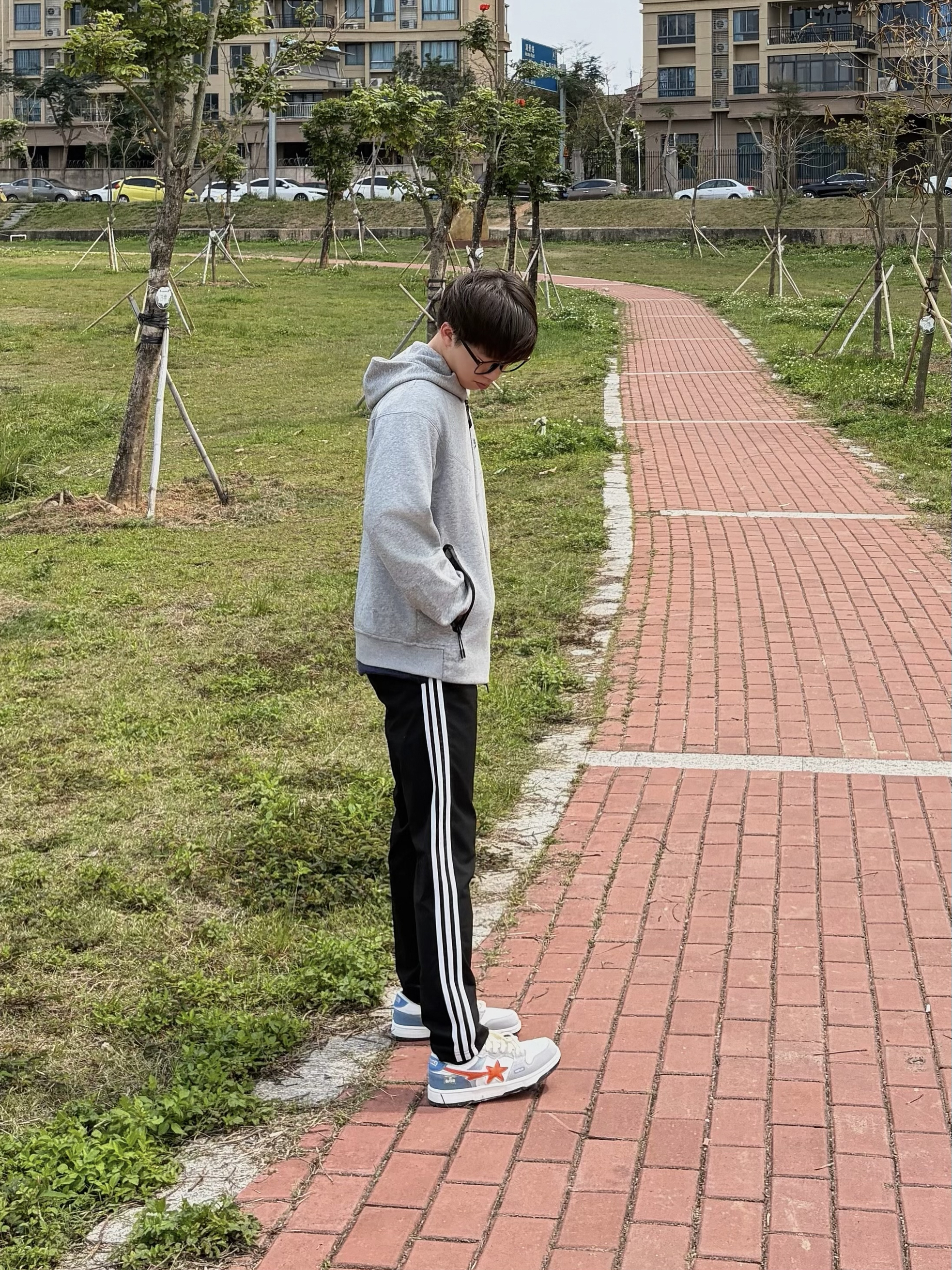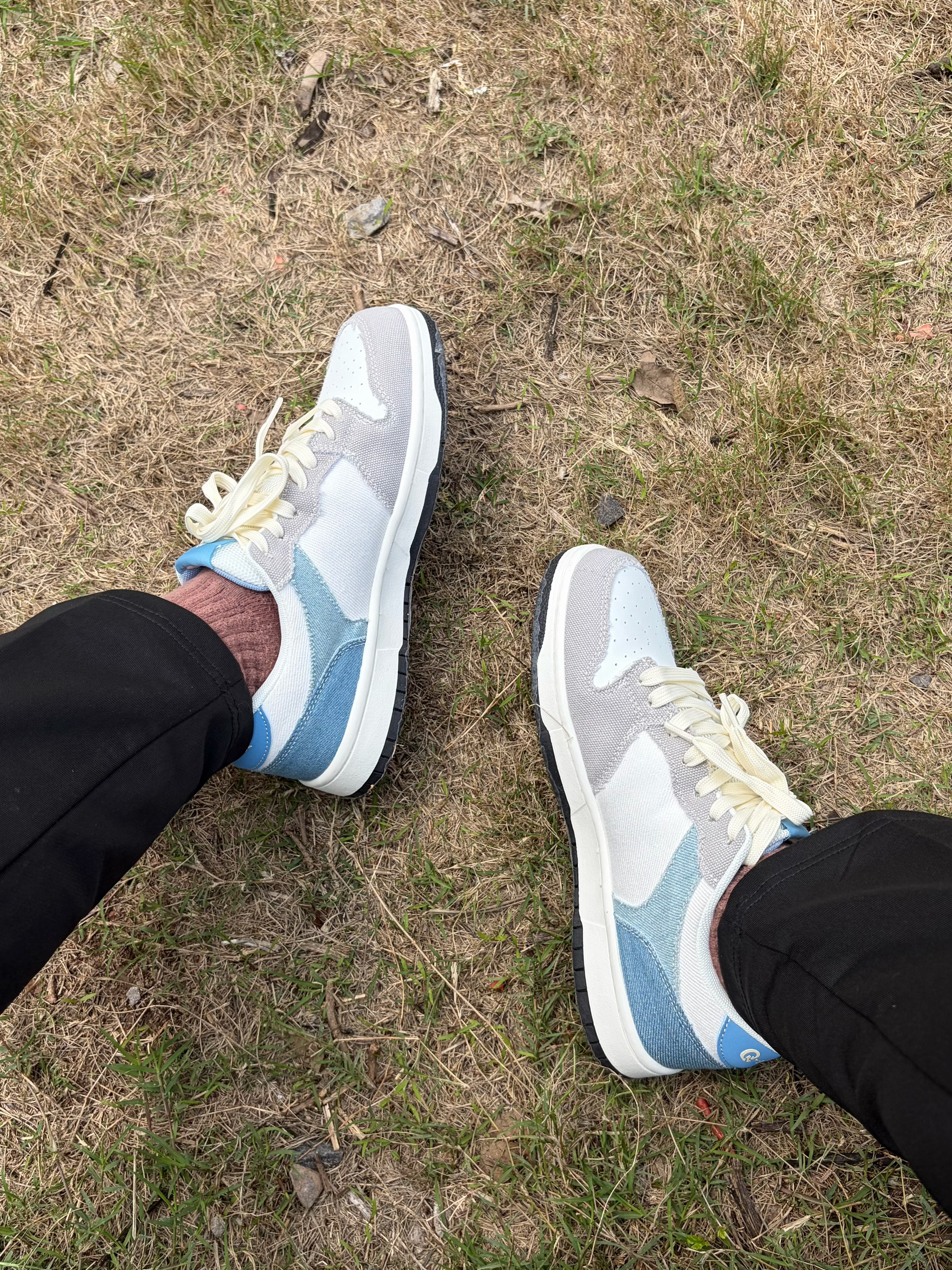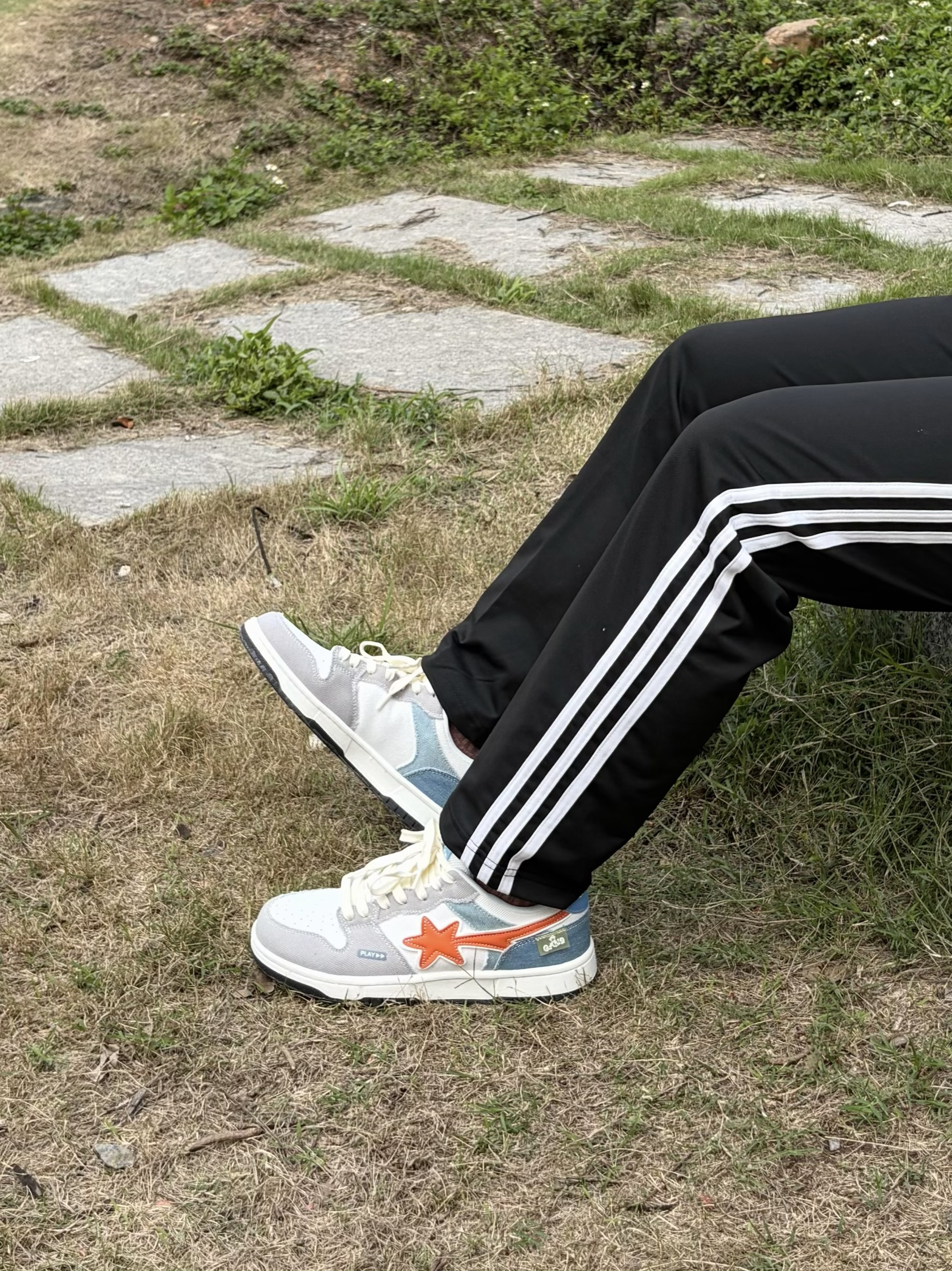 开春日上脚了 Q-AND 这双拼色板鞋👟 电光橙配色星星🌟点缀出街头感🕶️ 鞋面用牛仔布与灰调碰撞活🔥 内置缓震MD底踩上去软弹舒适🤩 穿上后走再久也不累脚 搭配灰连帽衫👔与条纹运动裤👖 是学生党日常出街的舒服选择