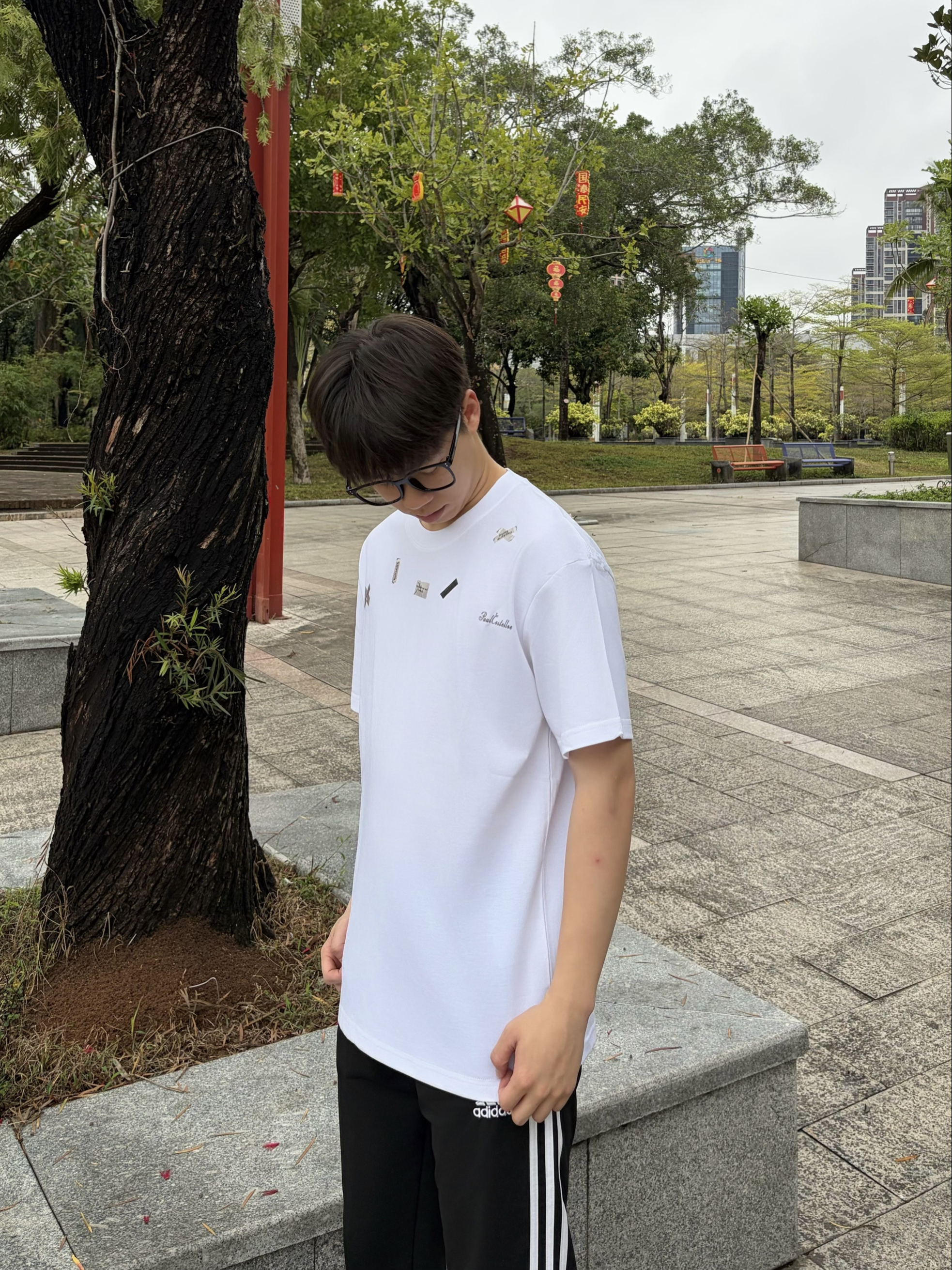 春日衣柜里总缺一件靠谱的打底 这件 PAUL COSTELLOE保罗.科斯特洛 白T👔正中我意 颜值简约时尚🕶️ 纯棉面料软糯亲肤🔥 落肩版型穿上后宽松又舒适 搭条侧边条纹运动裤👖 早春简单出门也很有范儿🚶