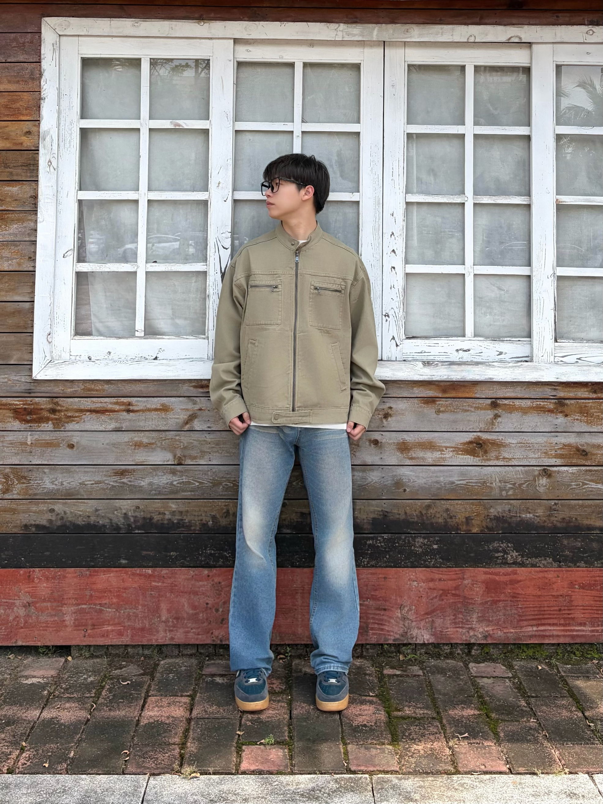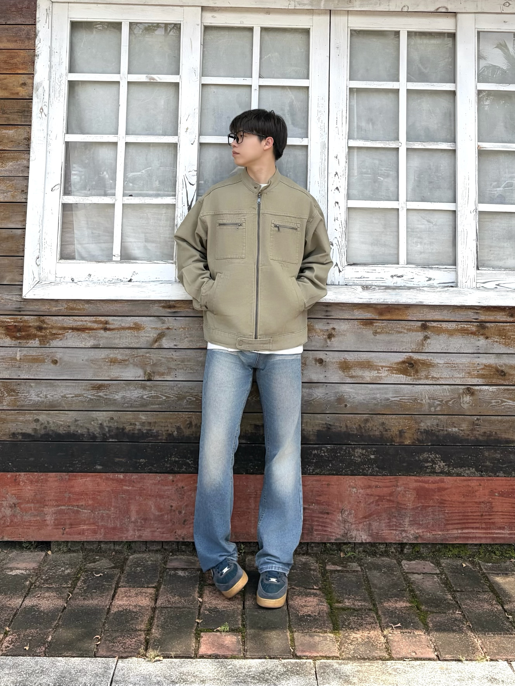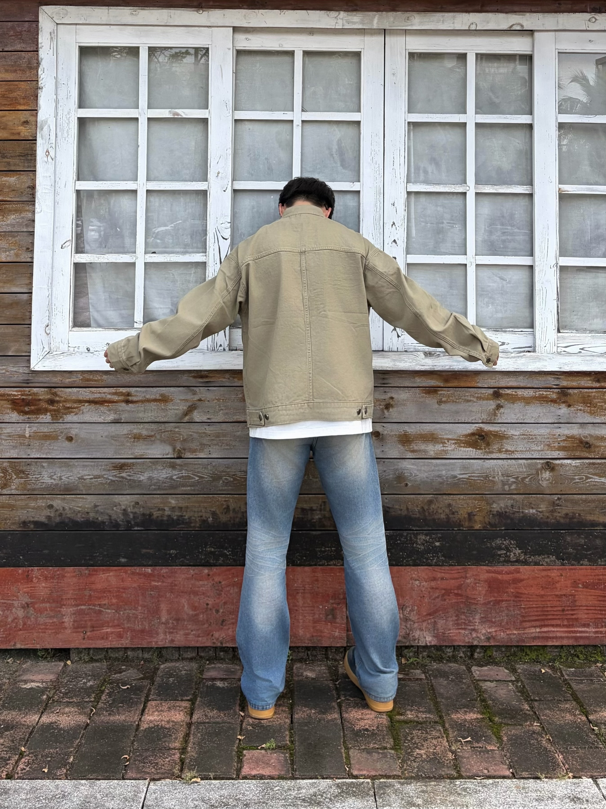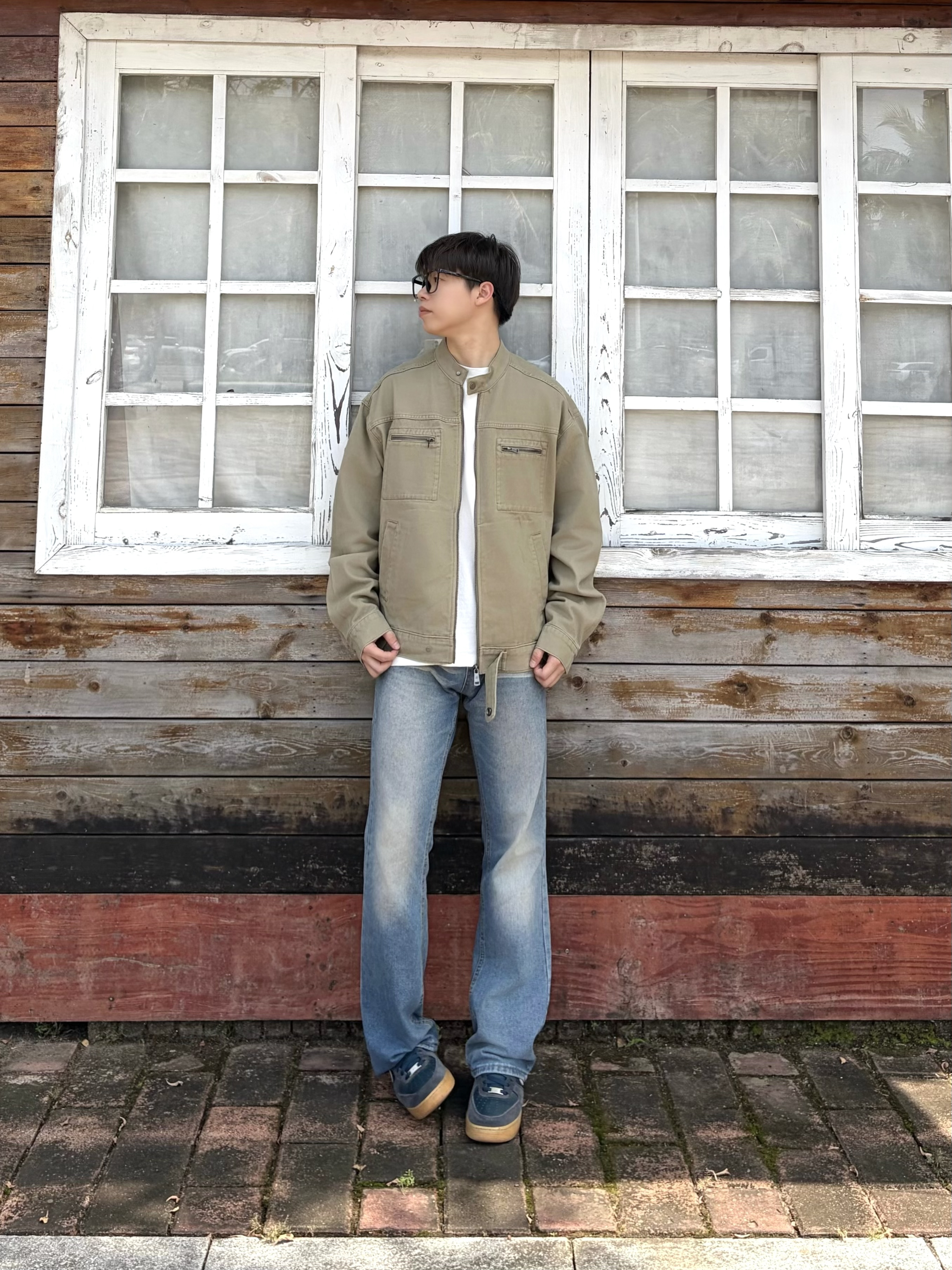 早春出门Citywalk🚶 BD.POWER UP+ 这件卡其色 哈灵顿工装夹克👔简直不要太合适🥰 立领设计利落干净✅ 胸前拉链口袋藏着复古细节 全棉帆布面料上身舒适透气🌬️ 内搭白T➕下身配浅蓝牛仔裤👖 整体造型和老木屋背景格外适配 出街就有美式cleanfit的随性自在🔥