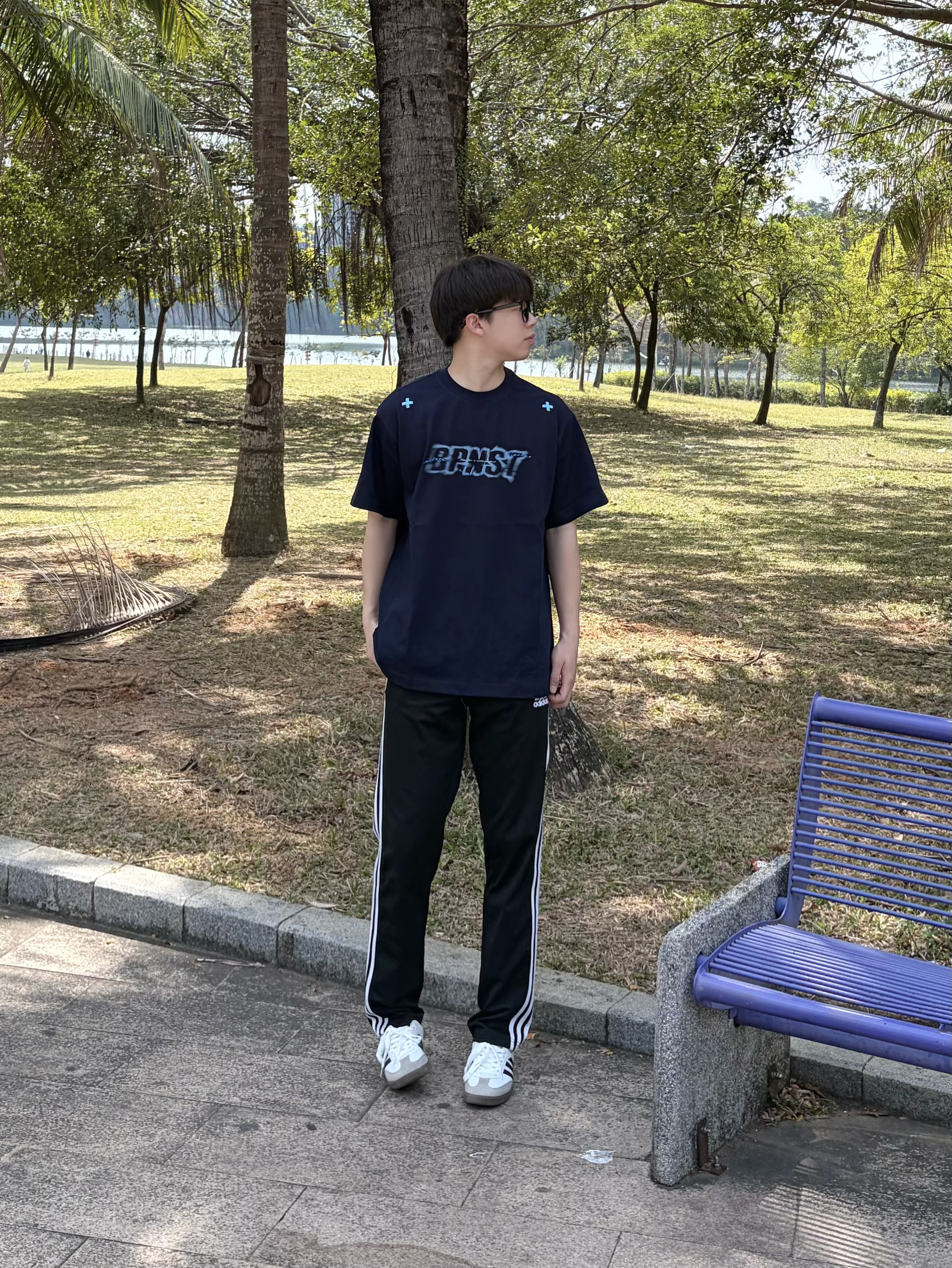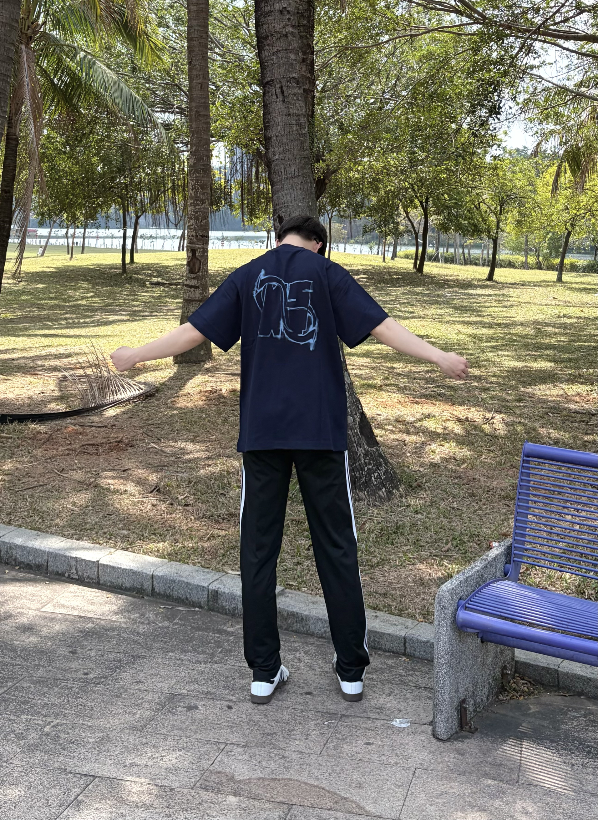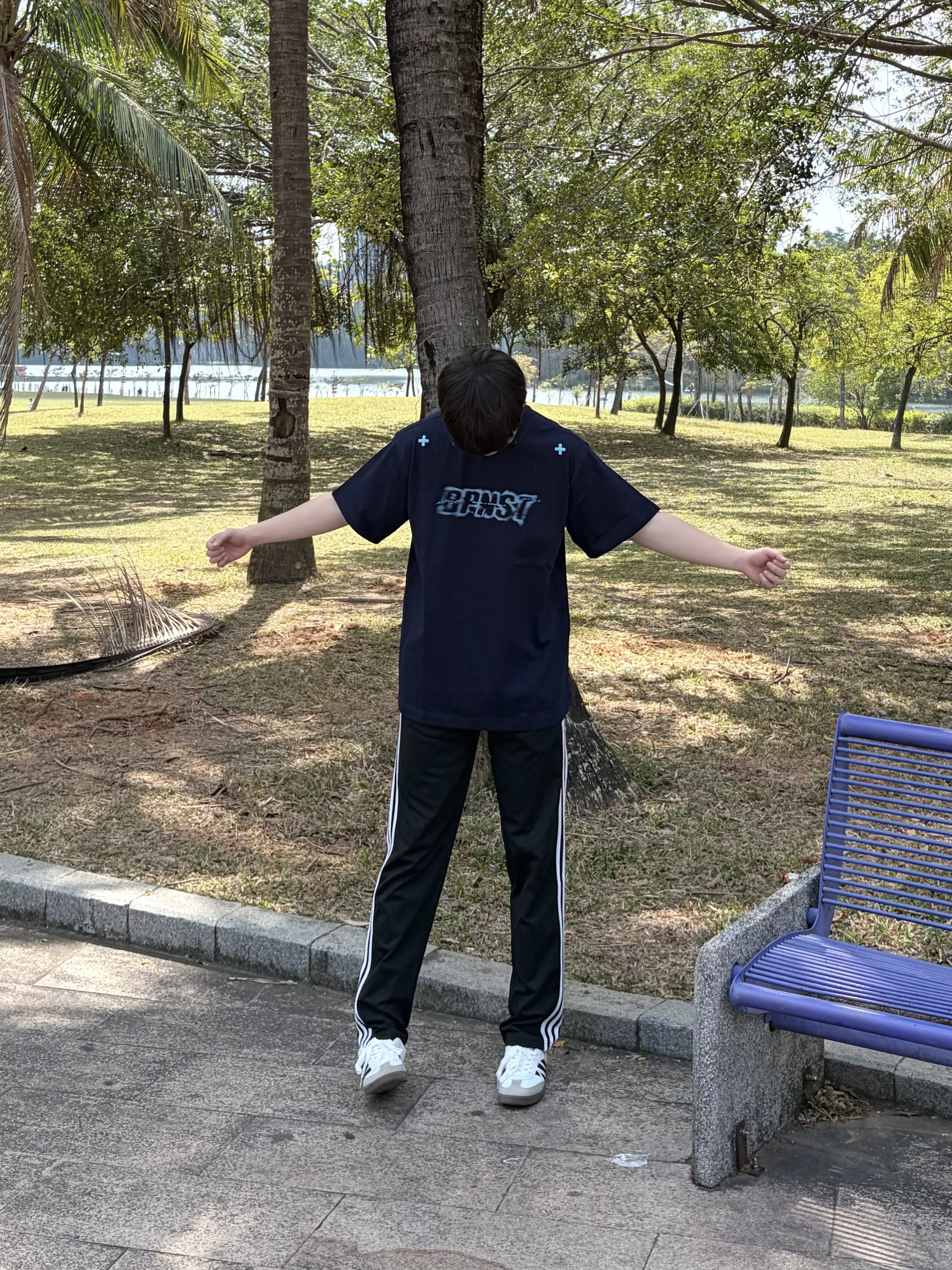 今天在公园长椅上晒着太阳发呆☀️ BIPOLAR x NSTNEW START联名 的这件藏蓝短袖👔太帅了🥰 背后的幻影直喷印花很有复古感🕶️ 肩部小十字细节很戳人 纯棉面料上身贴肤又舒服🌬️ 搭配侧边条纹运动裤👖和德训鞋👟 美式复古感拉满🔥 日常出街或散步都很合适🚶