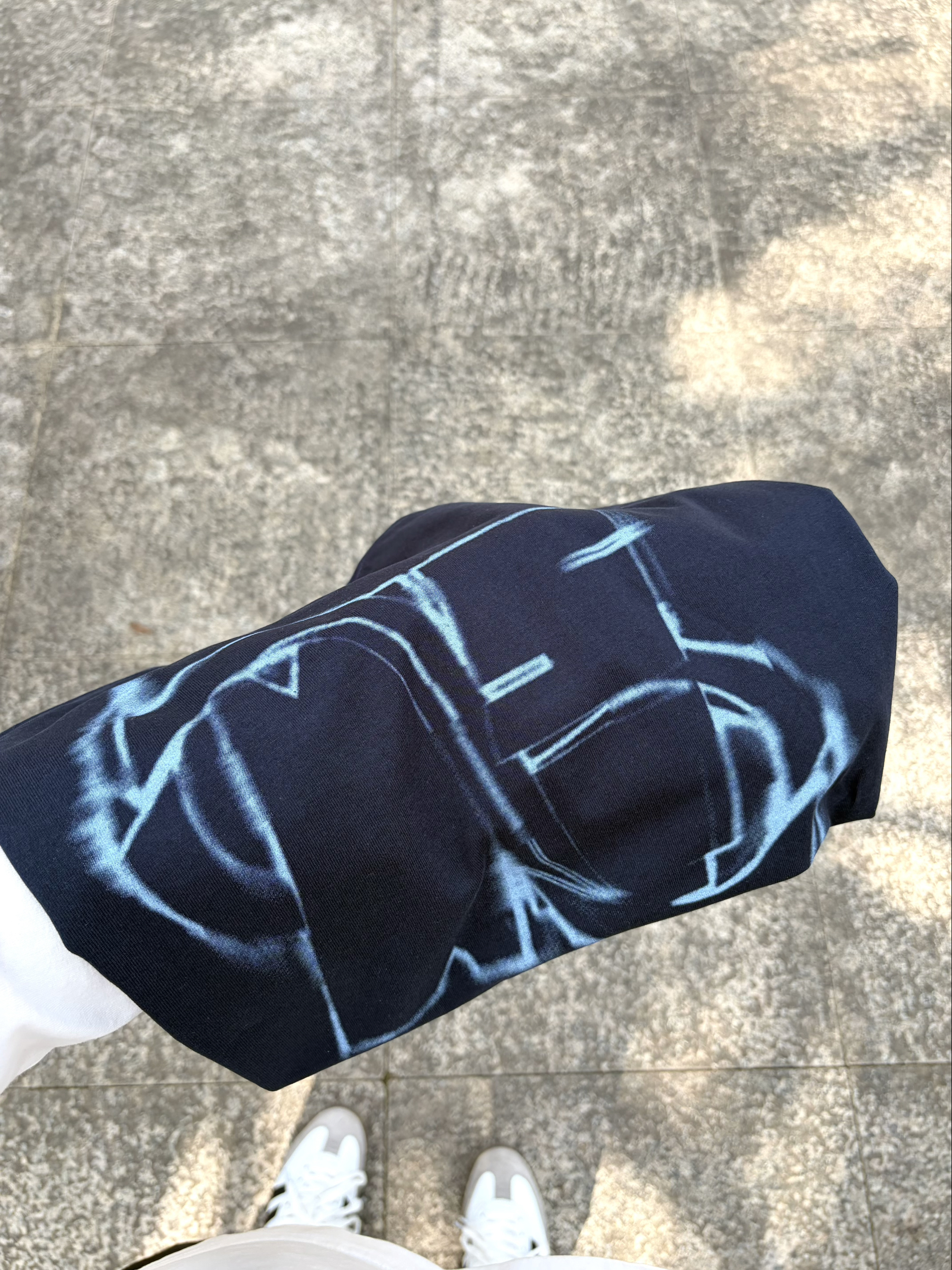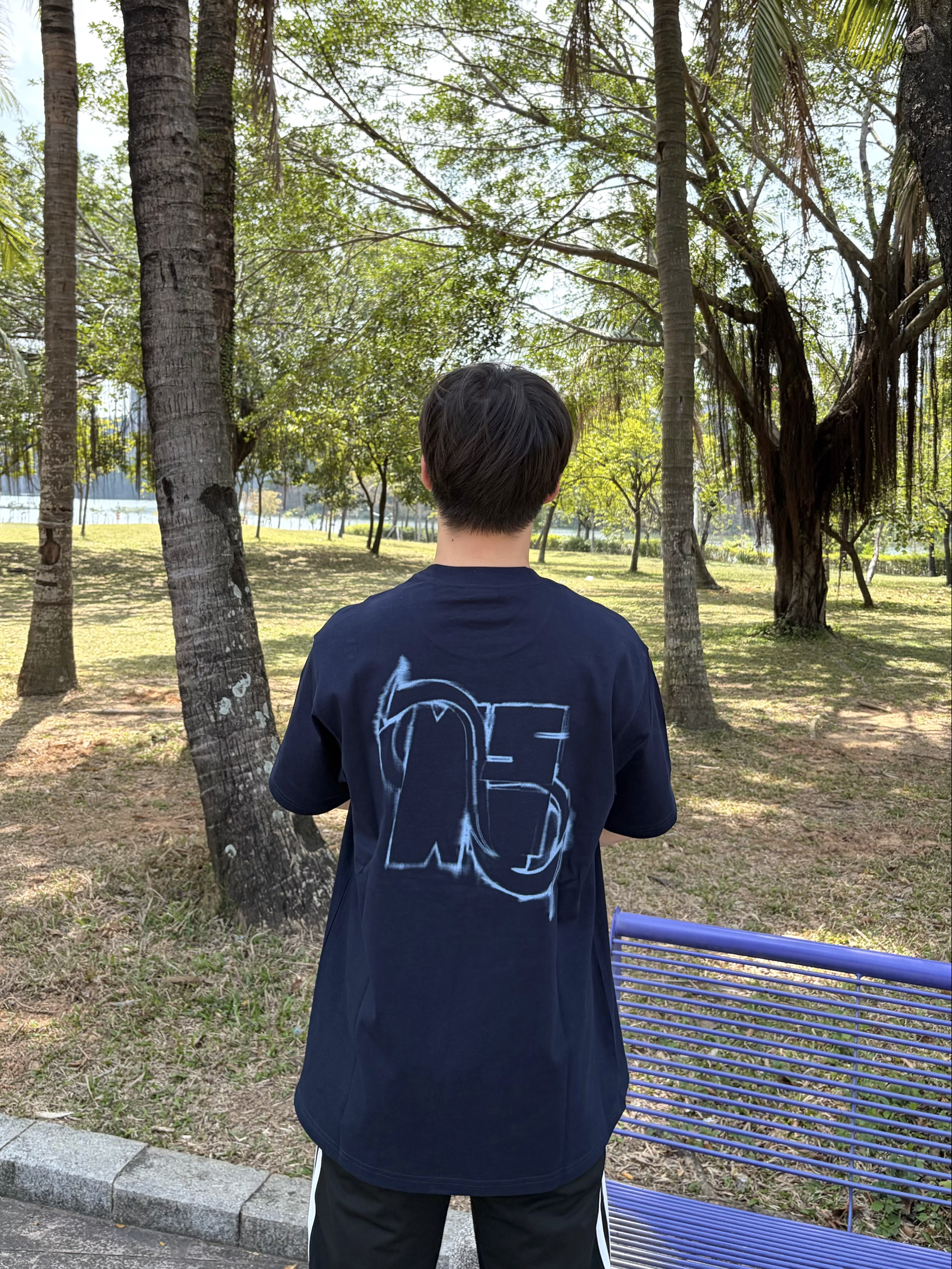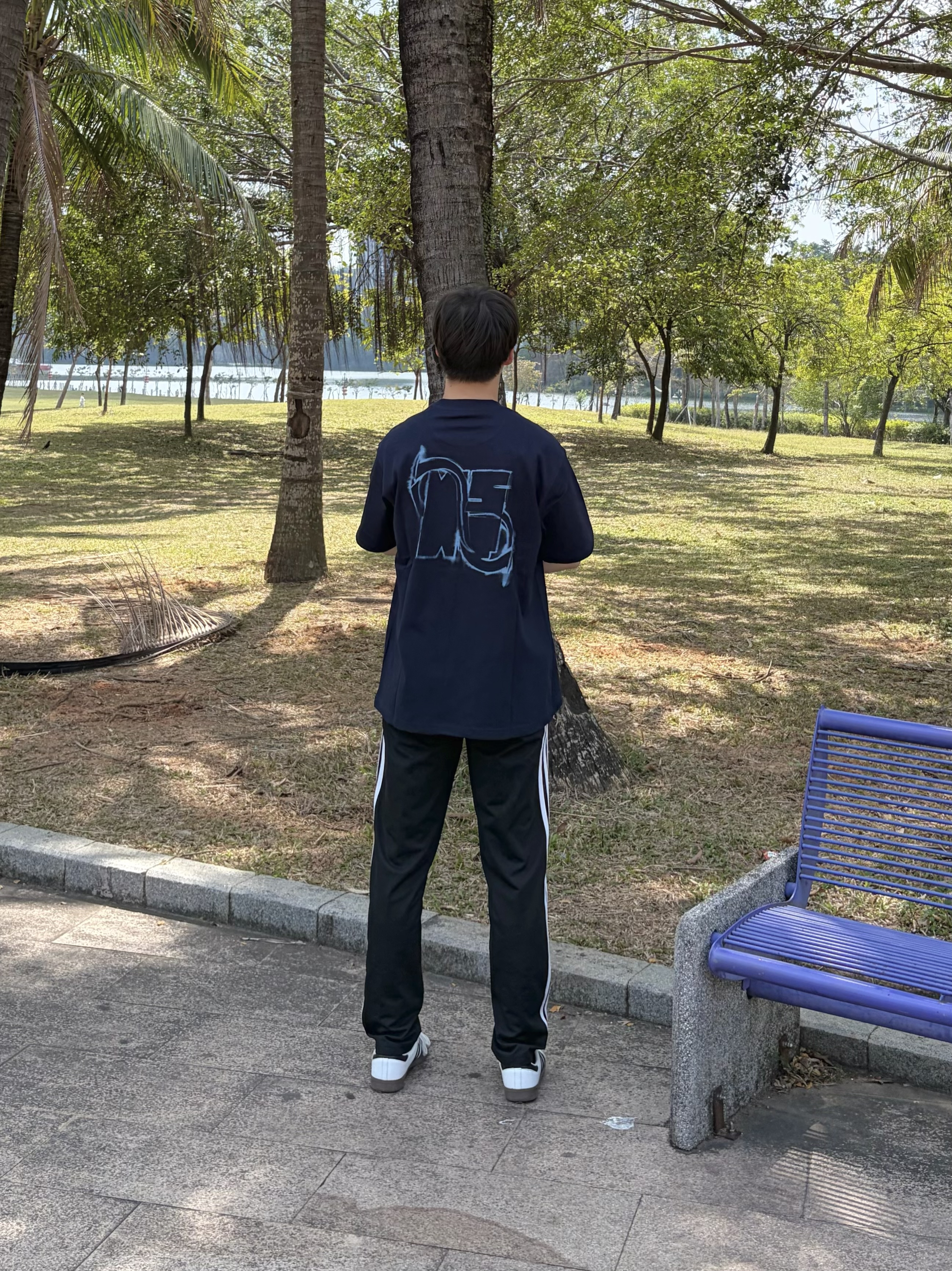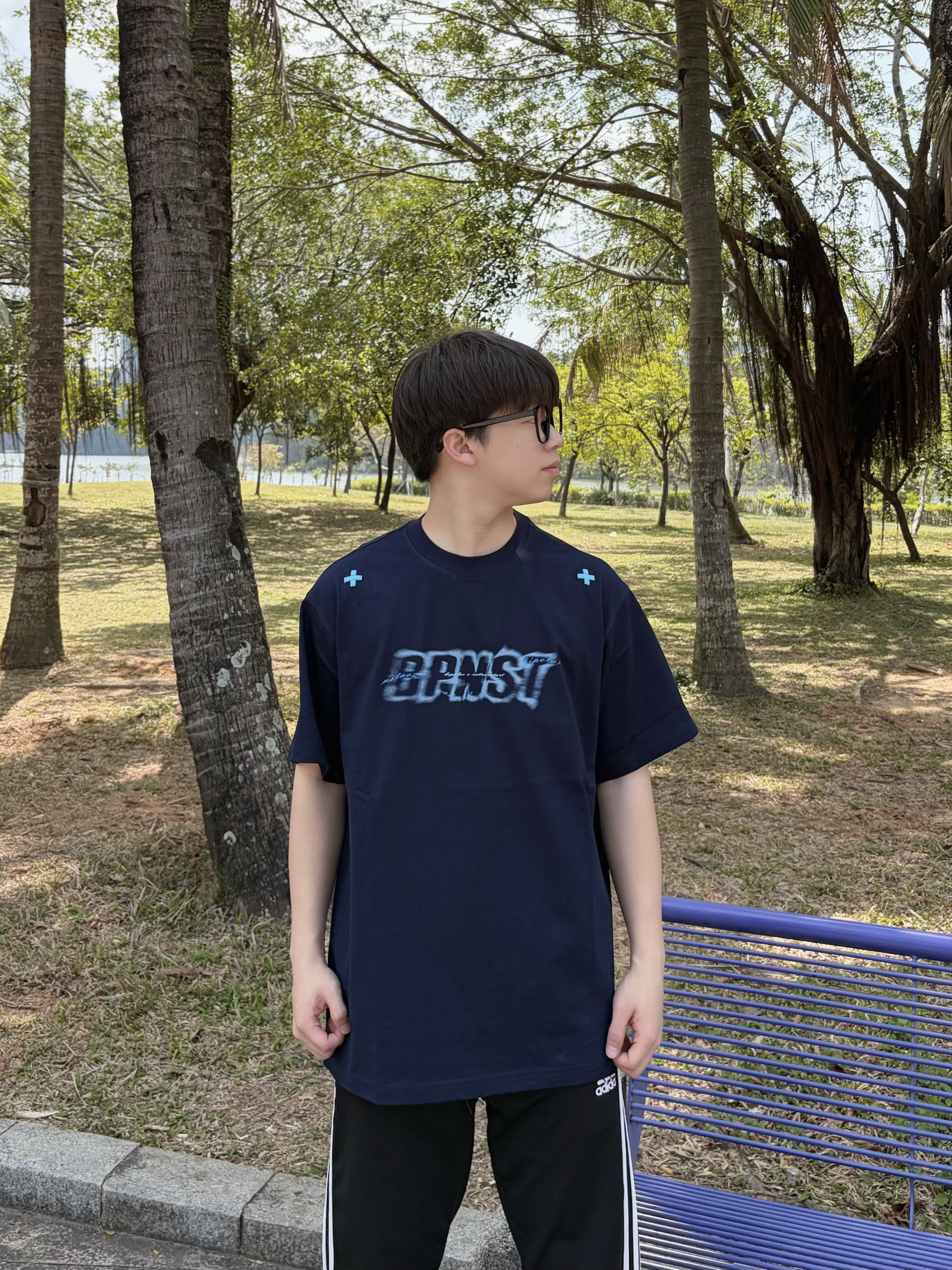 今天在公园长椅上晒着太阳发呆☀️ BIPOLAR x NSTNEW START联名 的这件藏蓝短袖👔太帅了🥰 背后的幻影直喷印花很有复古感🕶️ 肩部小十字细节很戳人 纯棉面料上身贴肤又舒服🌬️ 搭配侧边条纹运动裤👖和德训鞋👟 美式复古感拉满🔥 日常出街或散步都很合适🚶