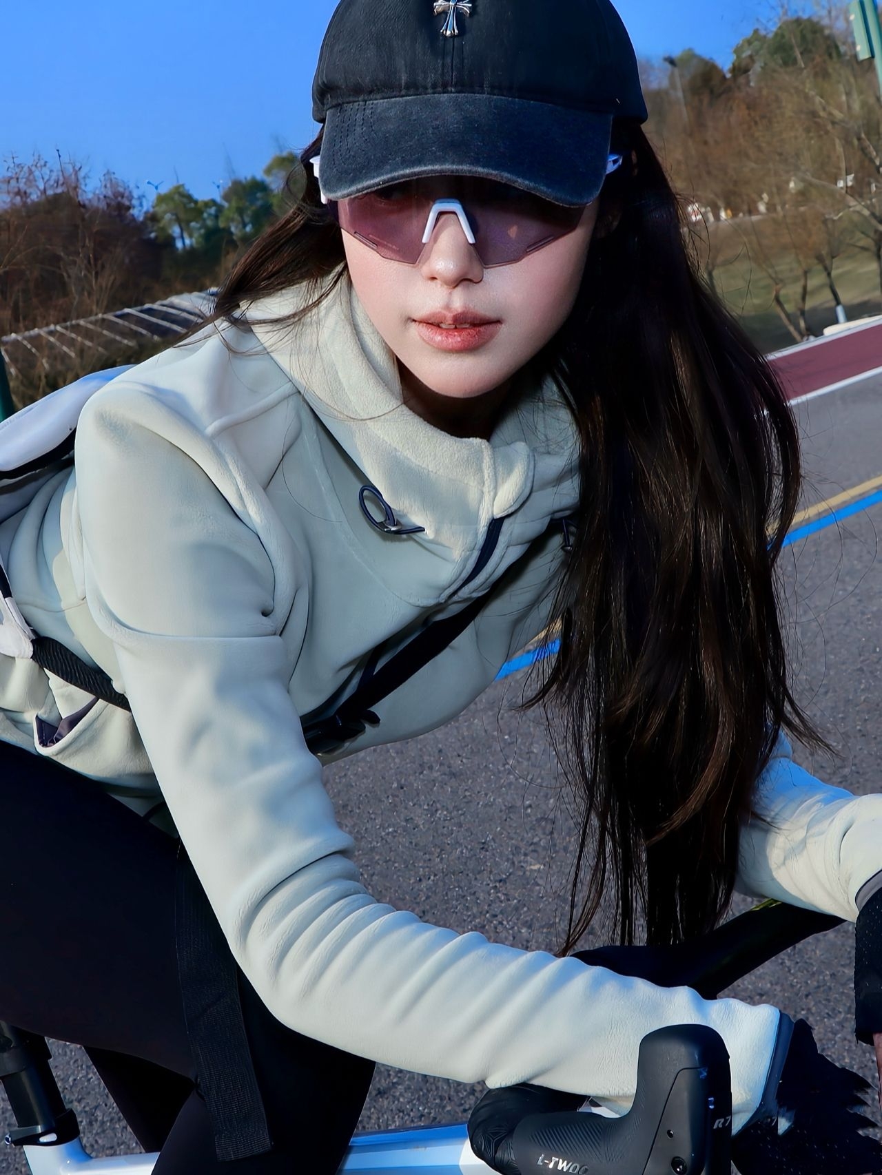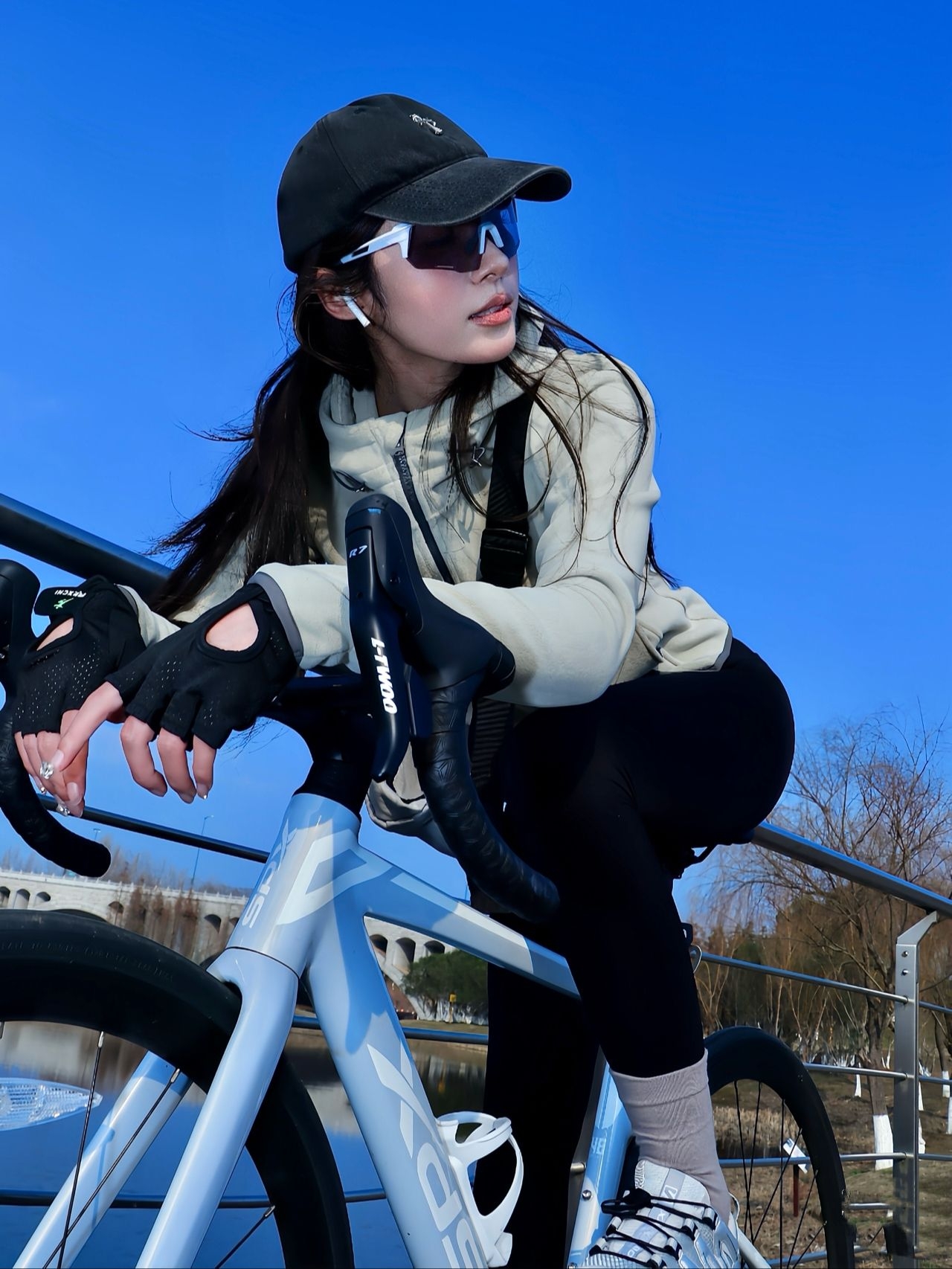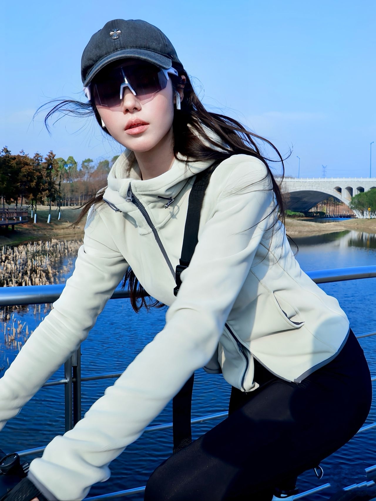 周末骑上单车去江边兜风,风拂过发梢的感觉太舒服了。 上身这件浅米色连帽外套,面料柔软又保暖,连帽设计随性又自在,袖口收紧的细节刚好贴合手腕,骑车时也不会有束缚感。 下身的黑色紧身裤弹力十足,贴合腿型又不显紧绷,搭配浅灰色中筒袜,利落又显精神。脚上的骑行鞋抓地力很棒,踩起脚踏来稳稳当当。 黑帽与墨镜的组合,在澄澈蓝天的映衬下,多了几分酷感。靠在栏杆上歇脚时,看着远处的桥与水面,整个人都松...
