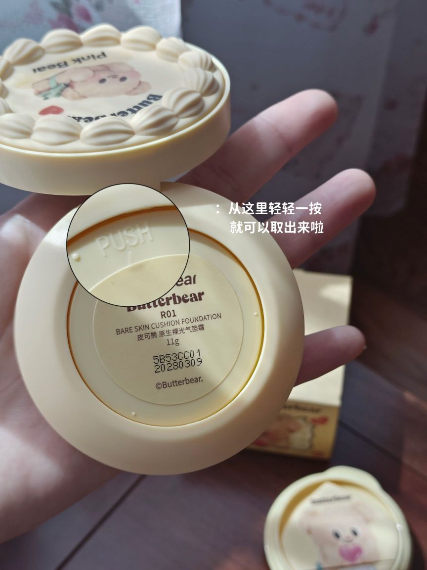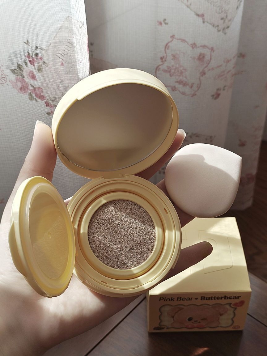 这个黄油小熊气垫霜真是美我一大跳 设计的和芝士小蛋糕一样 我选的是R01色号 上脸很润,不会假白和发灰 妆感清透,轻松拍出裸光肌 有时来不及用粉底液就会拿这个来代替 化底妆超方便,还送了替换装 真是深得我心