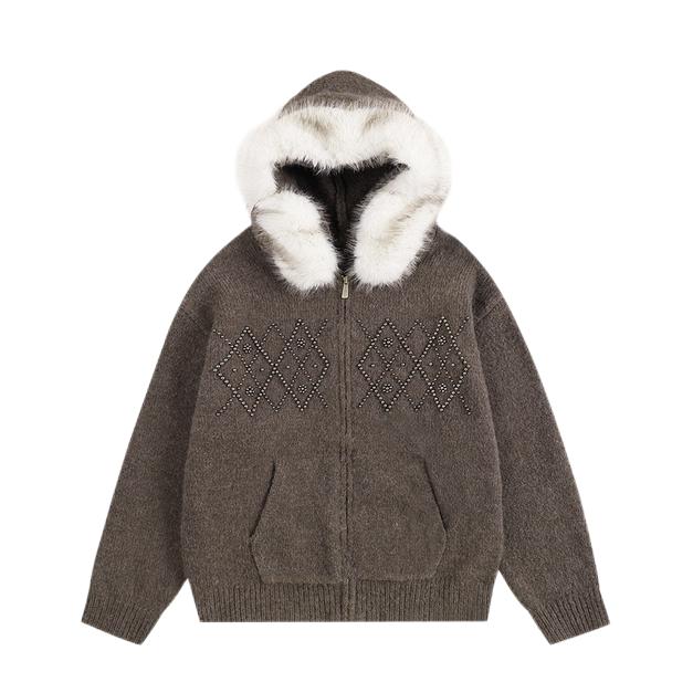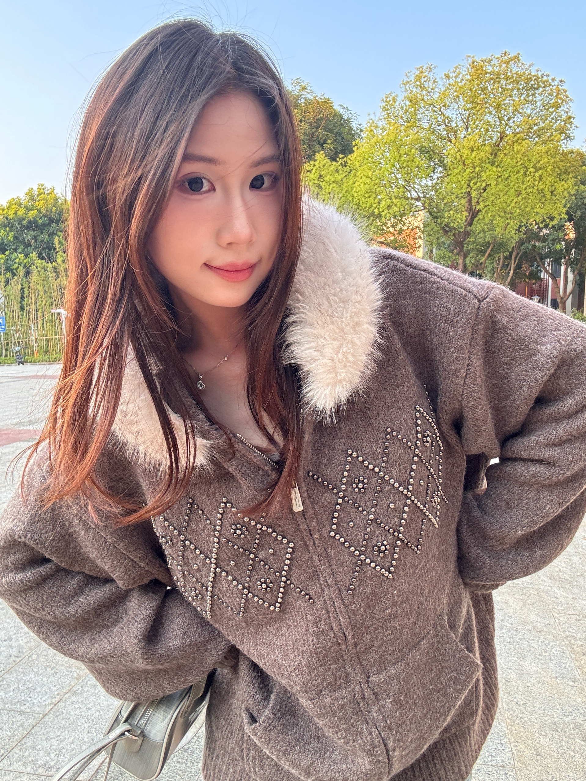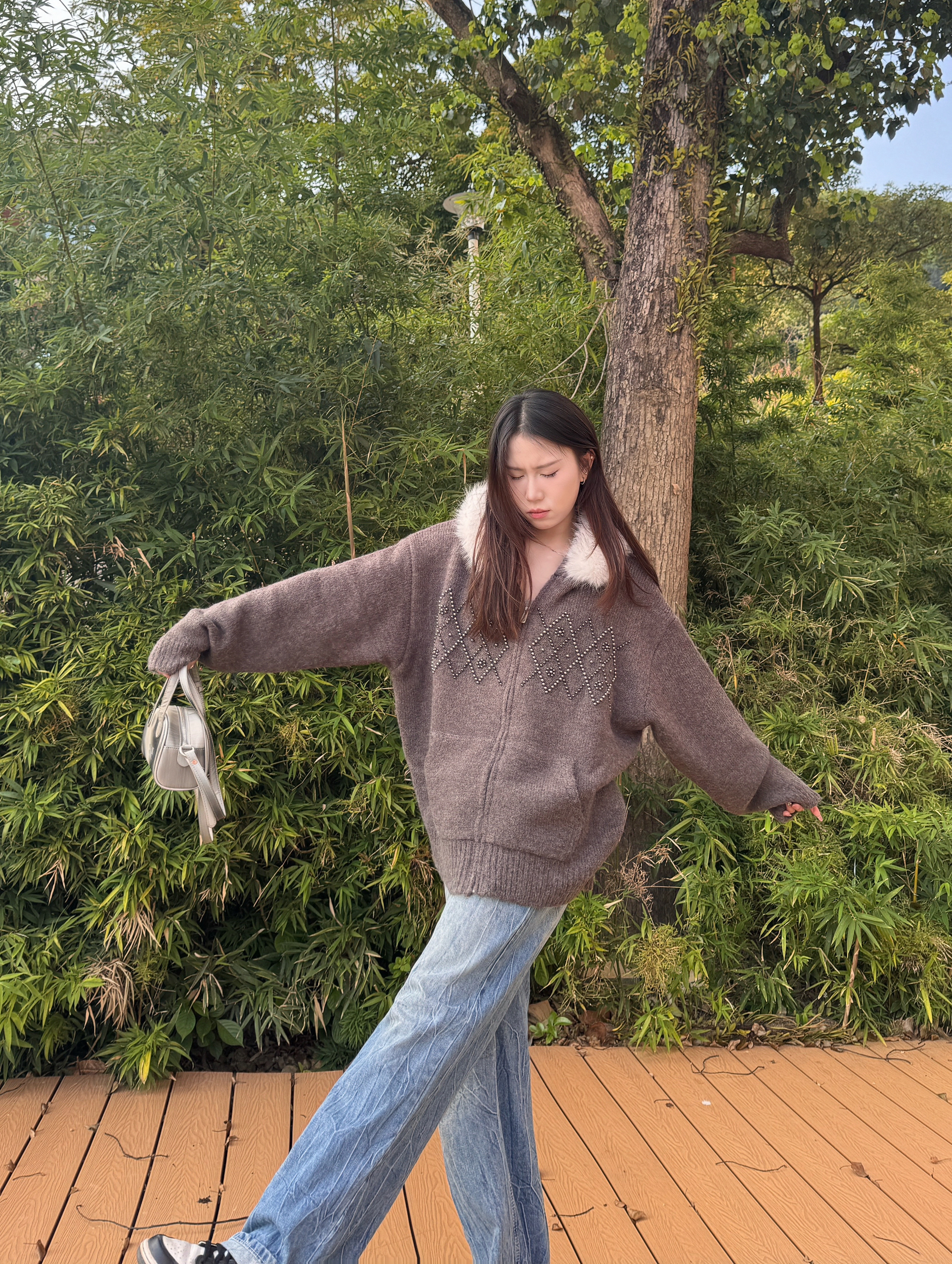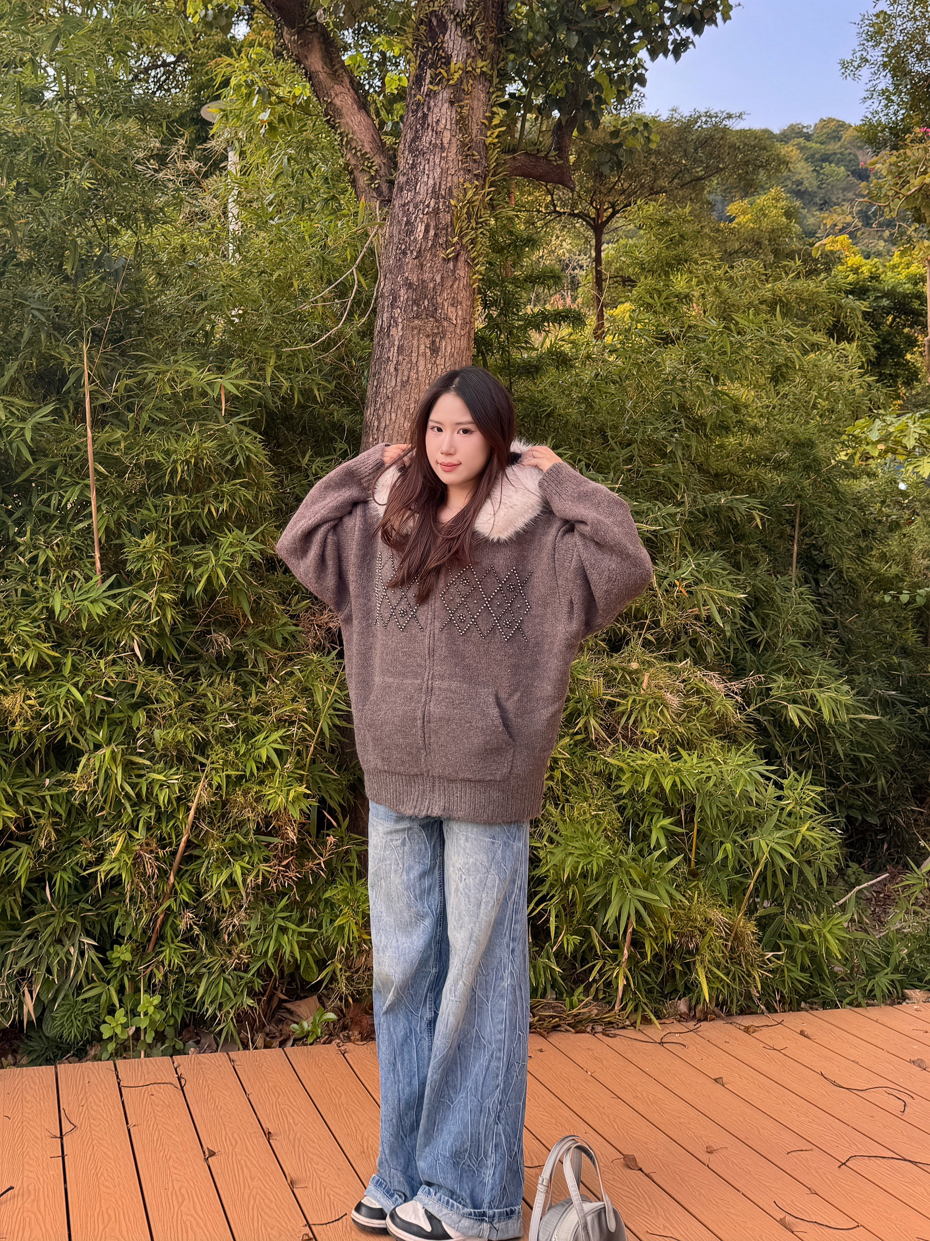 这件毛衣真的戳中我心巴!灰调咖色巨显白,毛领软fufu的,冬天围着超暖和,菱格钉珠设计很精致,不会太夸张,日常穿刚刚好!搭配水洗蓝牛仔裤,慵懒又随性,出门散步、约会都超合适,宽松版型对各种身材都友好,藏肉又显瘦,秋冬氛围感直接拉满~