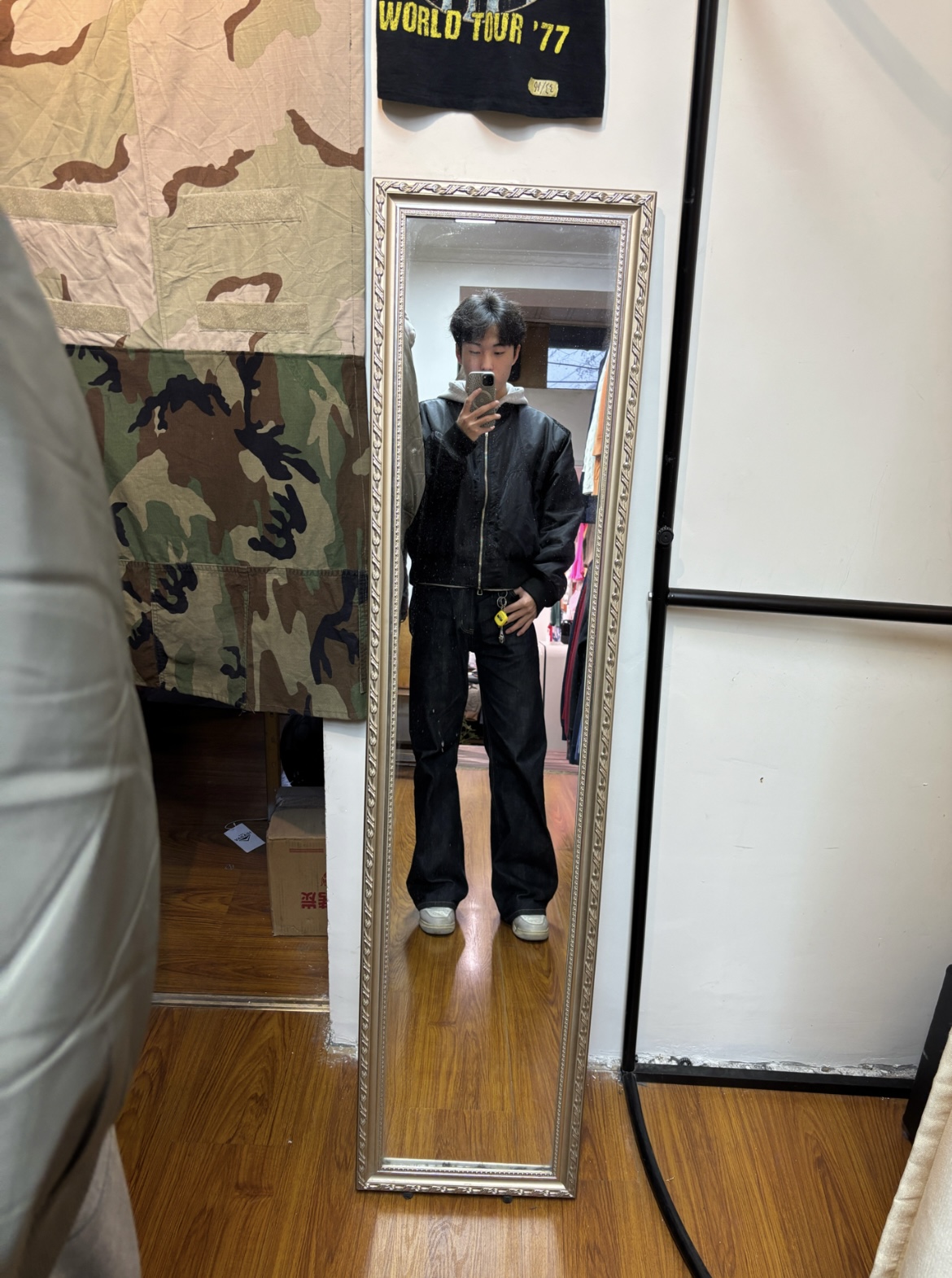 和23号同框 街头篮球风嘎嘎拿捏 银黑拼色羽绒服叠穿格纹衬衫 保暖又有层次内搭白T打底 干净利落 黑色阔腿裤显高又显瘦 再穿一双红白AJ整体配色吸睛又百搭 和今天这套很适配哦 靠墙一站 双手插兜就很帅气啦!