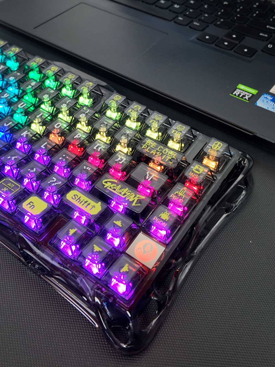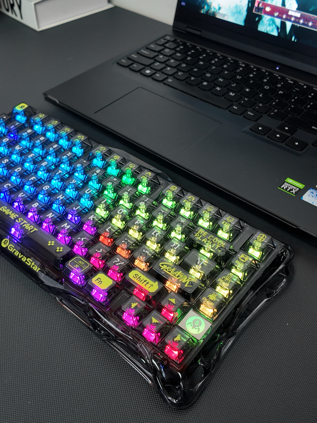 给自己安排的上分套装到手啦💻⌨️,联想这款游戏本2.5K+240Hz屏,玩对战画面丝滑不拖影,100%sRGB色域色彩也够准。搭配的重力星球键盘,镂空设计+赛博光效,打字是闷厚的麻将音,星闪轴触发快连招超顺,就是透明外壳容易沾指纹,得经常擦😮💨