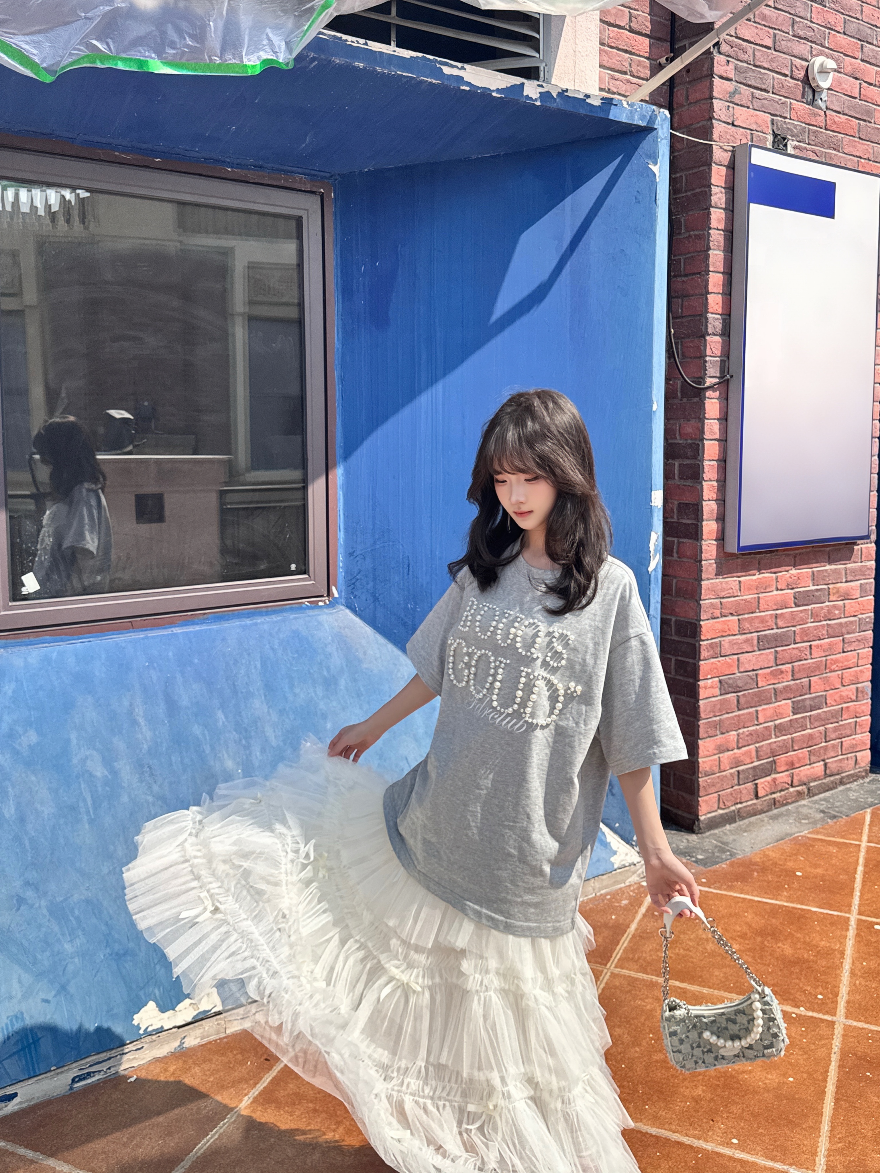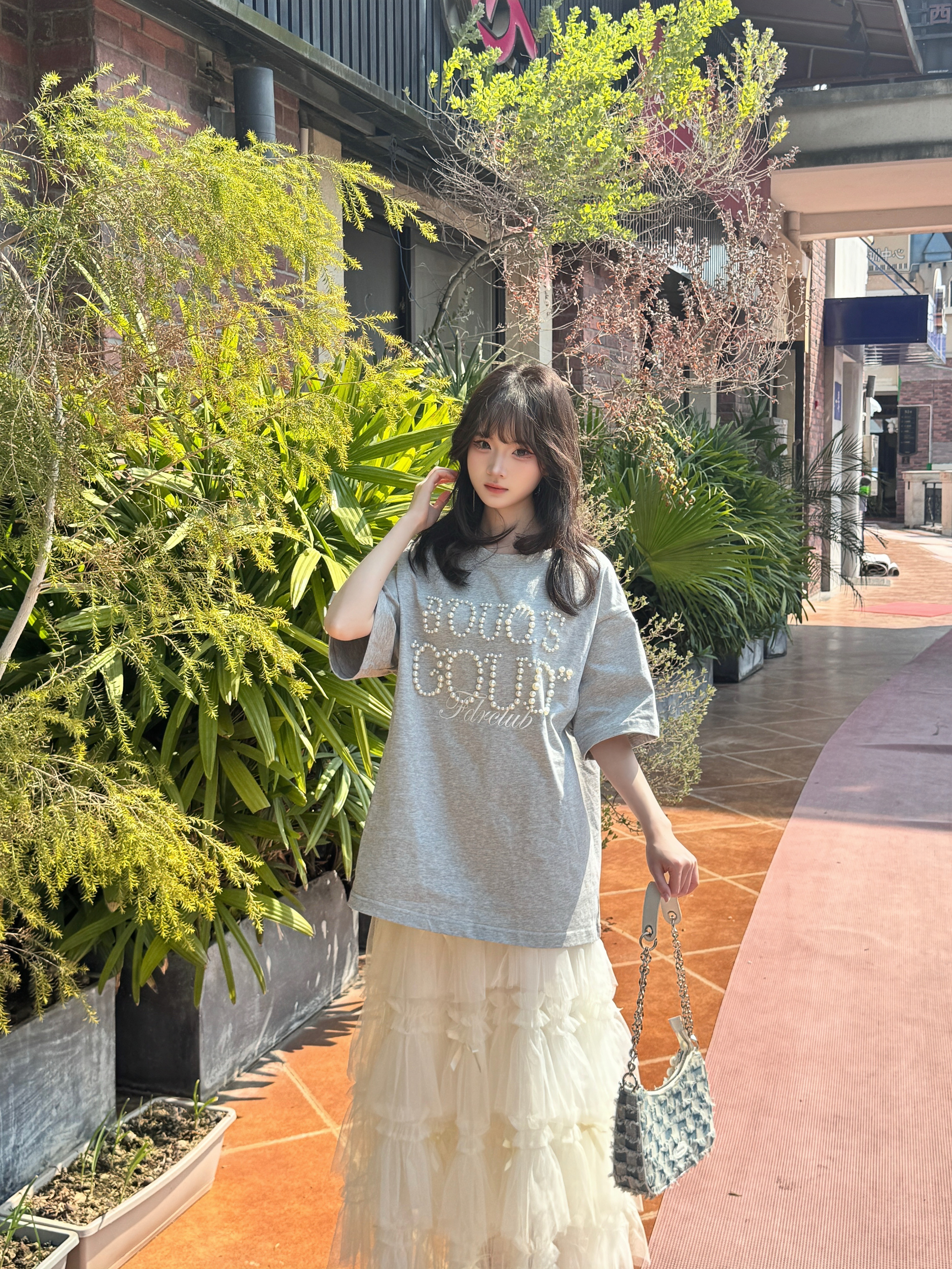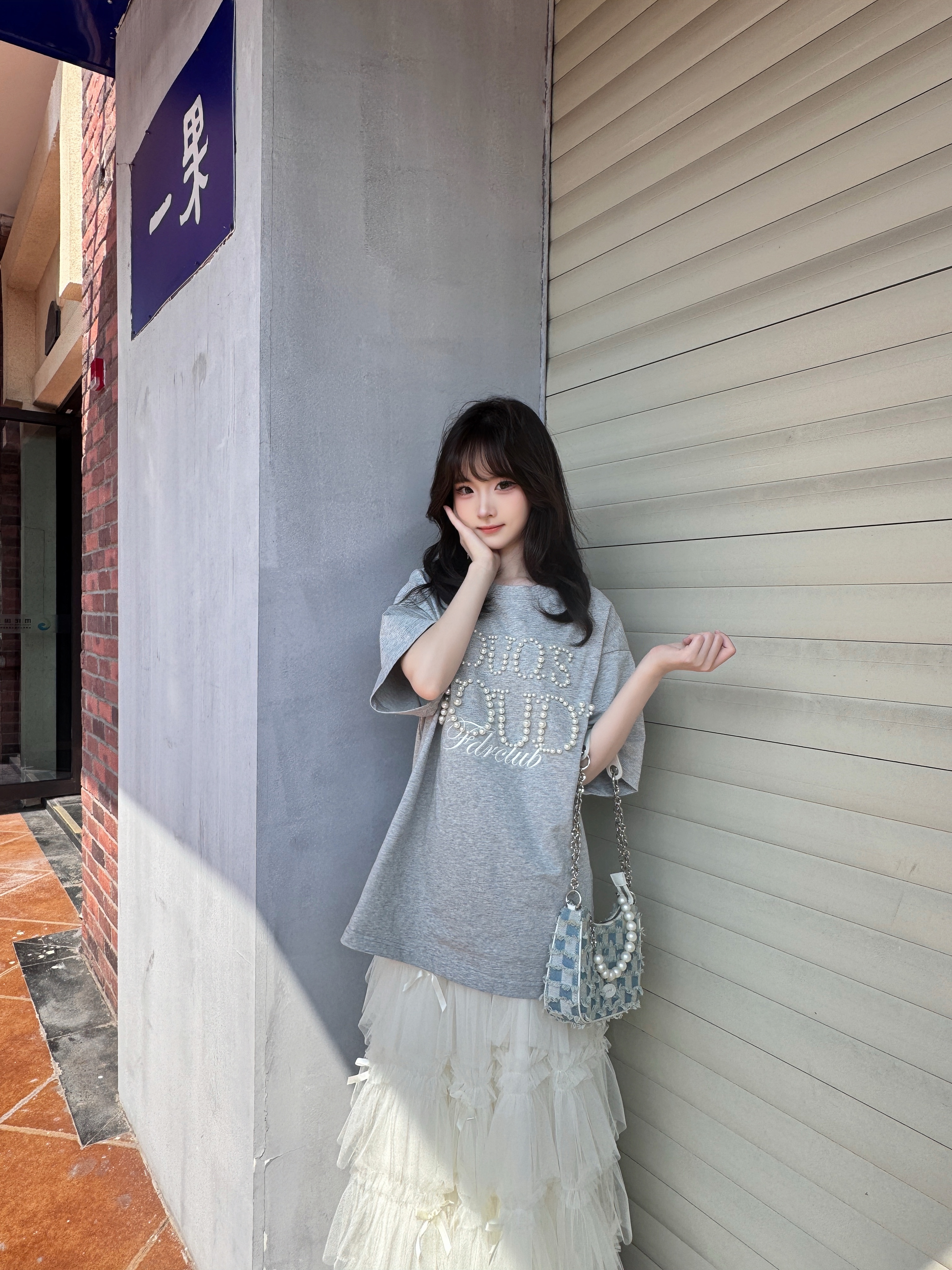 这件灰色短袖太懂春日🌸氛围感了! 手工珍珠🧋钉珠字母精致💖又显贵耶~ 宽松版型遮肉显瘦✅ 面料柔软☁️透气 春夏天穿不闷👻 搭白色层层纱裙👗 甜酷🎀平衡刚好✨ 日常逛街🛍️、探店都适配 是近期出门首选的温柔风🍨单品哦~