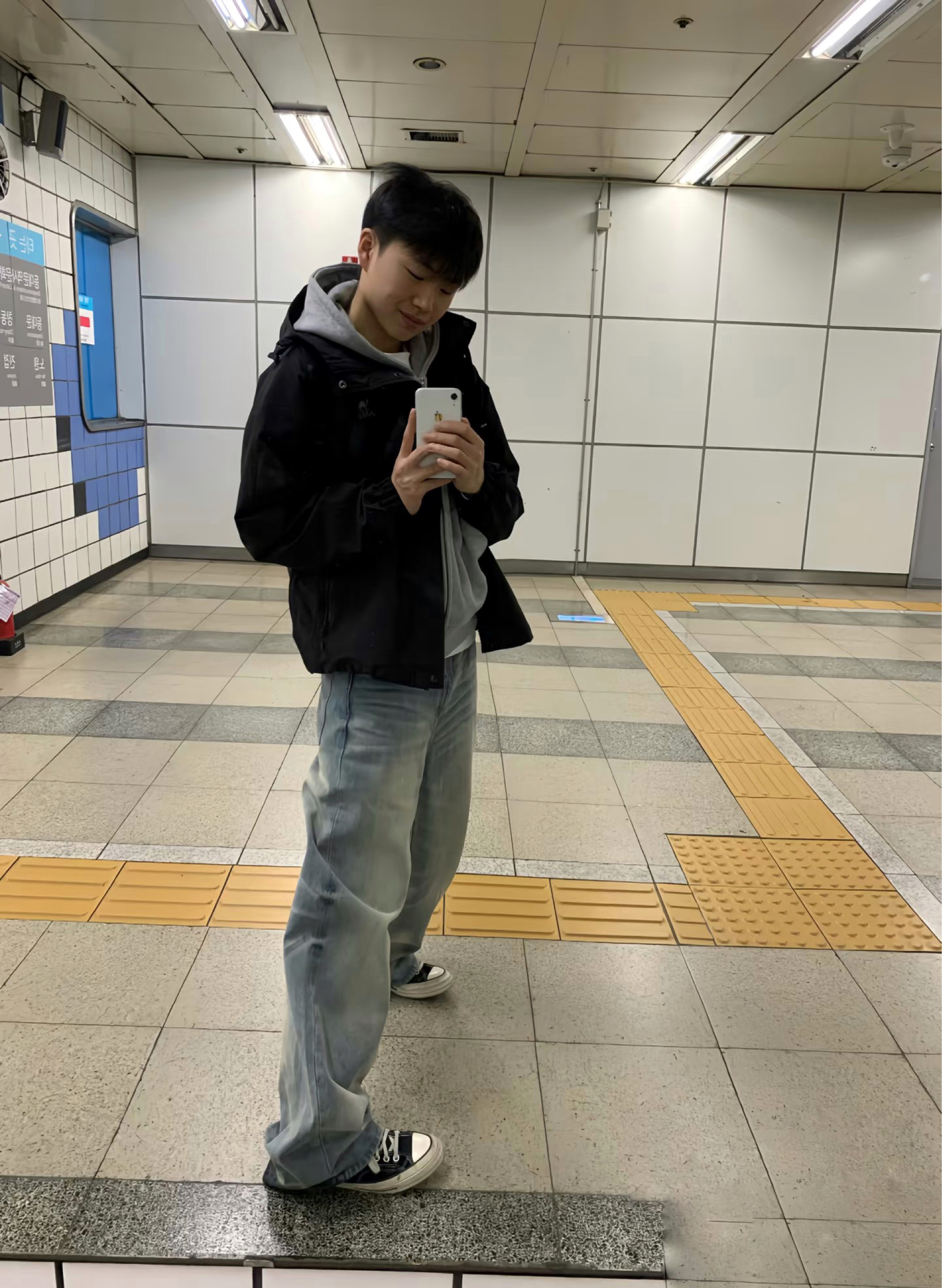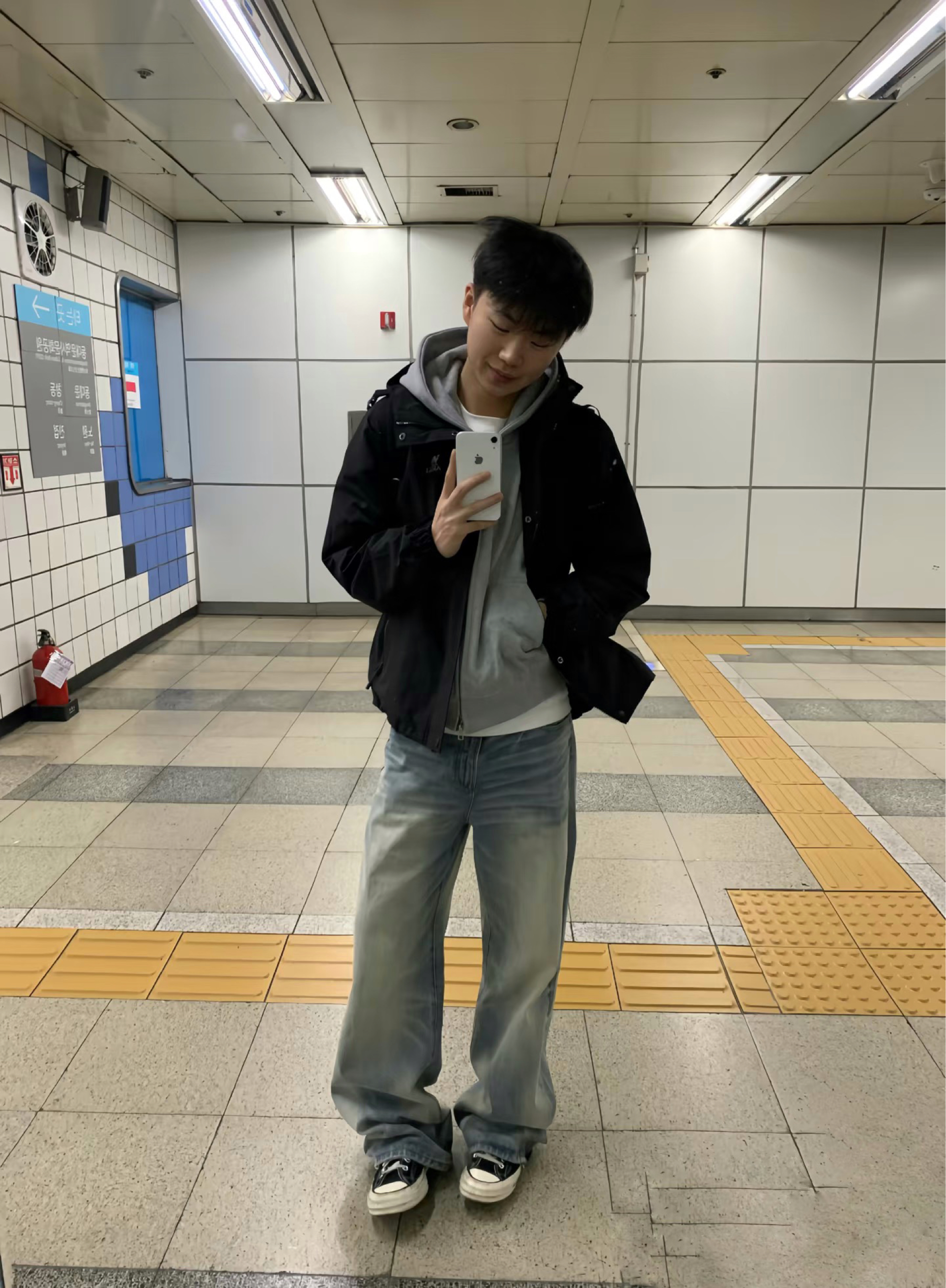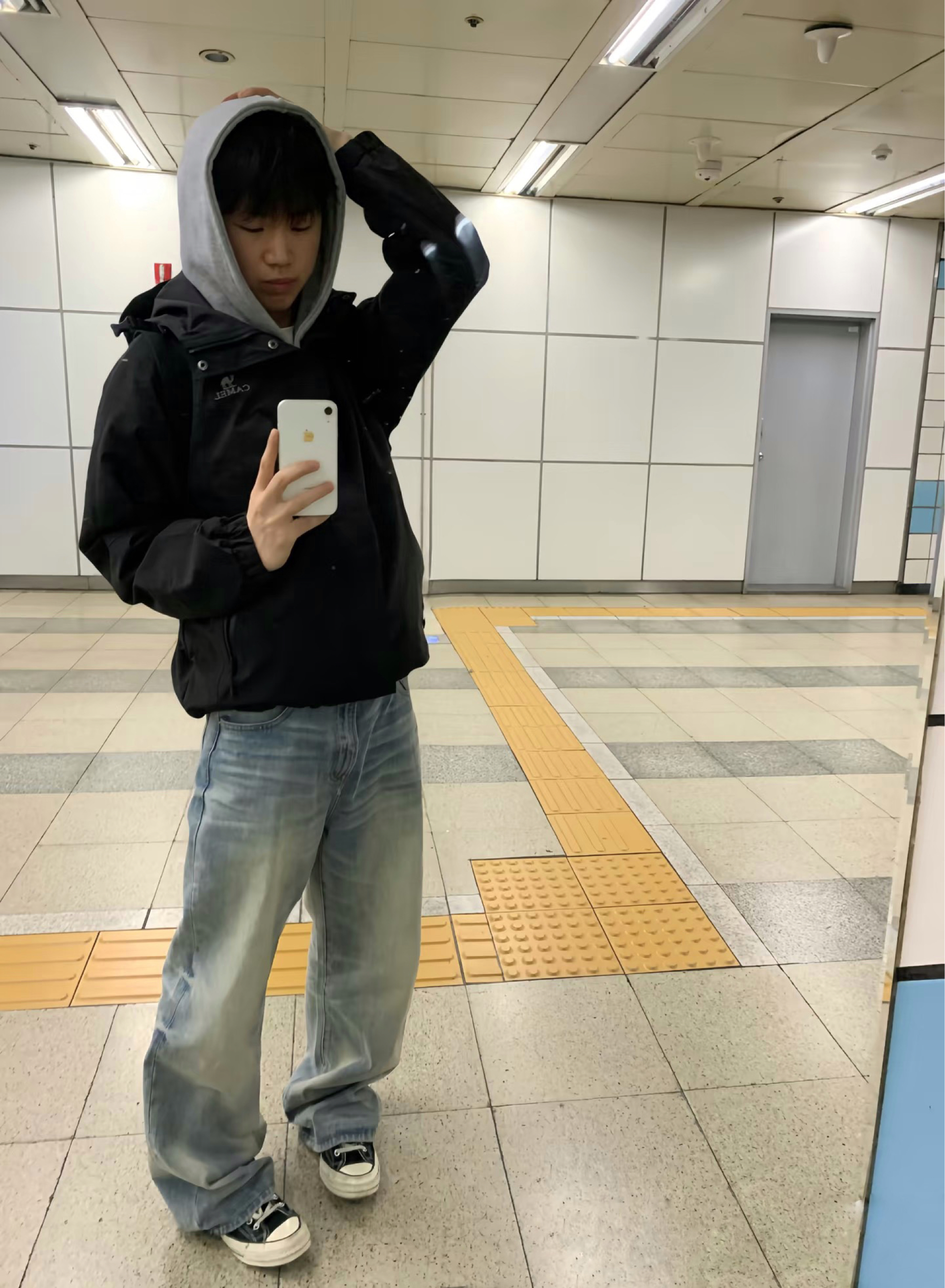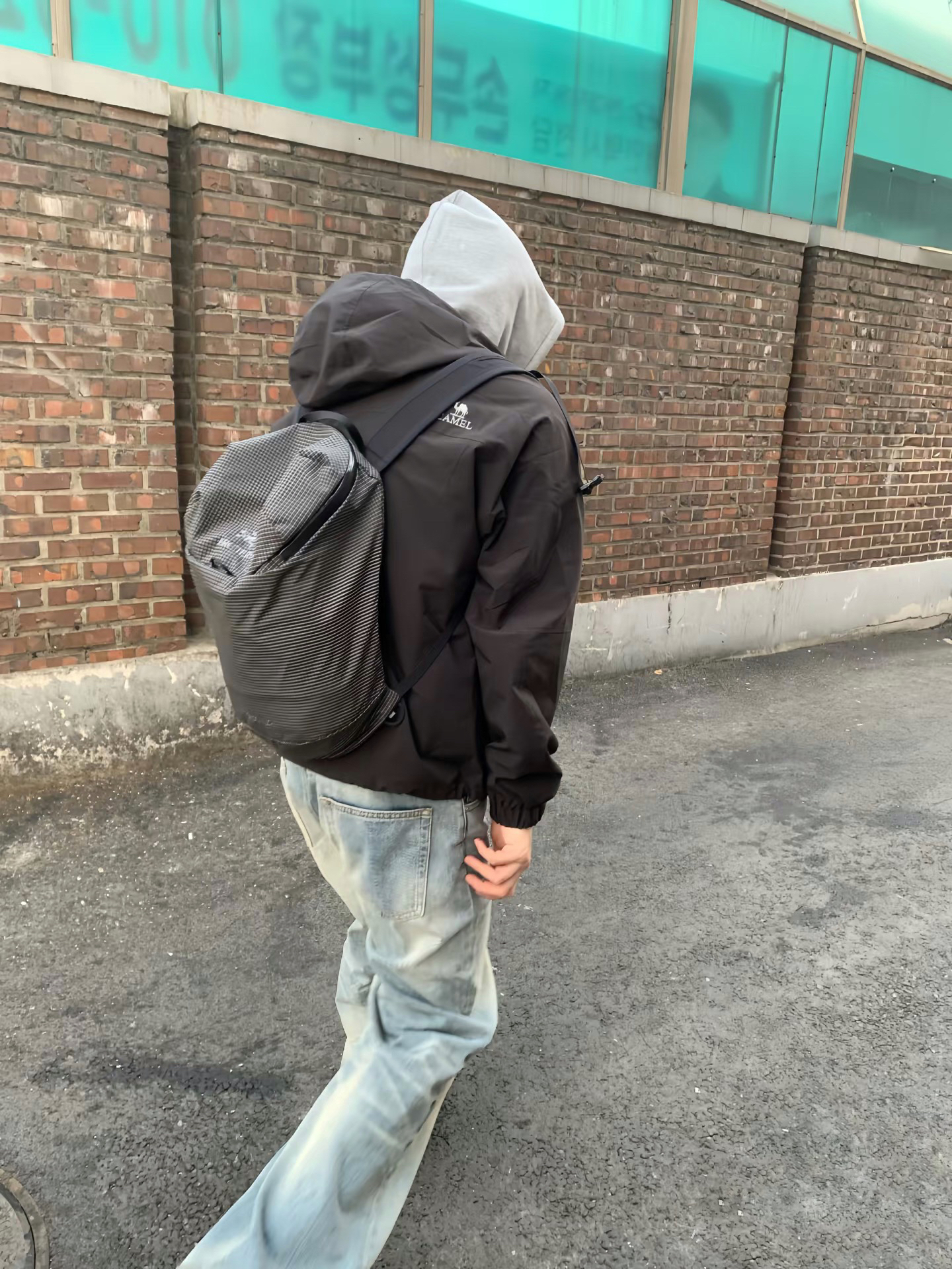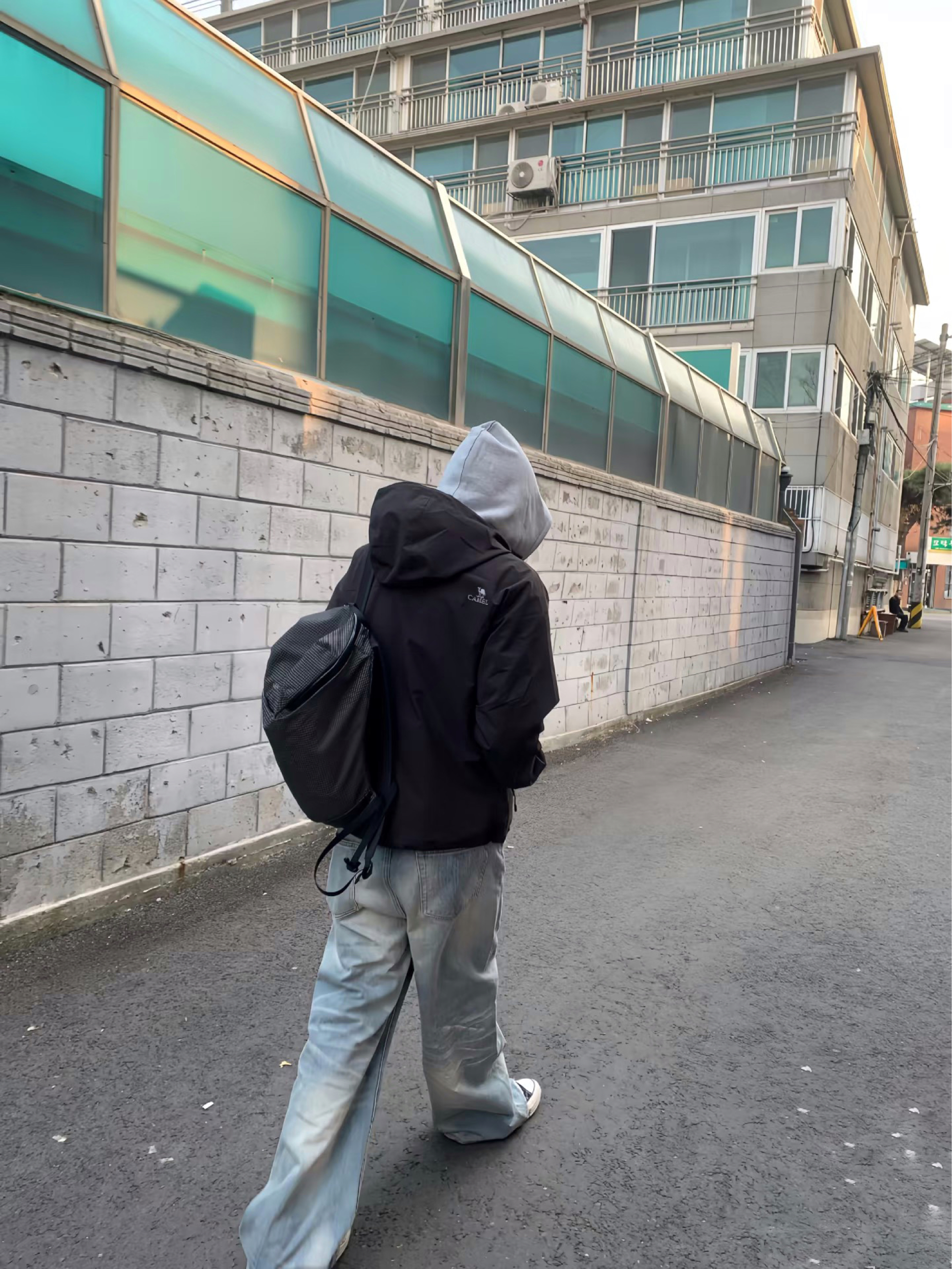 日常citywalk首选这套韩系休闲风!黑色短款冲锋衣叠穿浅灰连帽卫衣,层次感拉满又利落。下身搭配做旧浅蓝阔腿牛仔裤,随性慵懒还显腿长。脚踩经典黑白帆布鞋,背上格纹双肩包,整套黑灰蓝配色低调又耐看,通勤、出街都适配,轻松拿捏少年感。