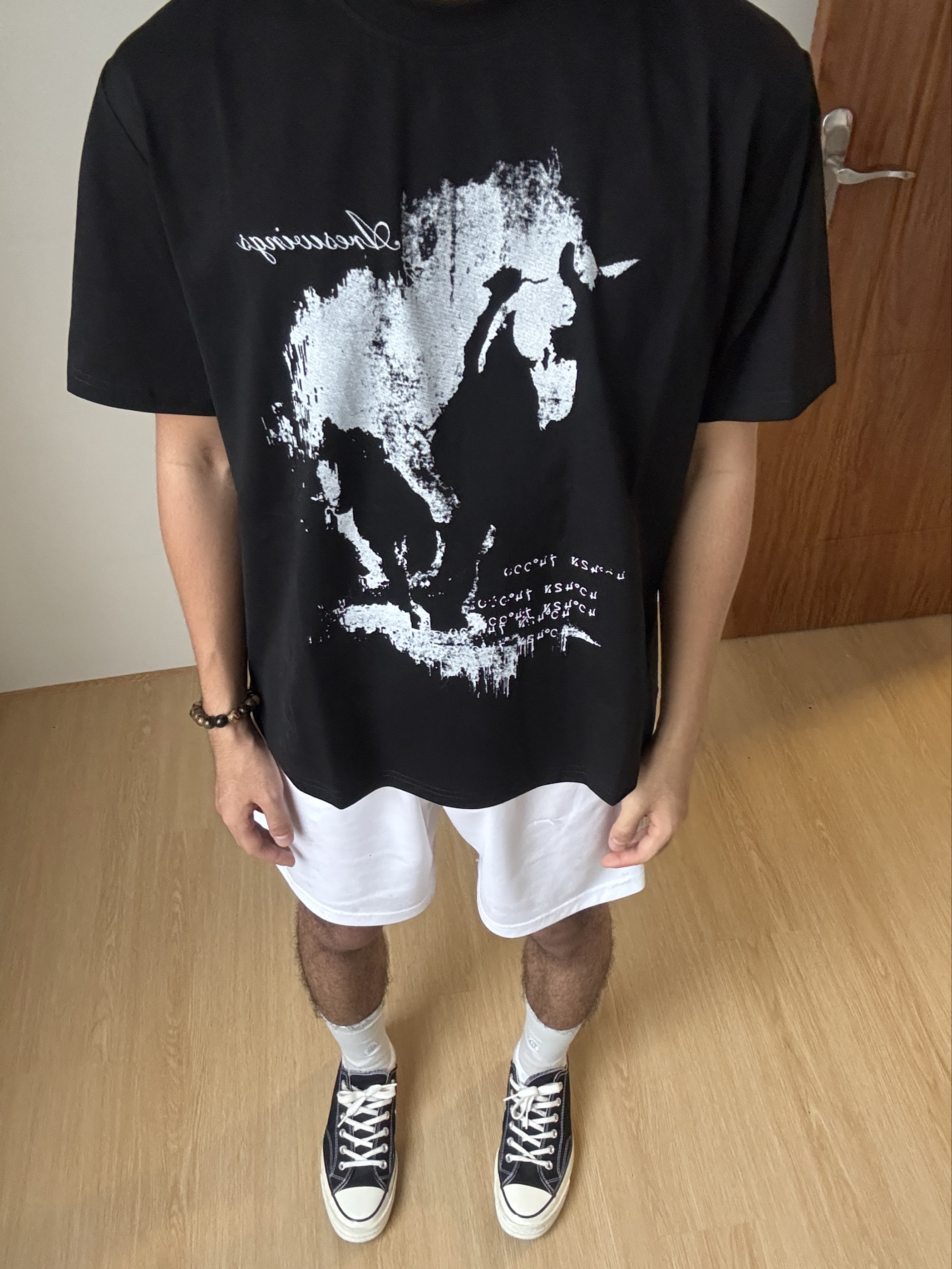 懒人公式直接焊死在身上🖤 不用费脑搭配,随便一套都清爽耐看,黑底做旧印花T自带颓废复古感,白短裤利落又清爽,浅蓝中筒袜+经典黑匡威,脚感颜值双在线舒服又自在,是那种路人看了都会夸“会穿”的程度常又舒服,是出门不用多想的懒人穿搭,随性又耐看。