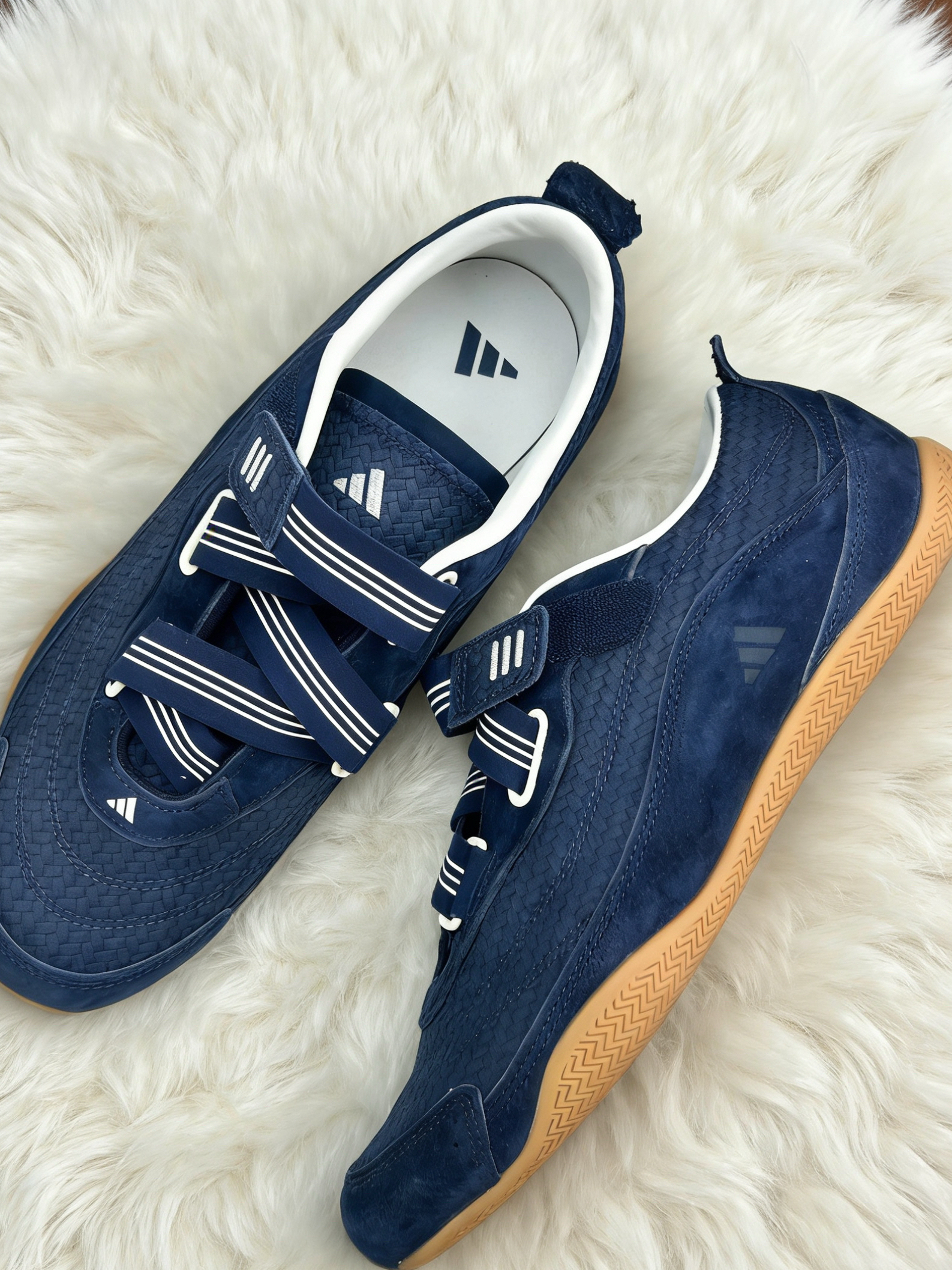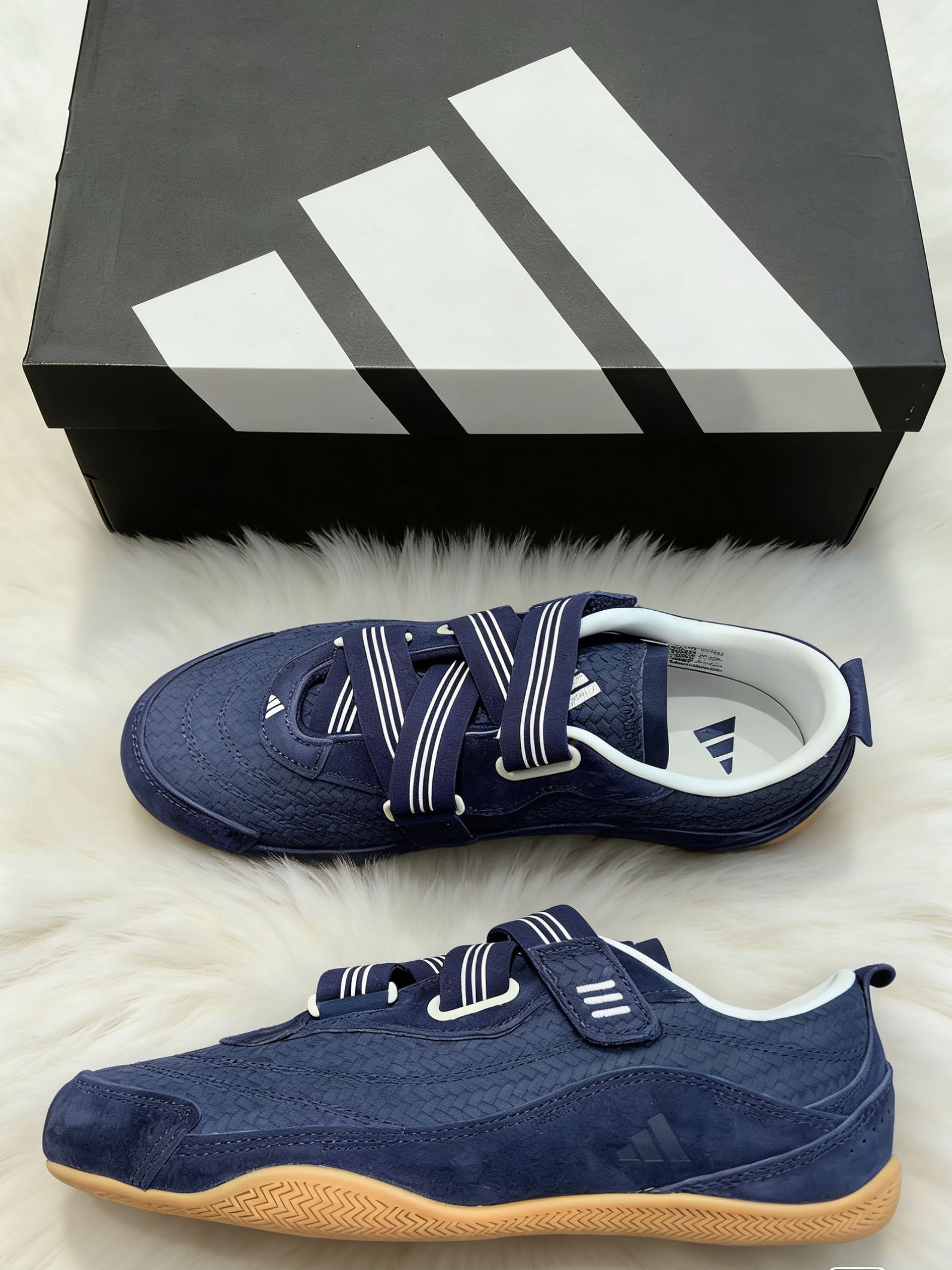 • 藏青+生胶底的配色,复古感很足,翻毛皮+编织鞋面的拼接,质感细腻,日常穿很显质感。 • 魔术贴绑带设计,穿脱方便,鞋型偏修长,不会显脚大,搭配牛仔裤、休闲裤都很协调。 • 生胶外底纹路清晰,日常走路的抓地力和舒适度都在线,通勤、出街都合适。 • 细节上的小Logo和条纹点缀,不张扬但有辨识度,属于越看越喜欢的类型。