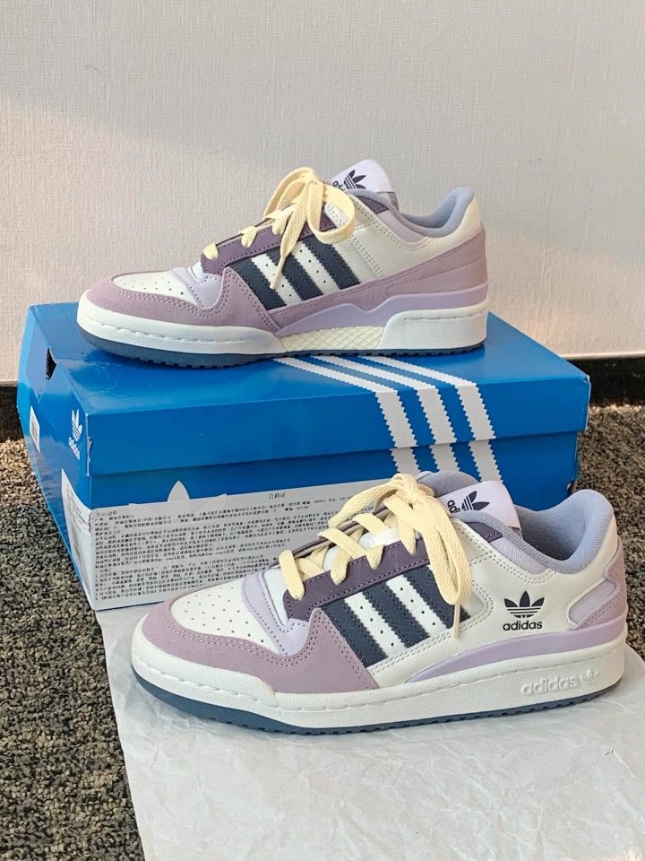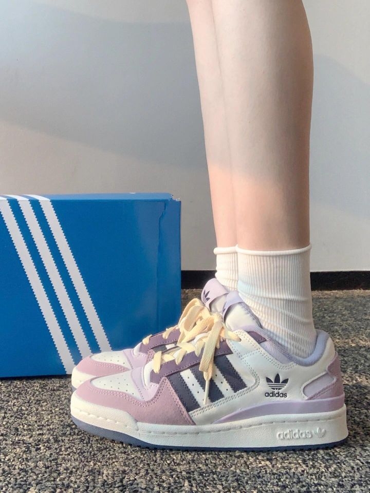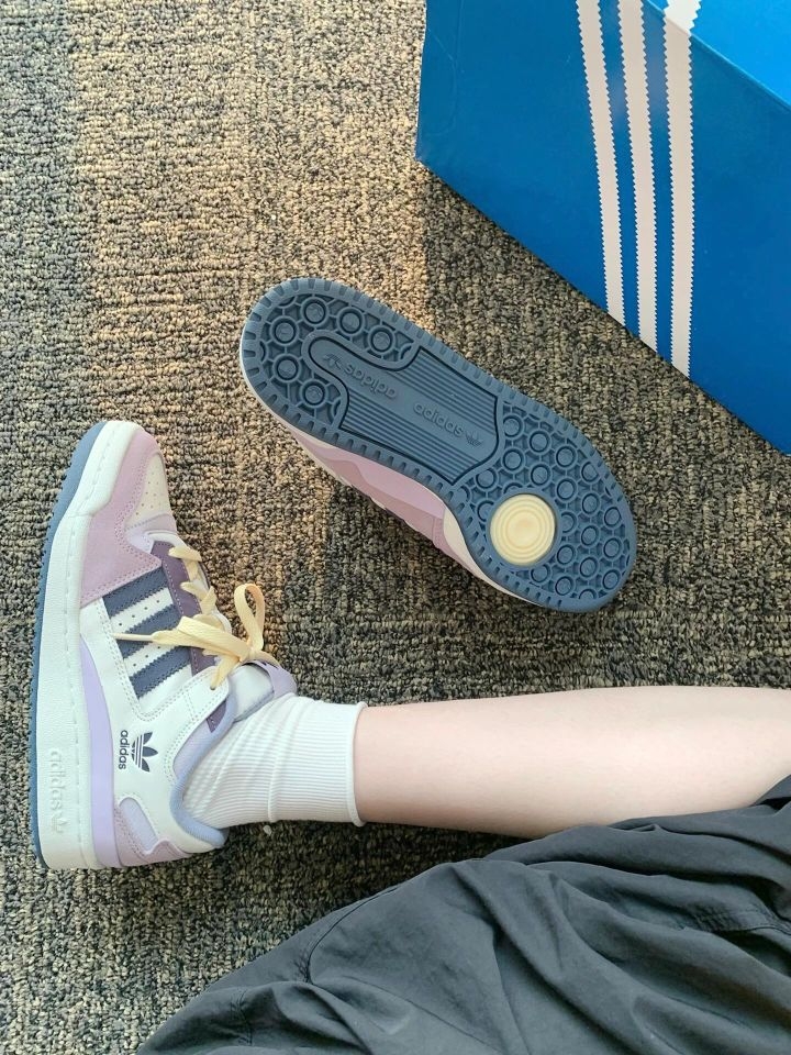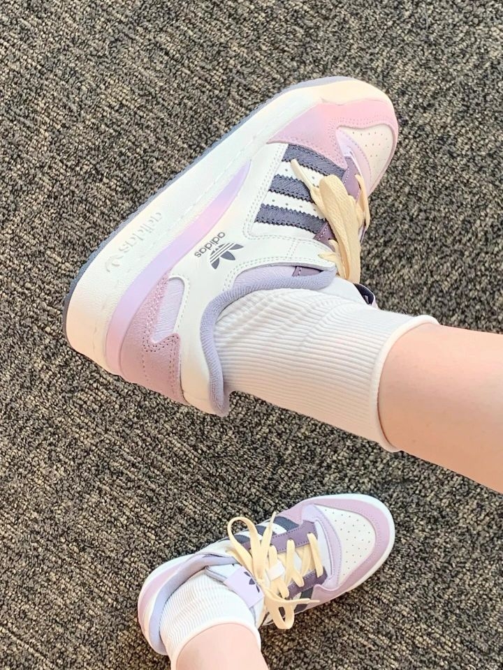 谁懂啊!这双芋泥紫粉Forum直接戳中我的心巴! 麂皮质感软乎乎的,低饱和紫粉+奶白撞色,像一杯分层的芋泥奶冻,搭配白袜,韩系温柔感直接拉满,上脚显白又显脚小! - ✨ 颜值暴击:紫粉渐变拼接+奶黄鞋带,复古又少女,三叶草标+经典Forum鞋型,细节精致到犯规,同色系穿搭直接焊在身上! - 🥿 好穿到哭:厚底悄悄增高5cm,显高又修饰腿型,包裹性强不磨脚,暴走一天也不累,学生党/打工人闭眼...