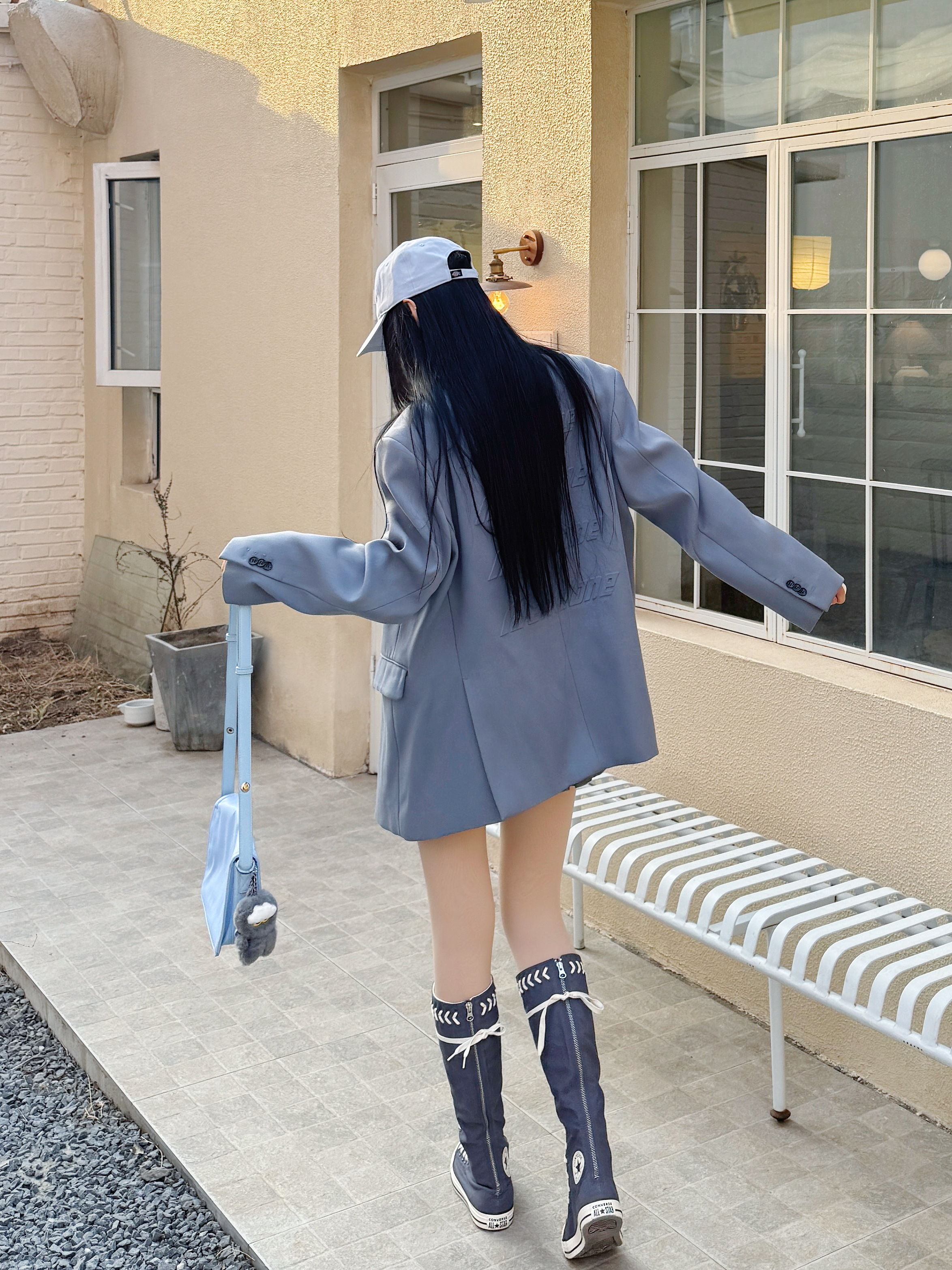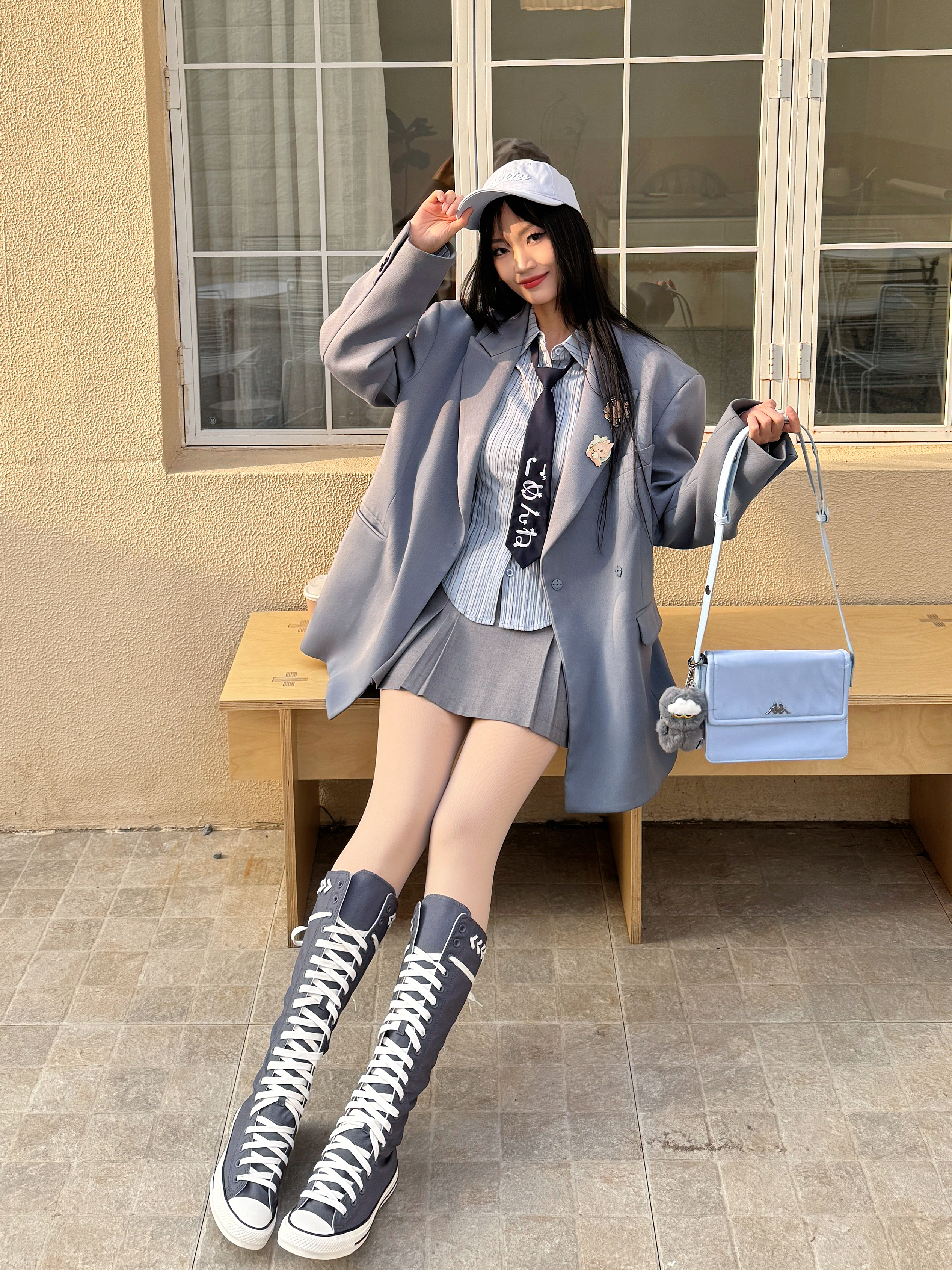 今天和我的zoa猫猫一起出门ootd啦🧏🏻♀️,get到GD穿搭的灵感,用宽肩西装外套和高筒帆布靴的碰撞,是不是很有叛逆学院风的感觉呢~ 📄今日份穿搭分享: 蓝色鸭舌帽➕雾霾蓝西装➕蓝色条纹衬衫➕灰色半裙➕高帮帆布鞋➕ zoa 钥匙扣=春日叛逆学院风ootd。