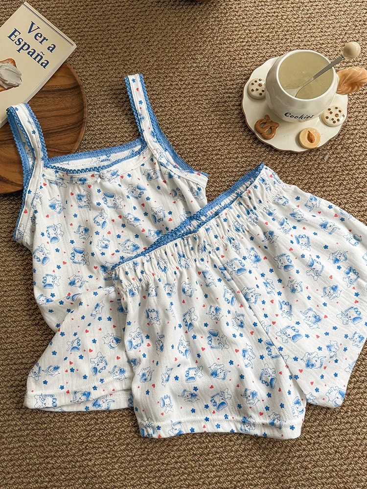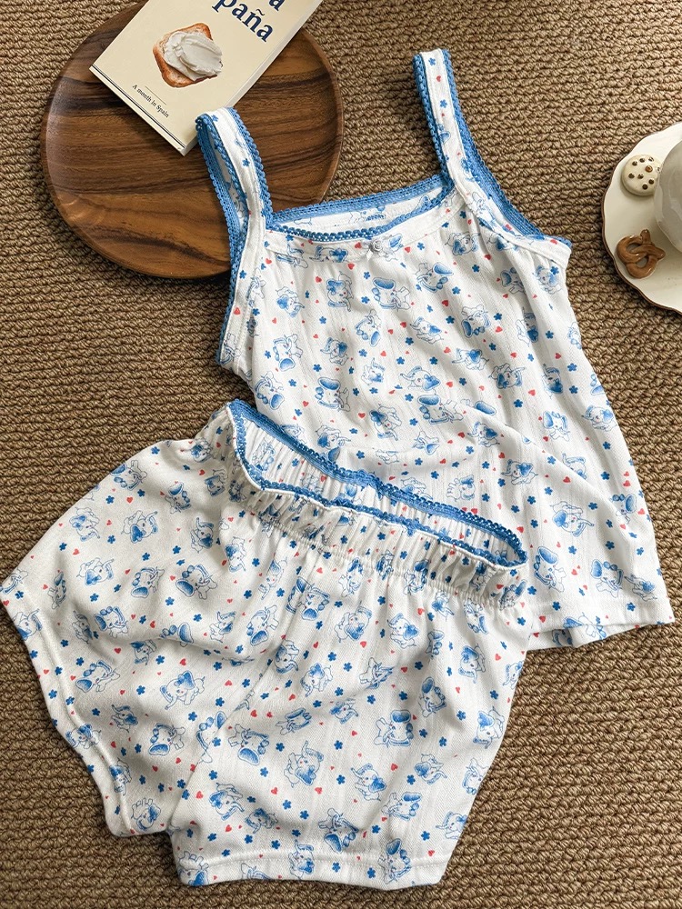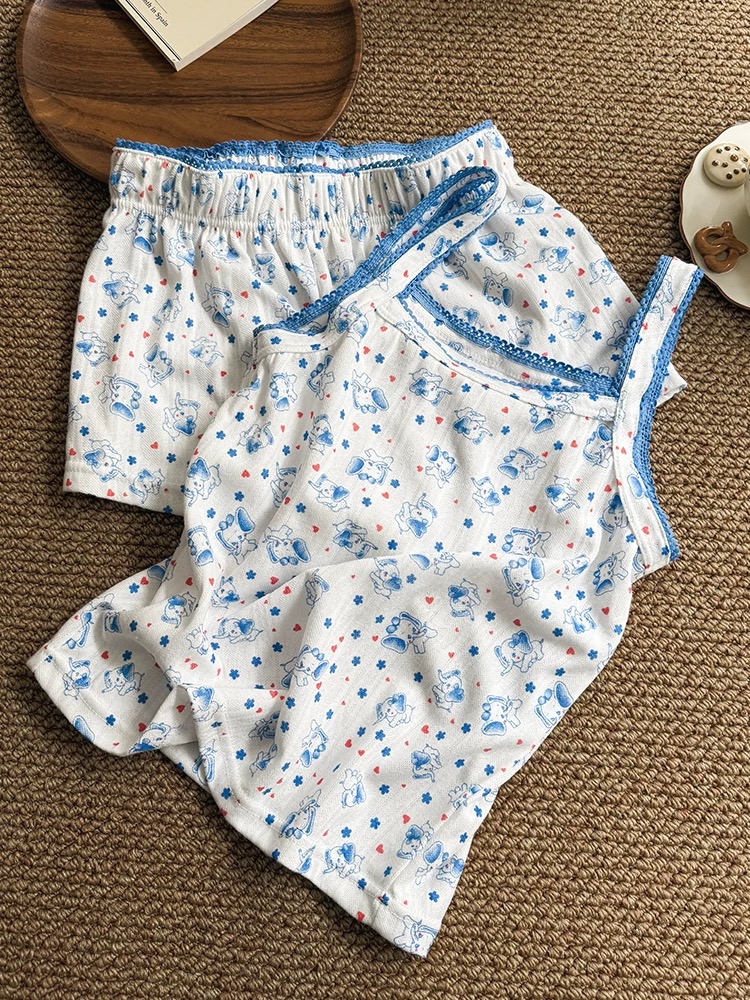 款式:上衣为细肩带吊带款式,下装搭配同色系短裤。裤腰与衣服边缘采用了松紧带+镂空花边的拼接设计,增加了柔美感,穿脱方便且贴合身形